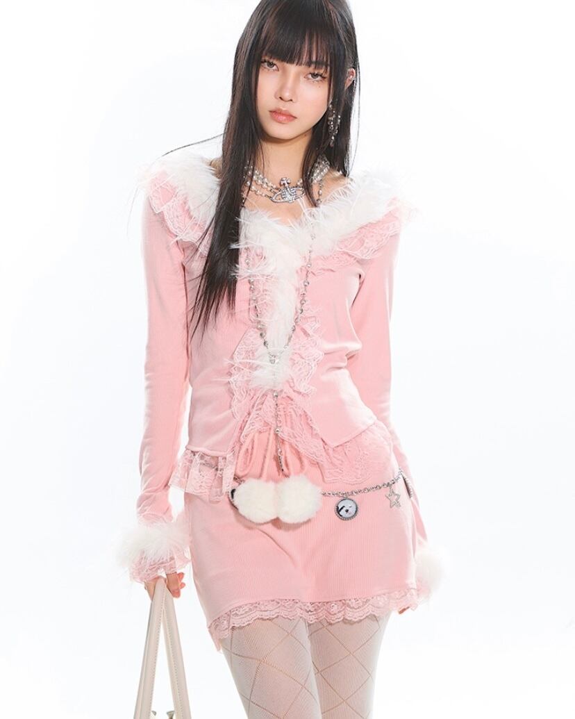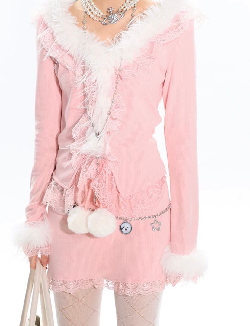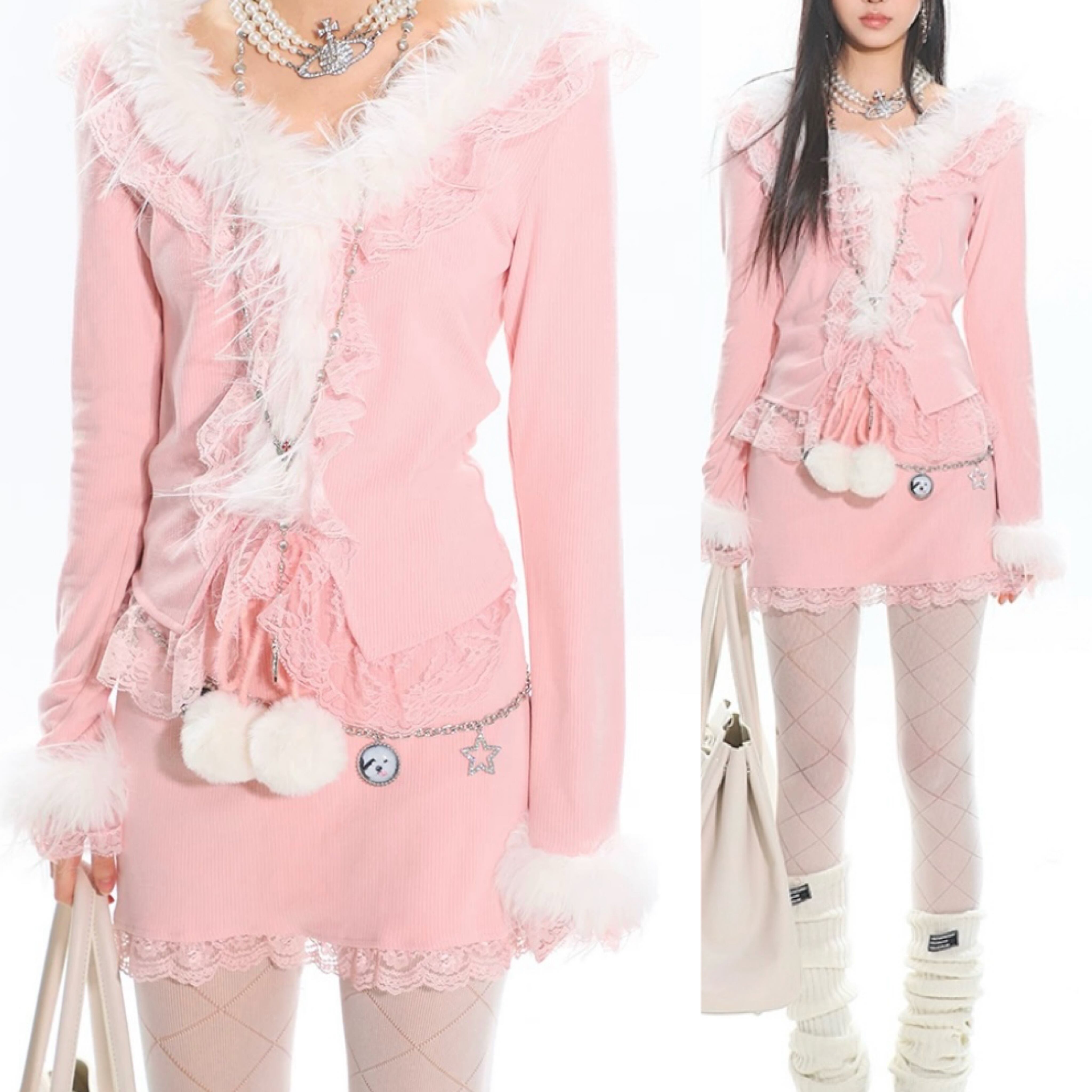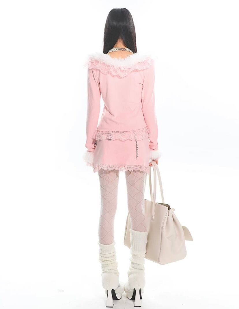 【セットアップ】ピンク ファー 姫 リボン カーディガン ポンポン ミニスカートスカー 原宿 ロリータ ツーピース スーツ