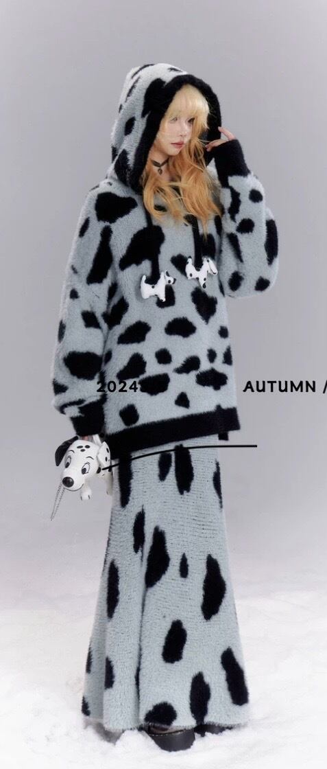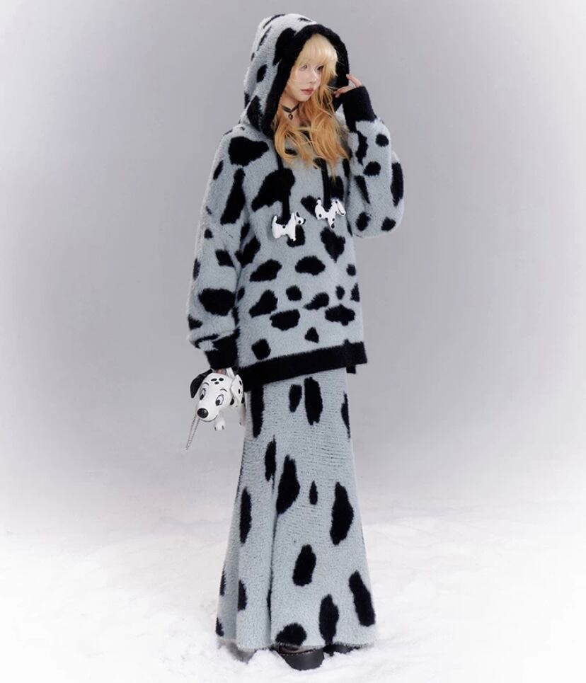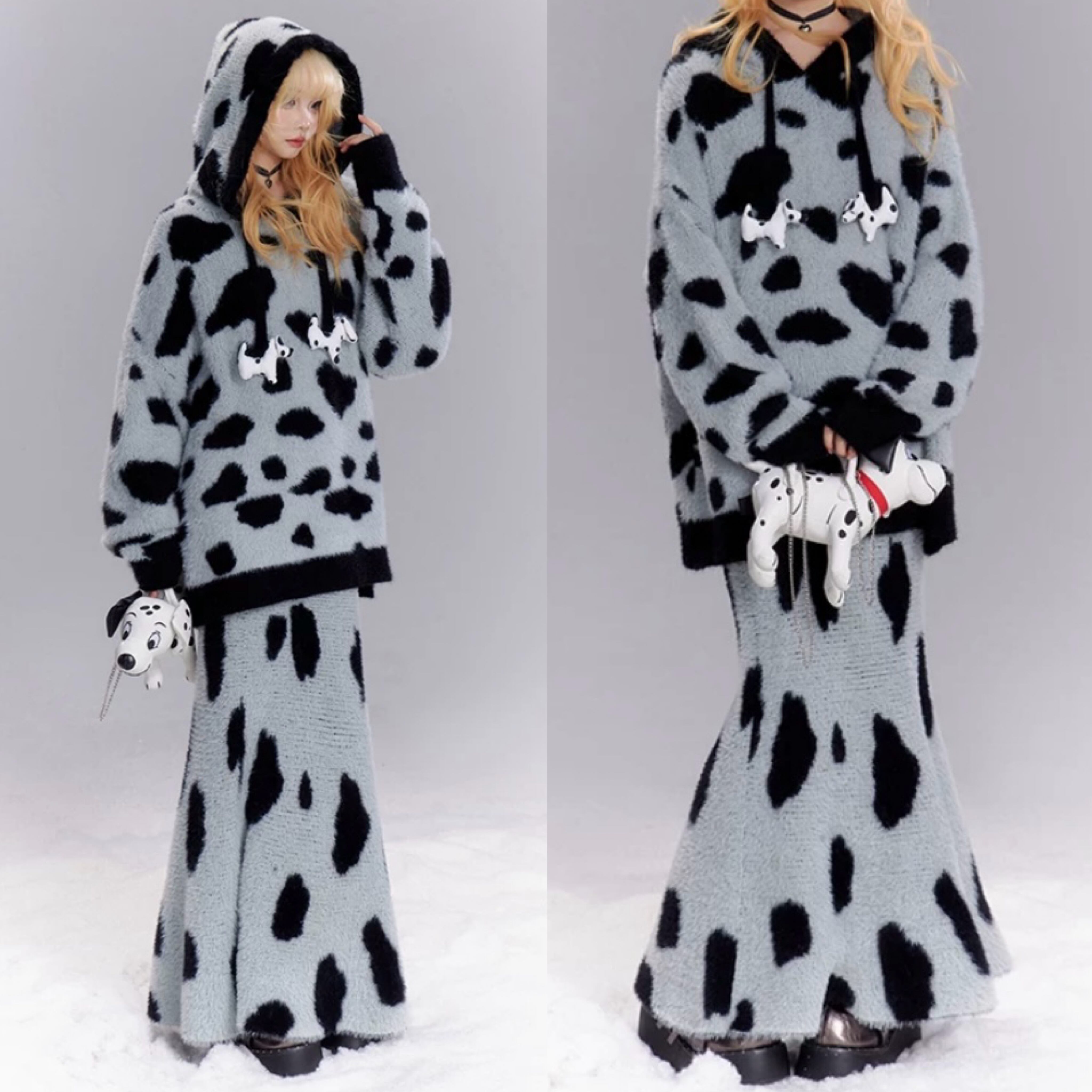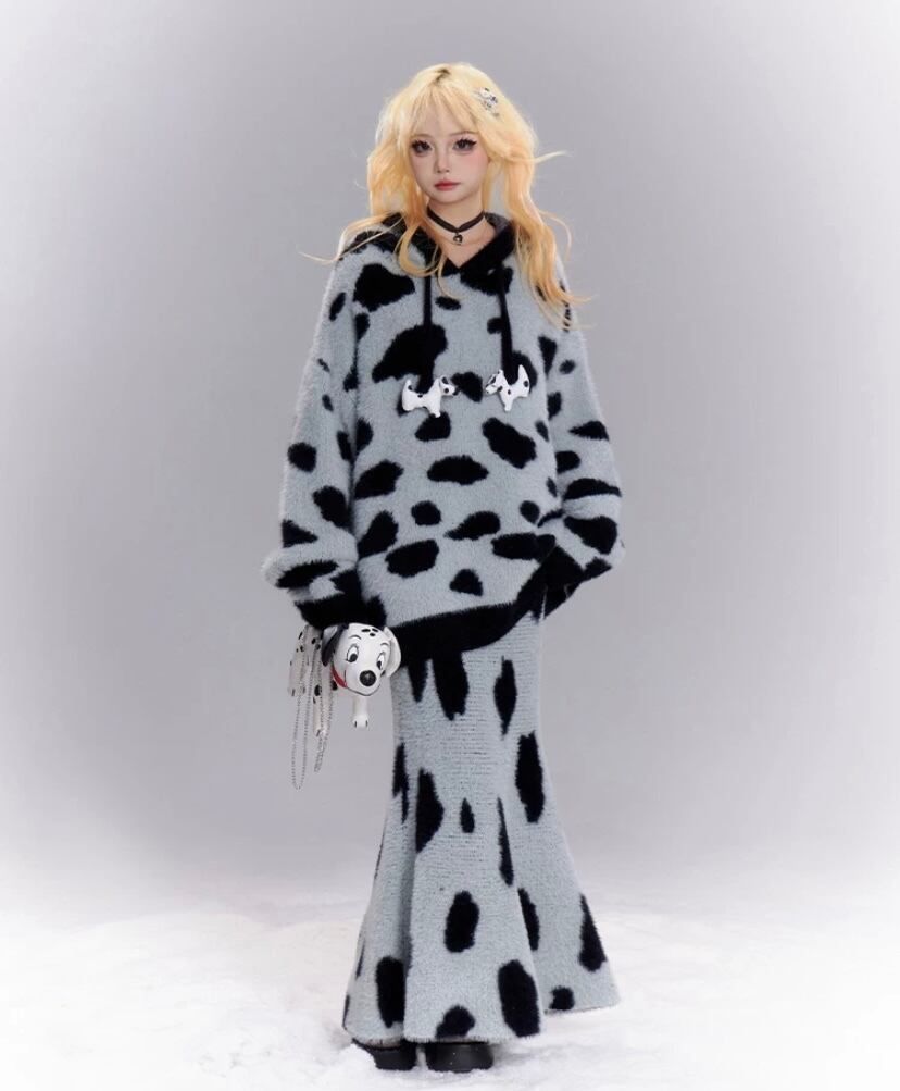 【セットアップ】マーメイドスカート ボトムト グレー ダルメシアン 豹柄 水玉 パーカー セーター マキシスカート ボトムス かわいい ツーピース ロングスカートスカート 原宿 カーディガン