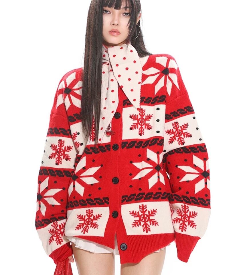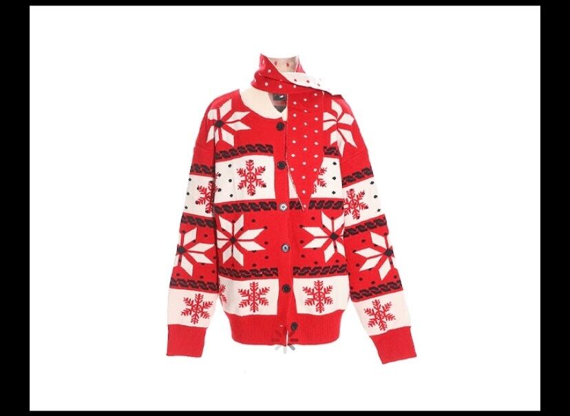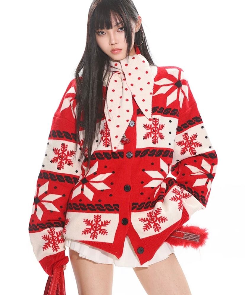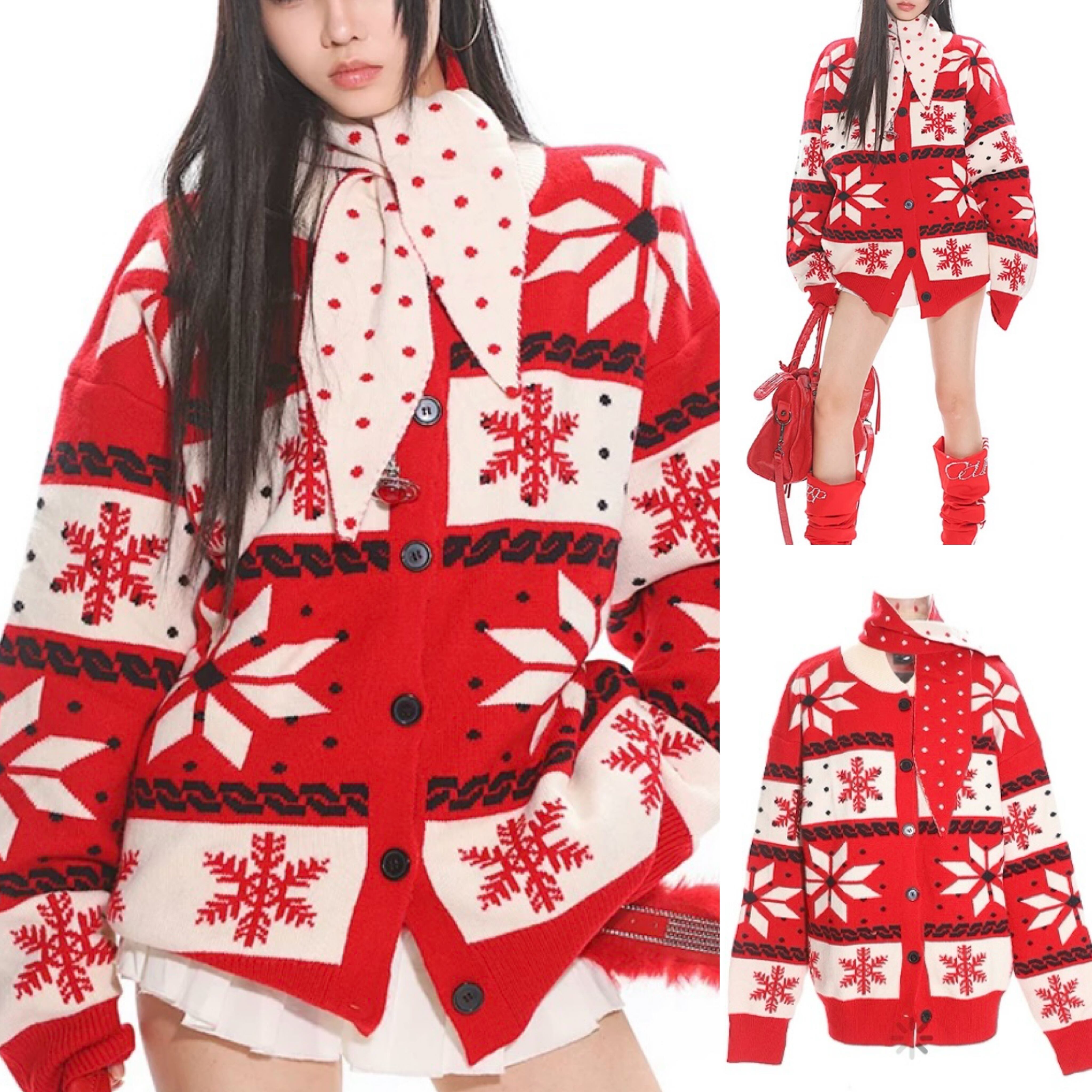 【マフラー付き】ジャケット セーター アウター オフショルダー Y2K ギャル スウェット ヒップホップ 原宿 クラブ 夜遊び ダンス トレーナー ファー カジュアル ストリート セクシー トップス トレーナー パーカー ブラス ニット コート エスニック ボーダー アジアン 雪柄 結晶 水玉 ドット 赤 白
