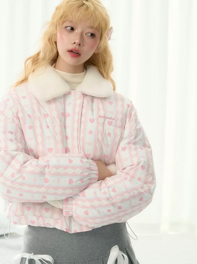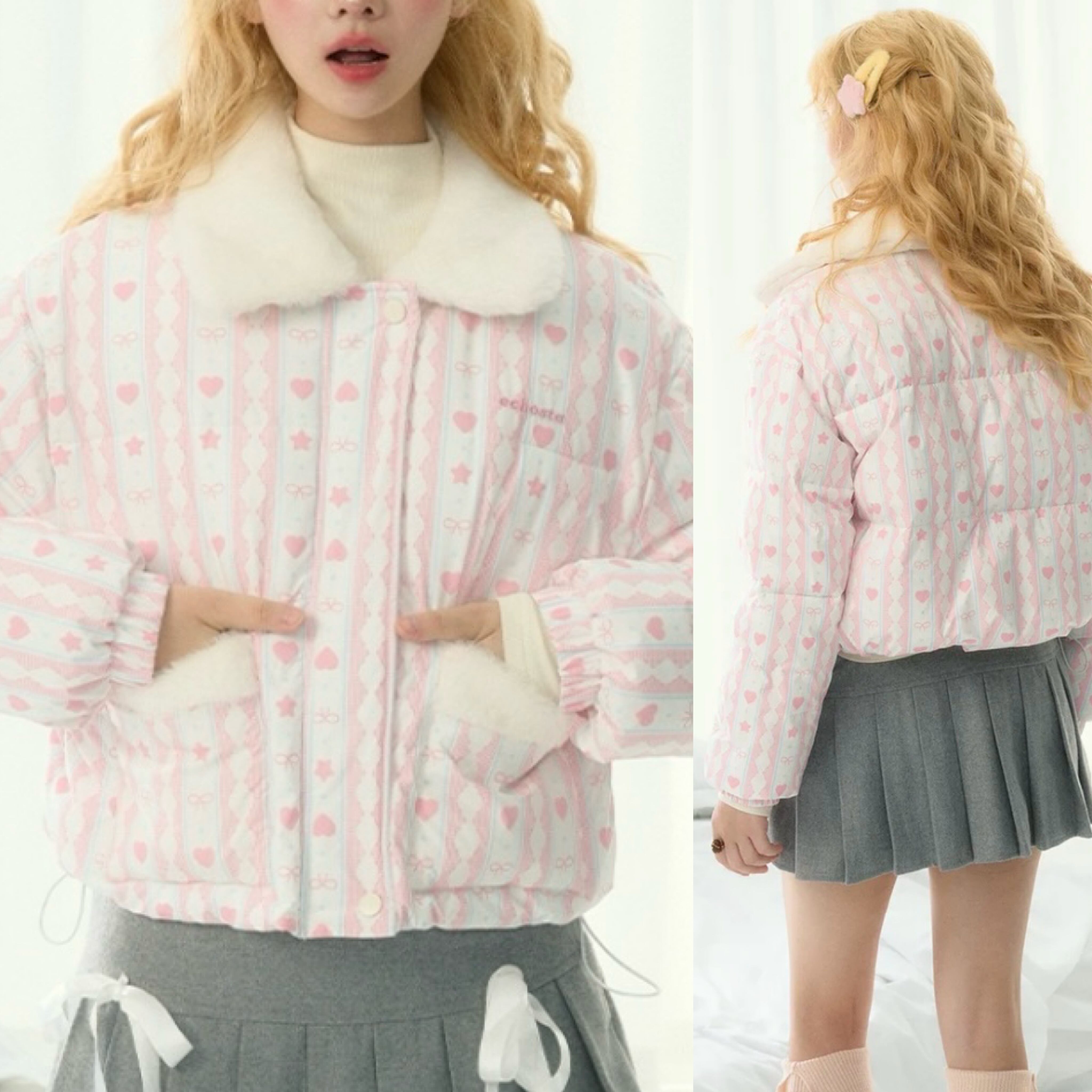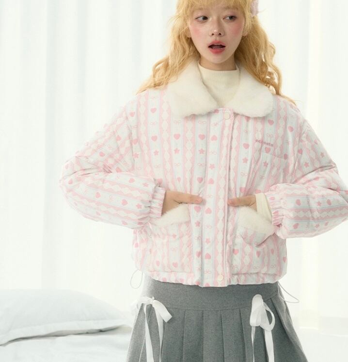 ピンク ボーダー ダウン、コート ジャケット、アウター チェック ハート ガーリー、原宿 丸襟 かわいい カーディガン、ジャケット ブルゾン カジュアル