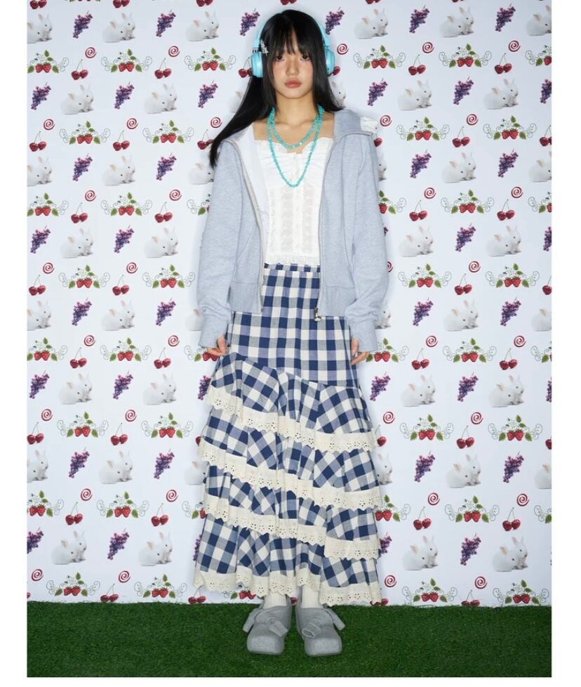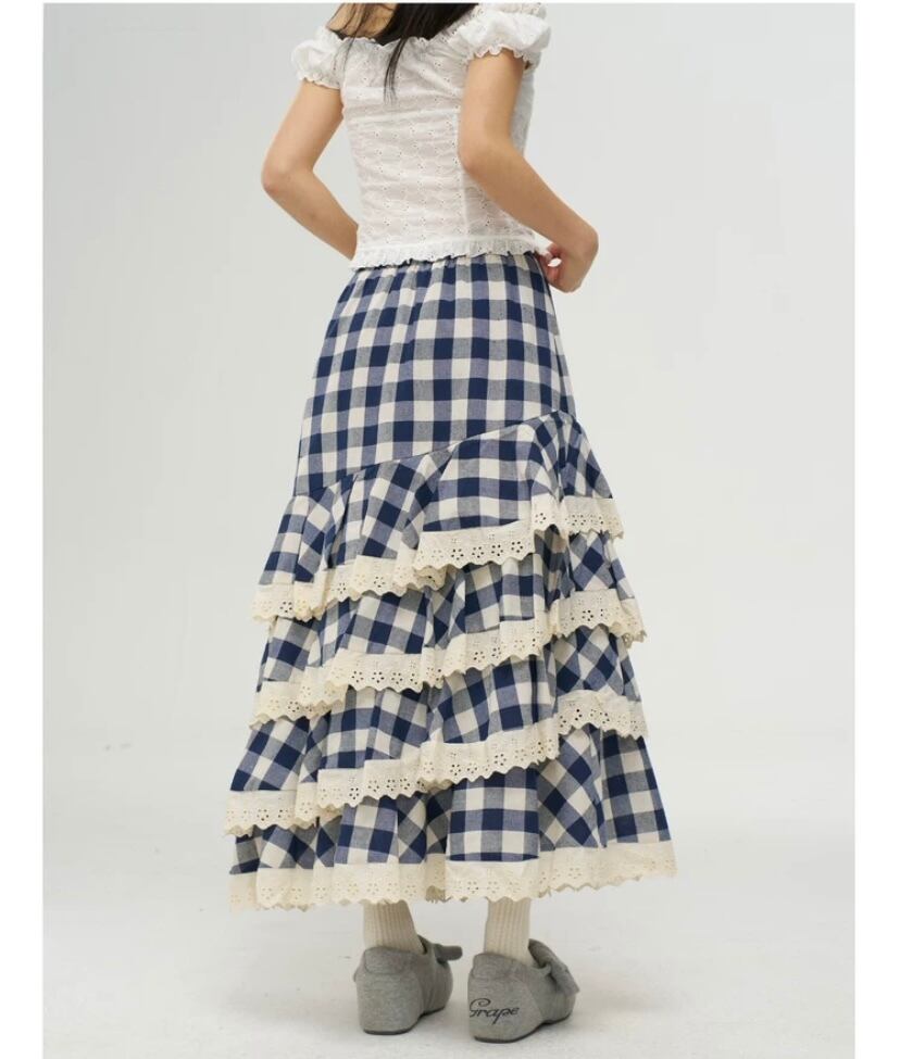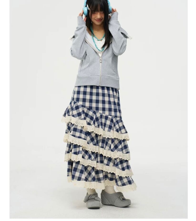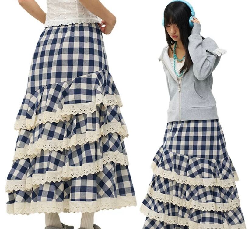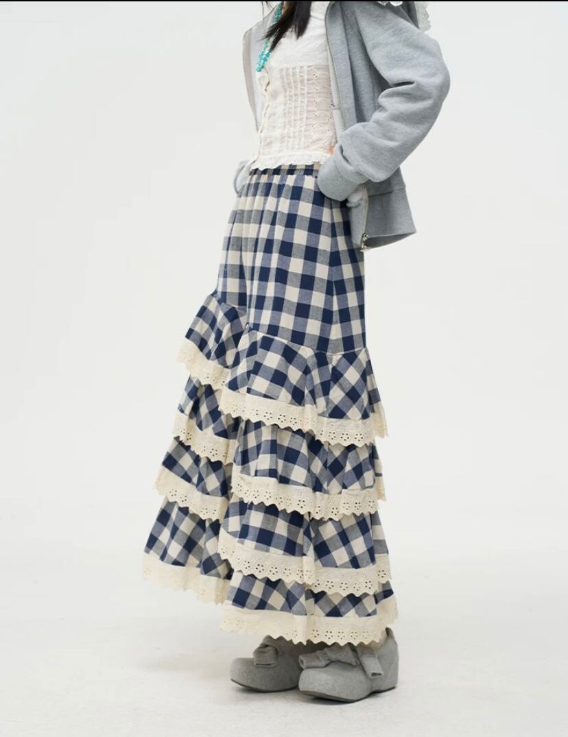 ネイビー チェック 白 ボトムス フリル マキシ マーメイド スカート かわいい 原宿 ホワイト ガーリー ギンガムチェック