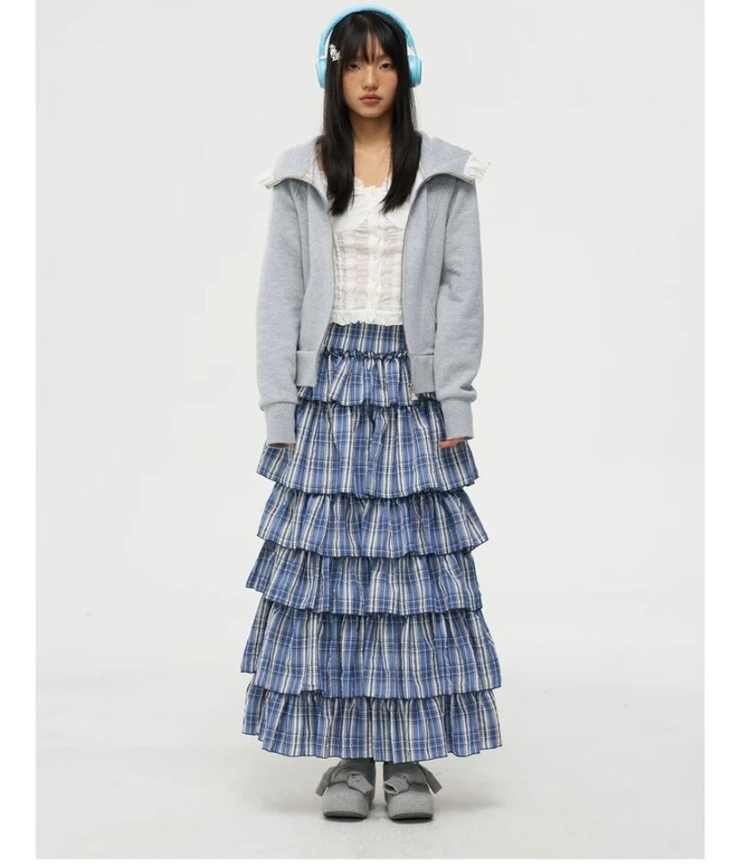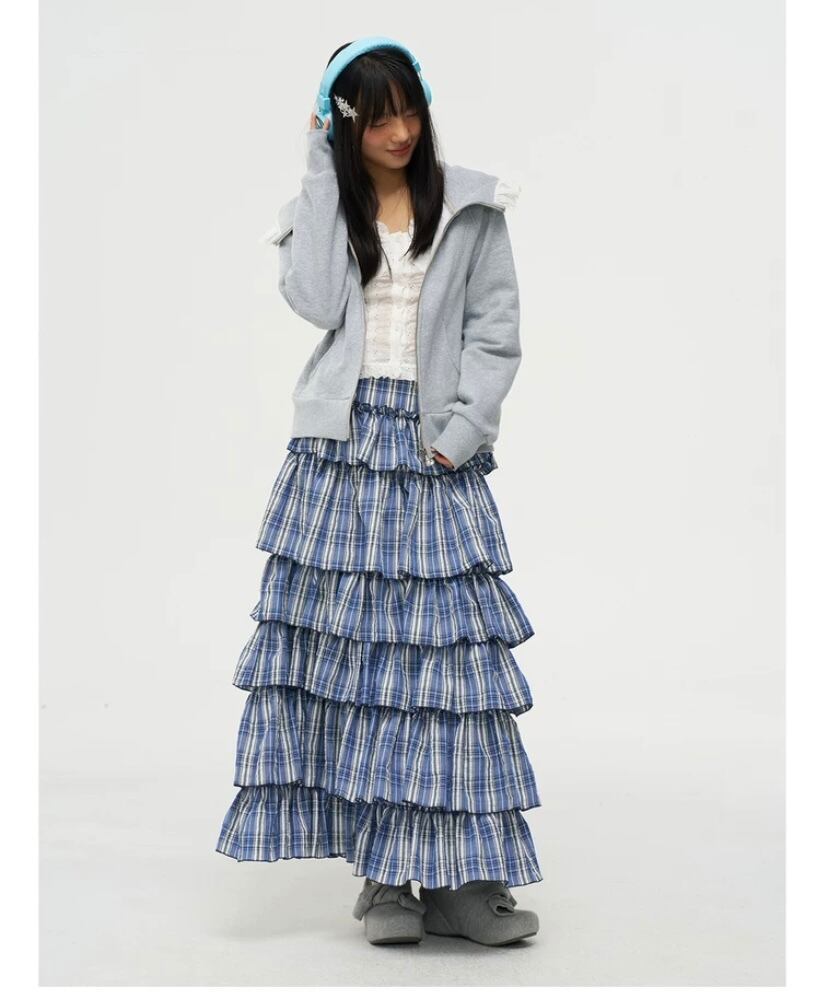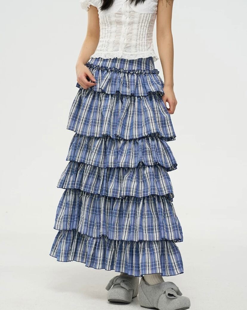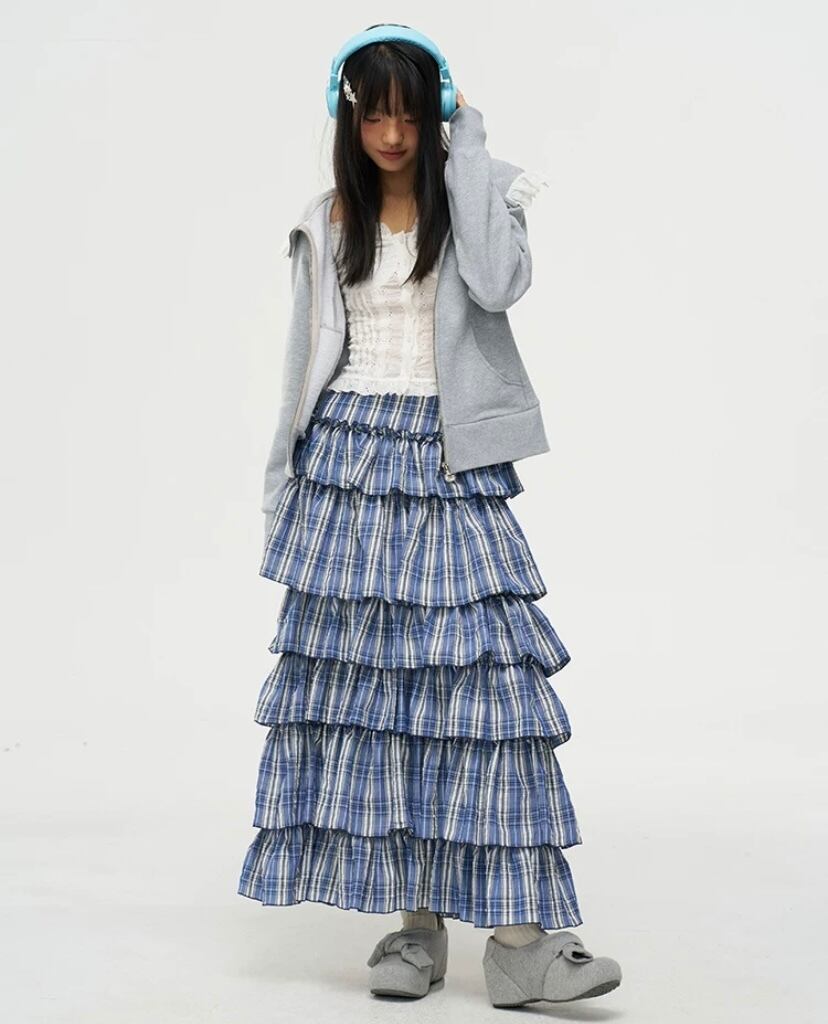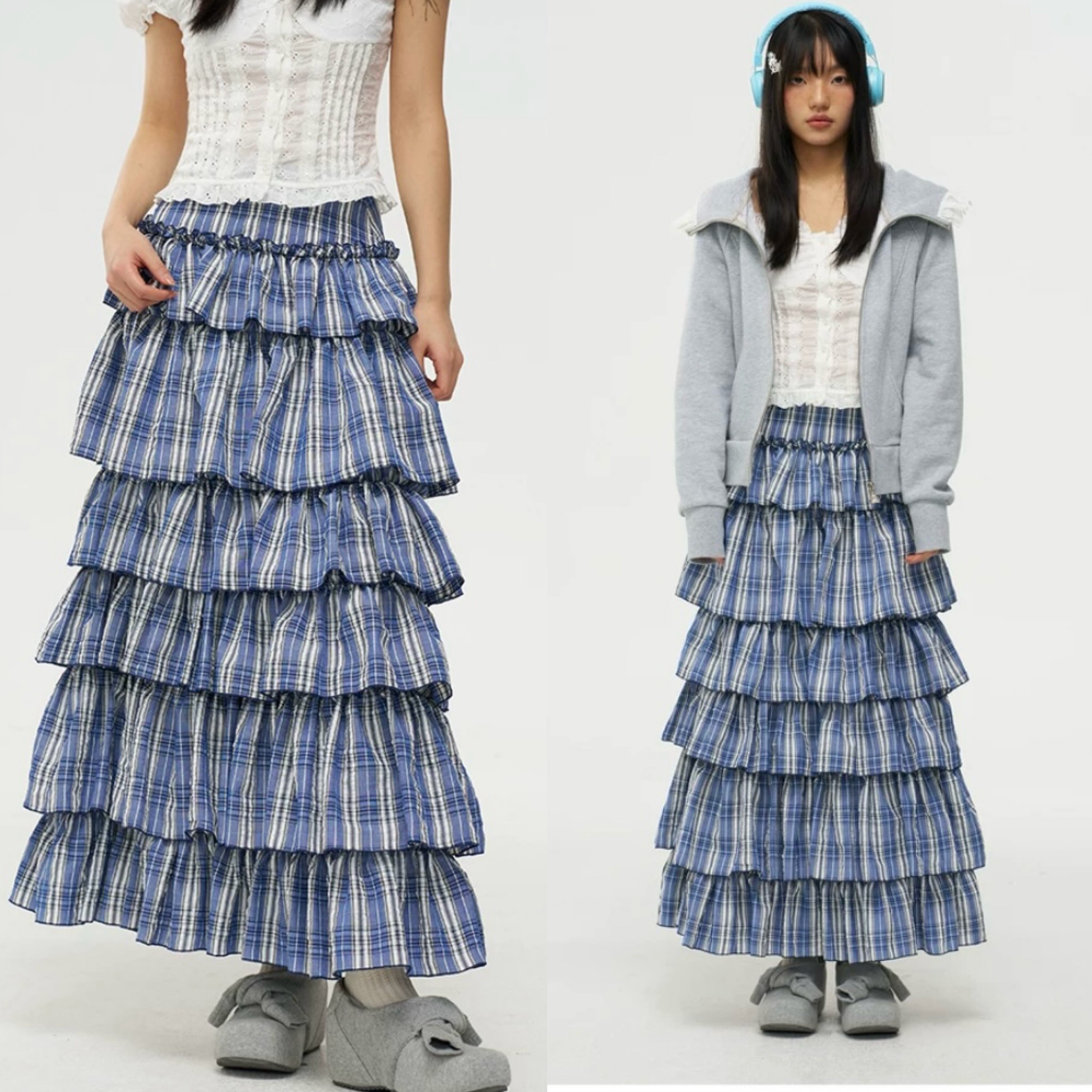 ネイビー チェック、フリル フレアー、ボトムス、マキシ ロング マーメイド、ガーリー、原宿 かわいい