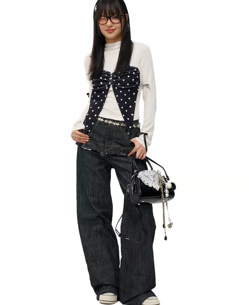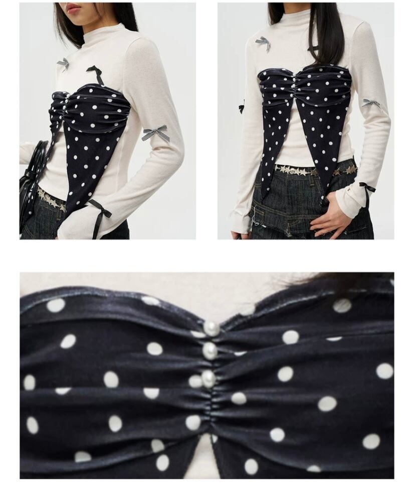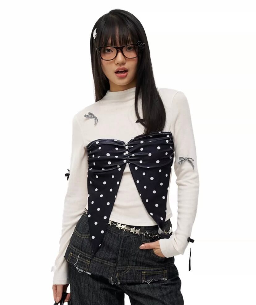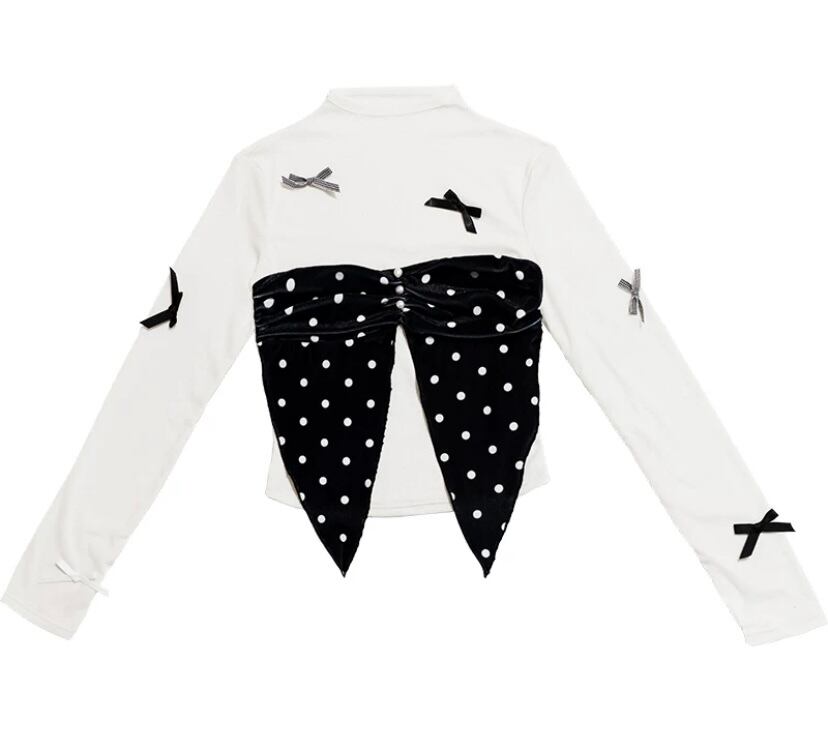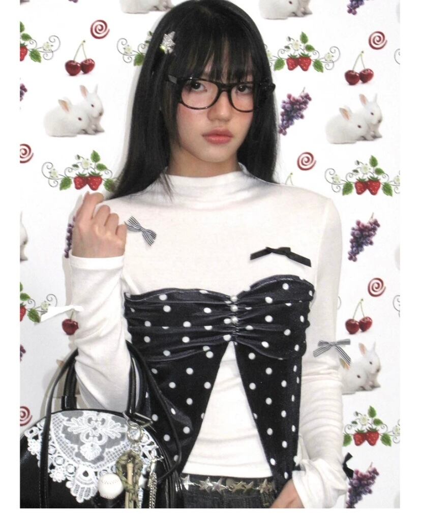 ベアトップ 風 水玉 ドット Tシャツ ブラウス リボン かわいい ガーリー、原宿 ホワイト 黒 白 モノトーン リボン カーディガン