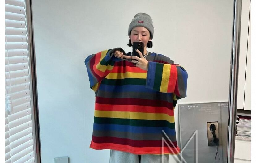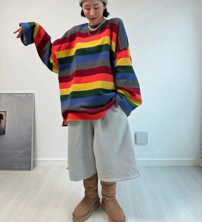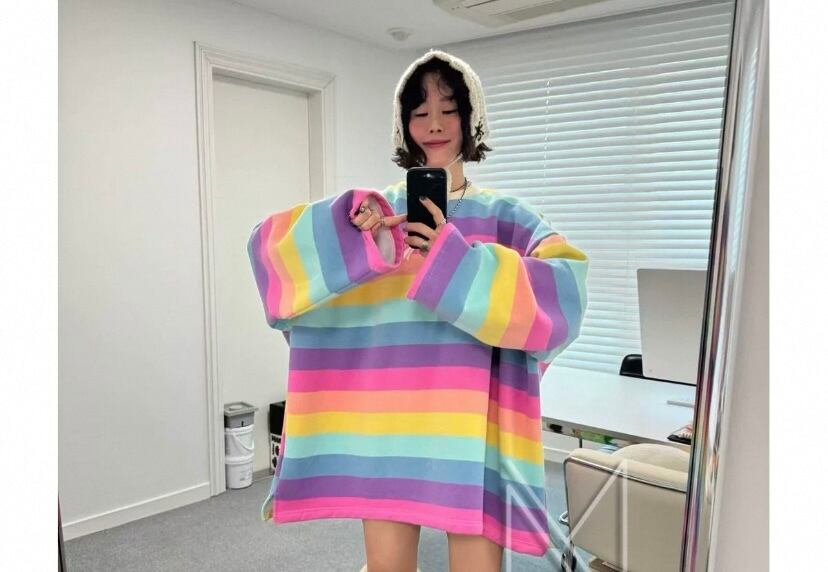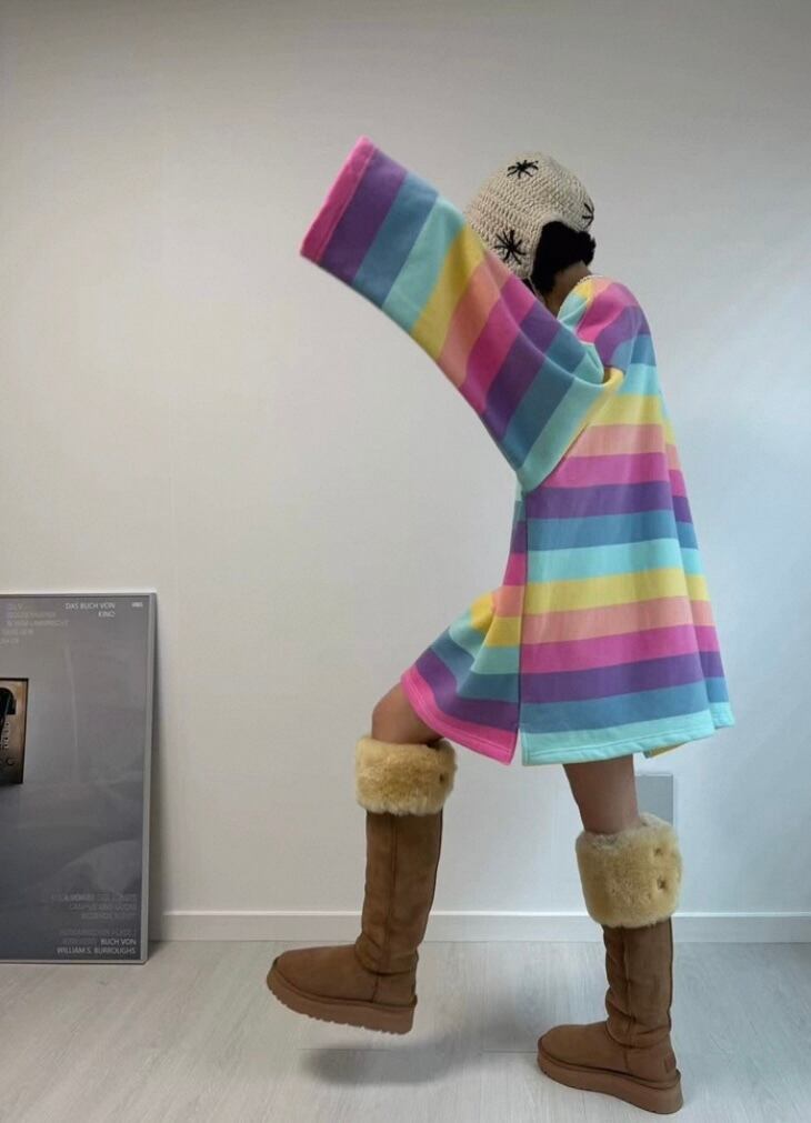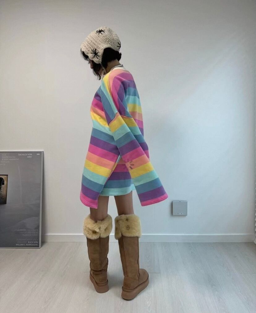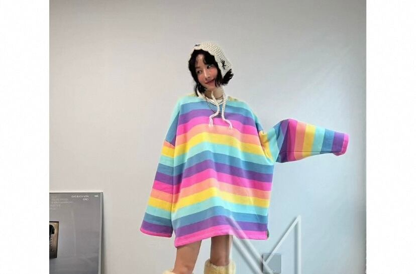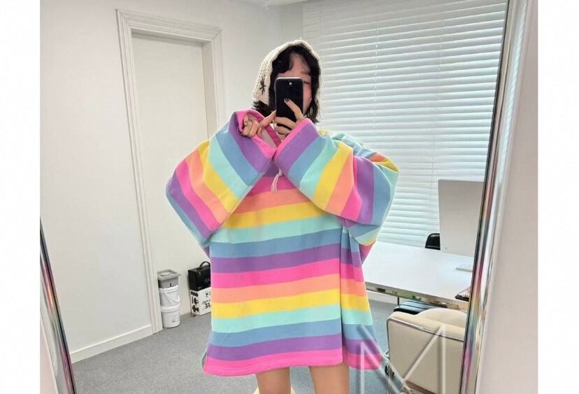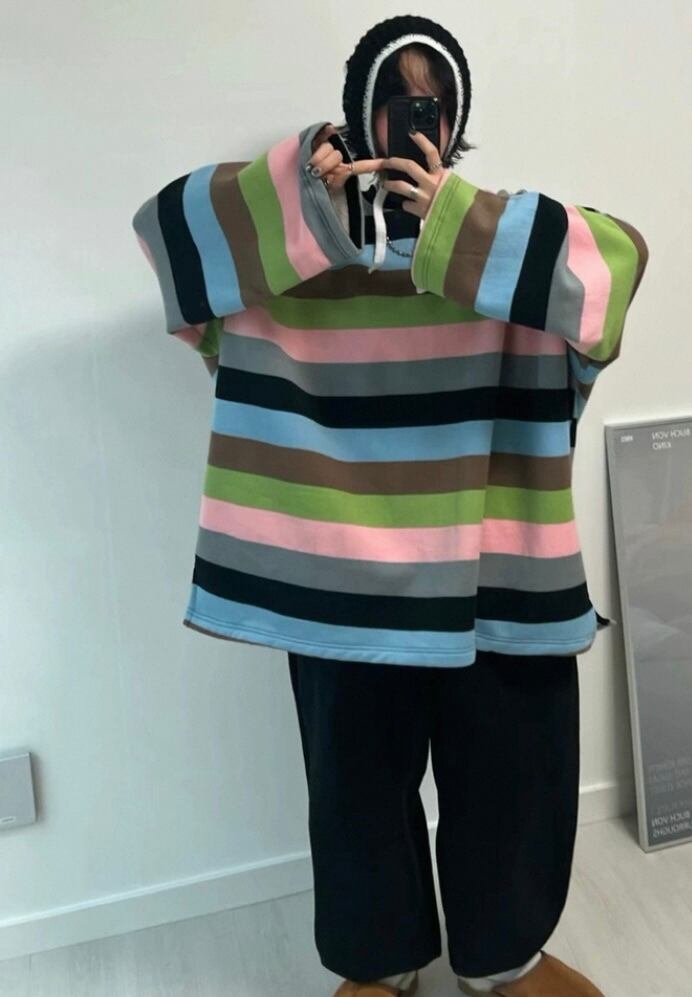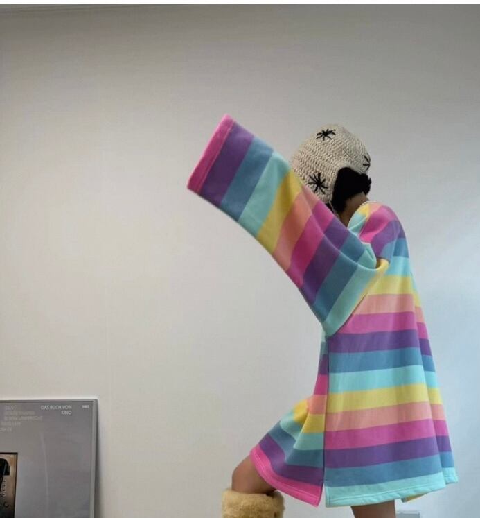 カラフル ピンク 黄色 水色、ネイビー グレー、ボーダー チェック オーバーサイズ、ゆったり トップス、チュニック ワンピース、原宿 カジュアル ストリート ブラウス トレーナー原宿