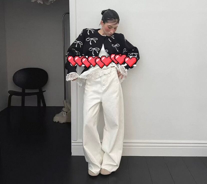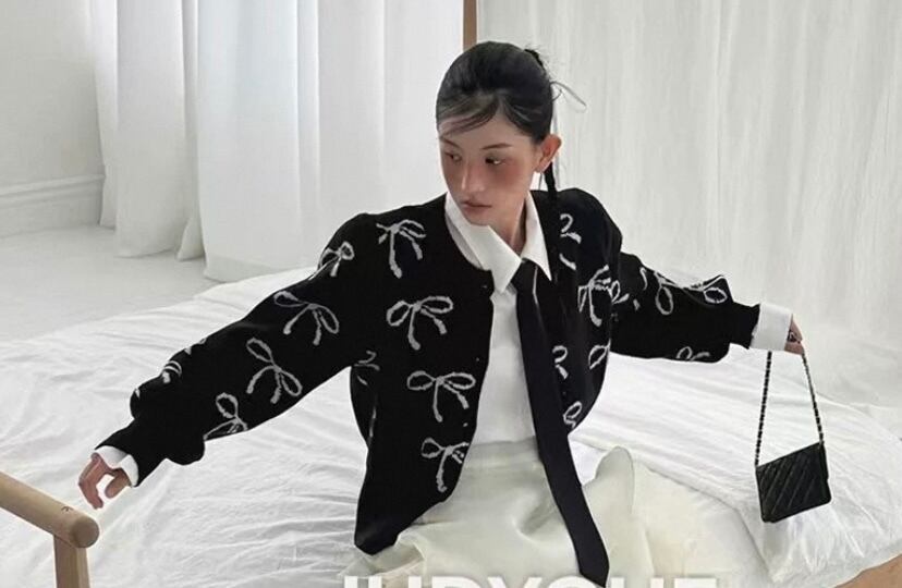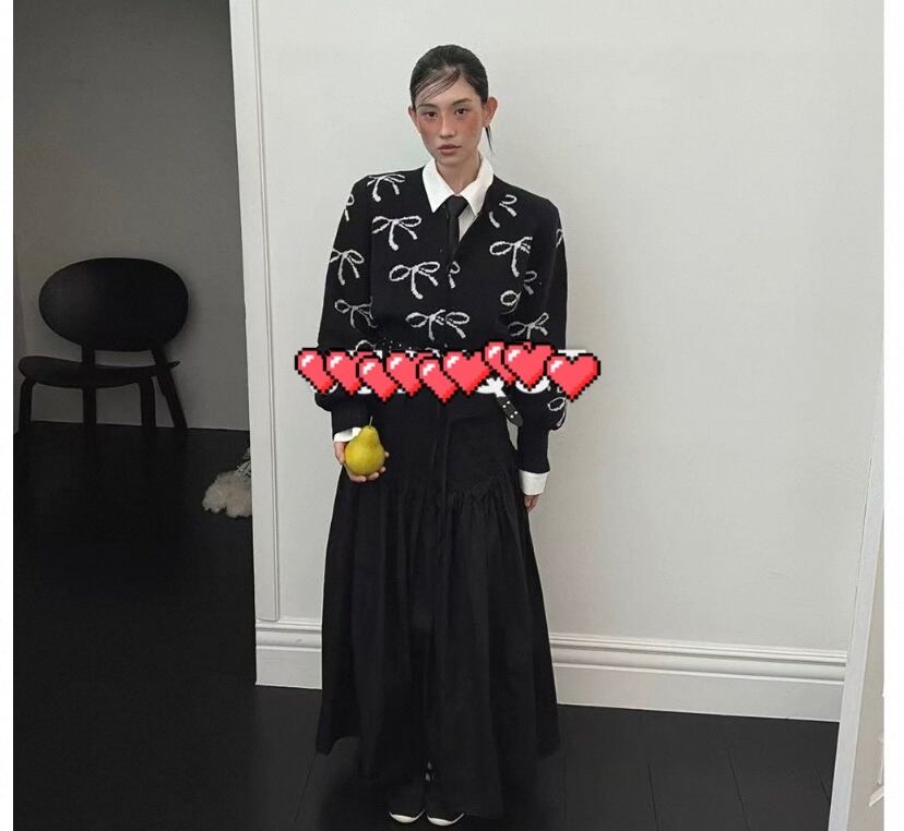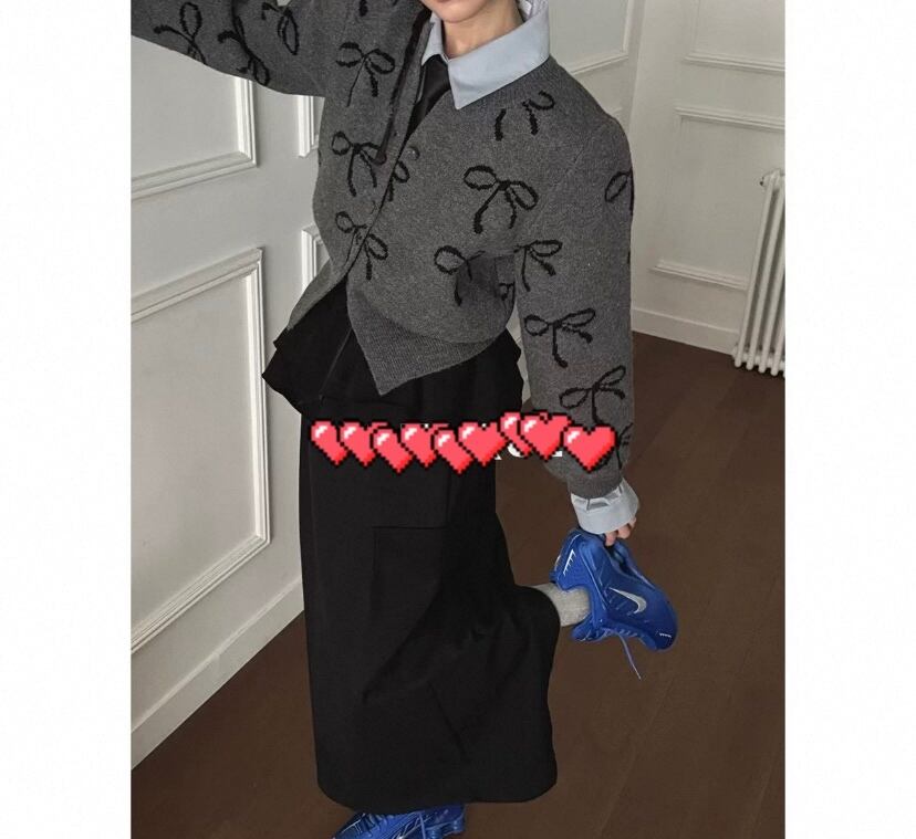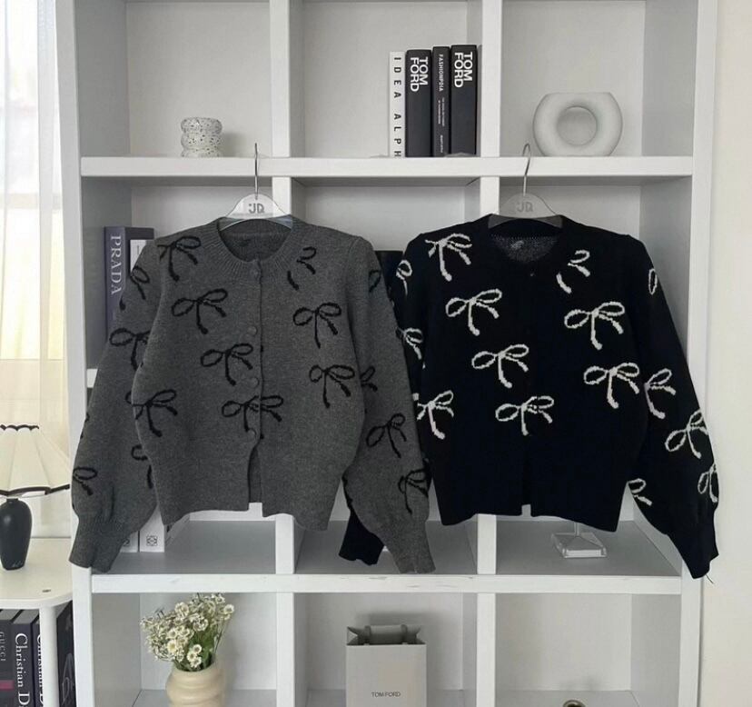 グレー、リボン、黒カーディガン、セーター 原宿 お嬢様、トップス、アウタージャケット、セーター、かわいい デコレーション ニット