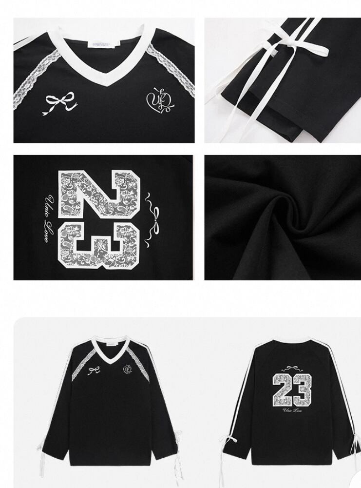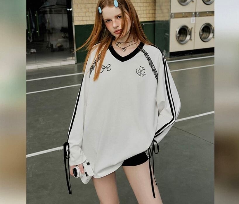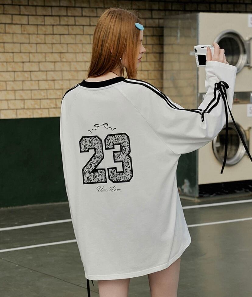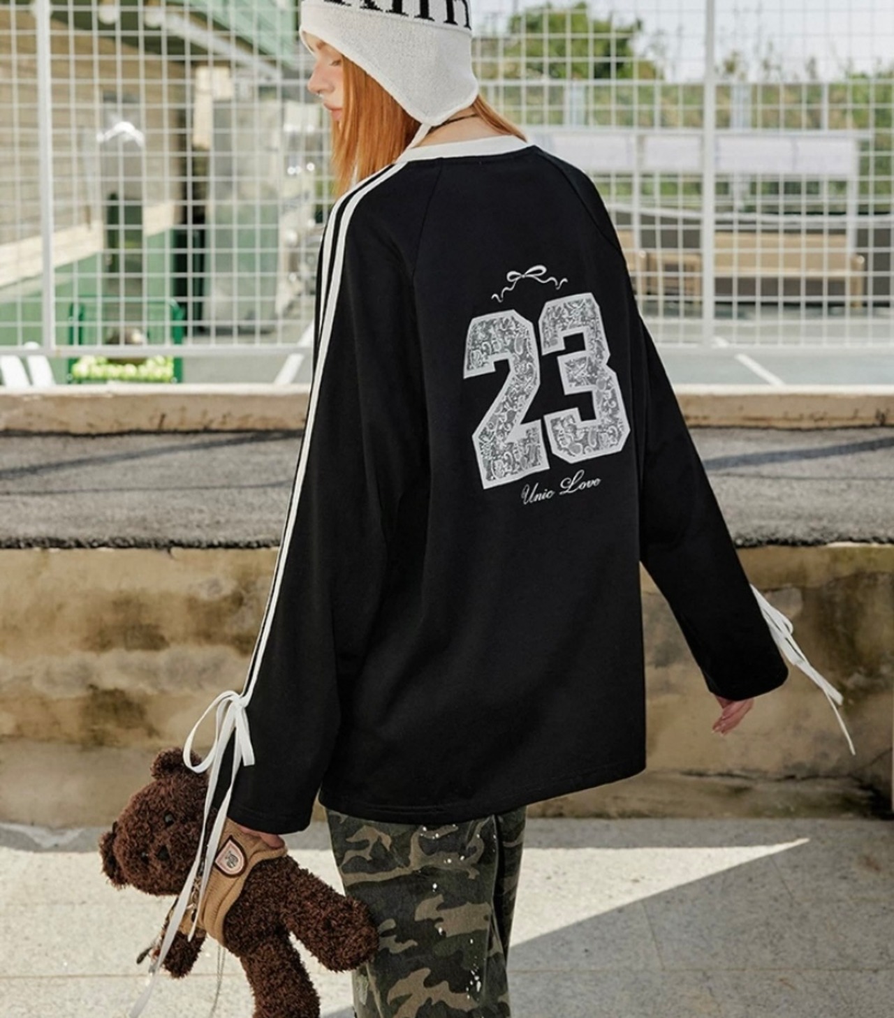 白 黒 リボン、ナンバー、トップス、カジュアル 23 Tシャツ、ブラウス、原宿 ルームウェア スウェット トレーナー ボーダー、シンプル スポーティー