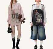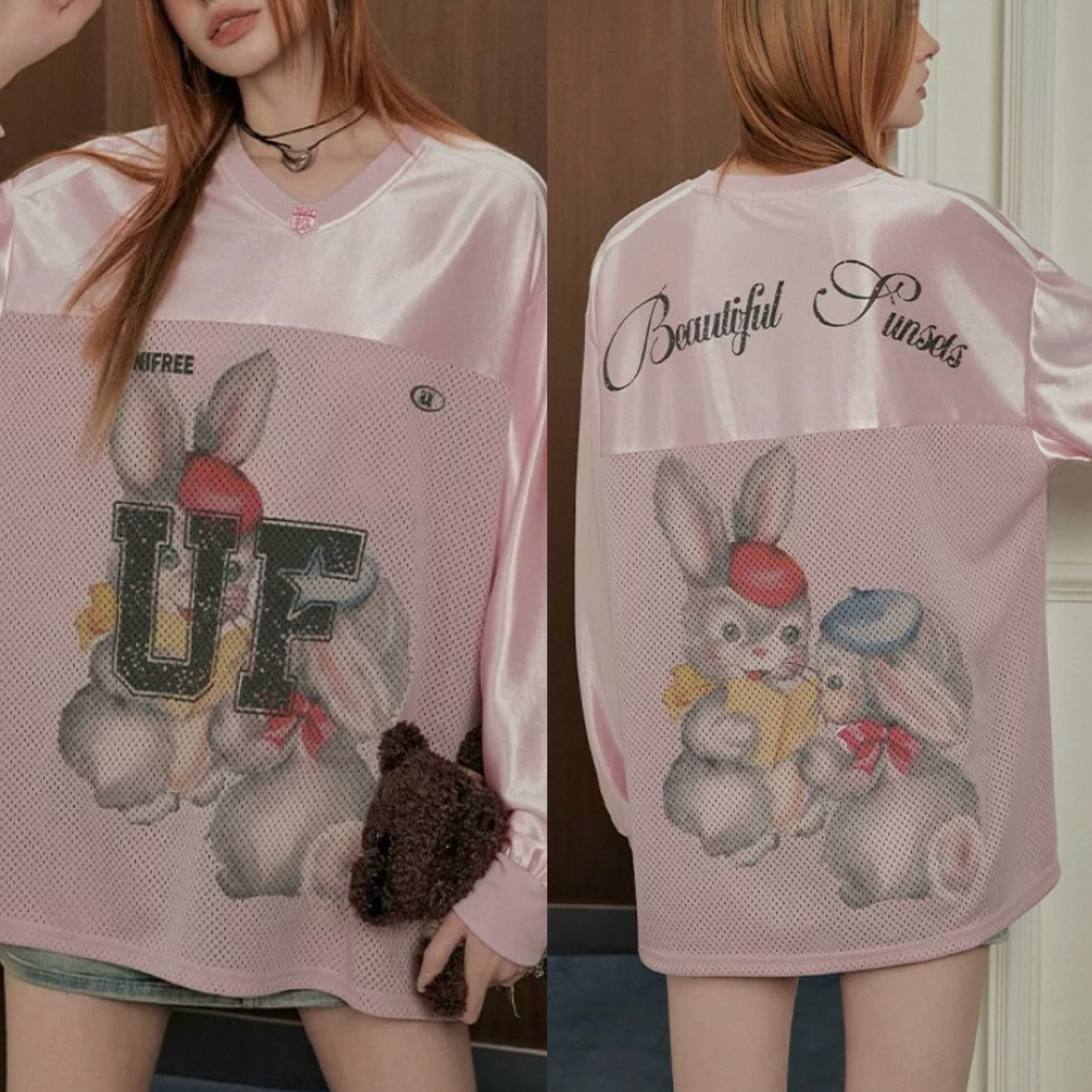 【ピンク】ジャージ スエット、ピンク、うさぎ、猫 かわいい ペット スウェット トップス Tシャツ ロング Tシャツ メッシュ ブラウス 原宿 ストリート カジュアル