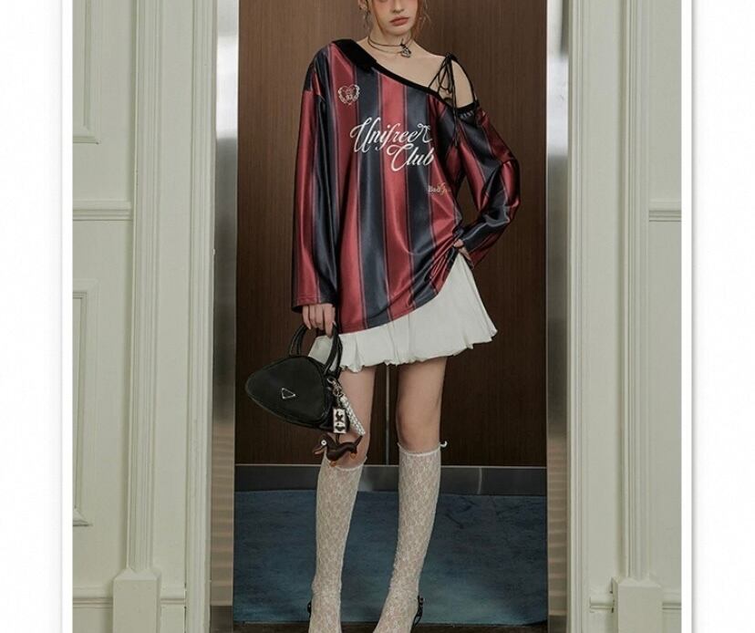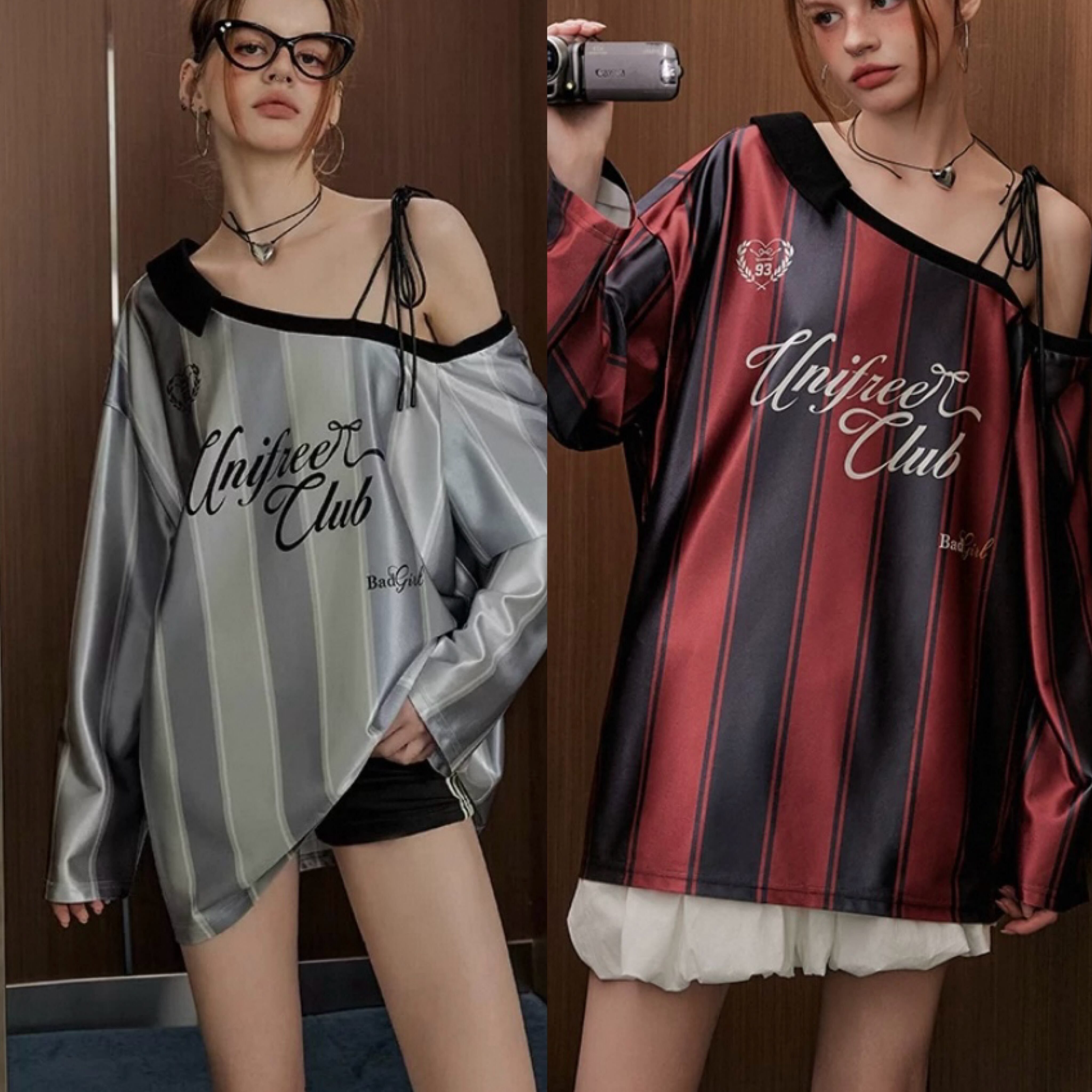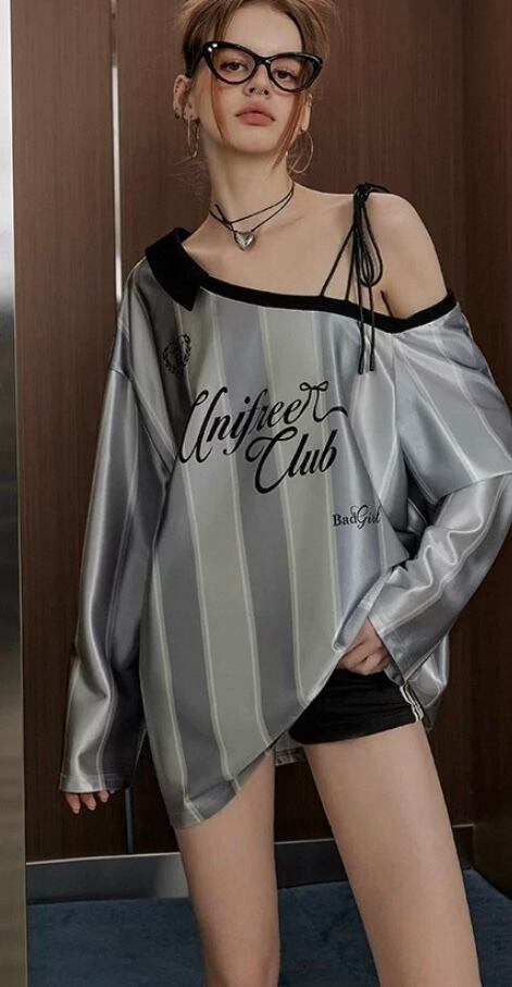 グレー 赤 ボーダー ストライプ オフショルダー リボン トップス ブラウス、スウェット スポーツ サッカー ユニホーム カジュアル ロング Tシャツ