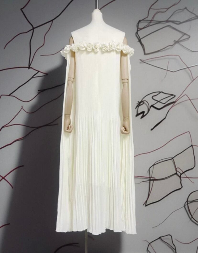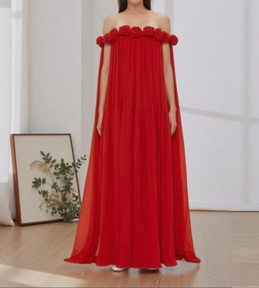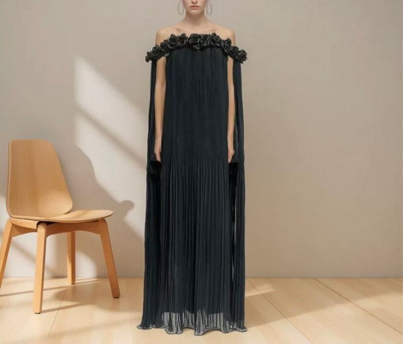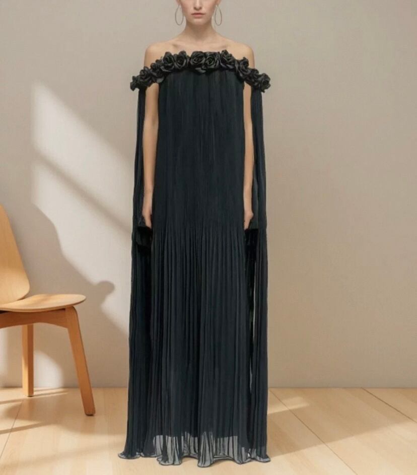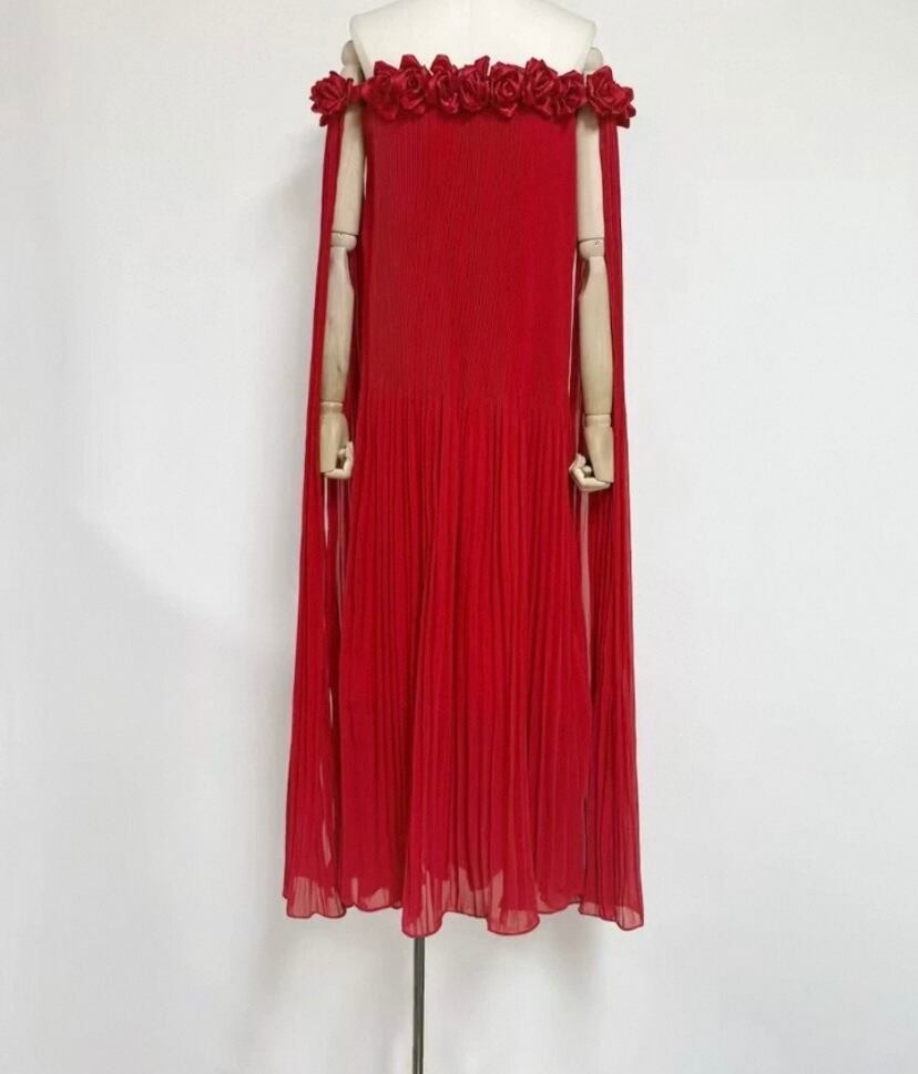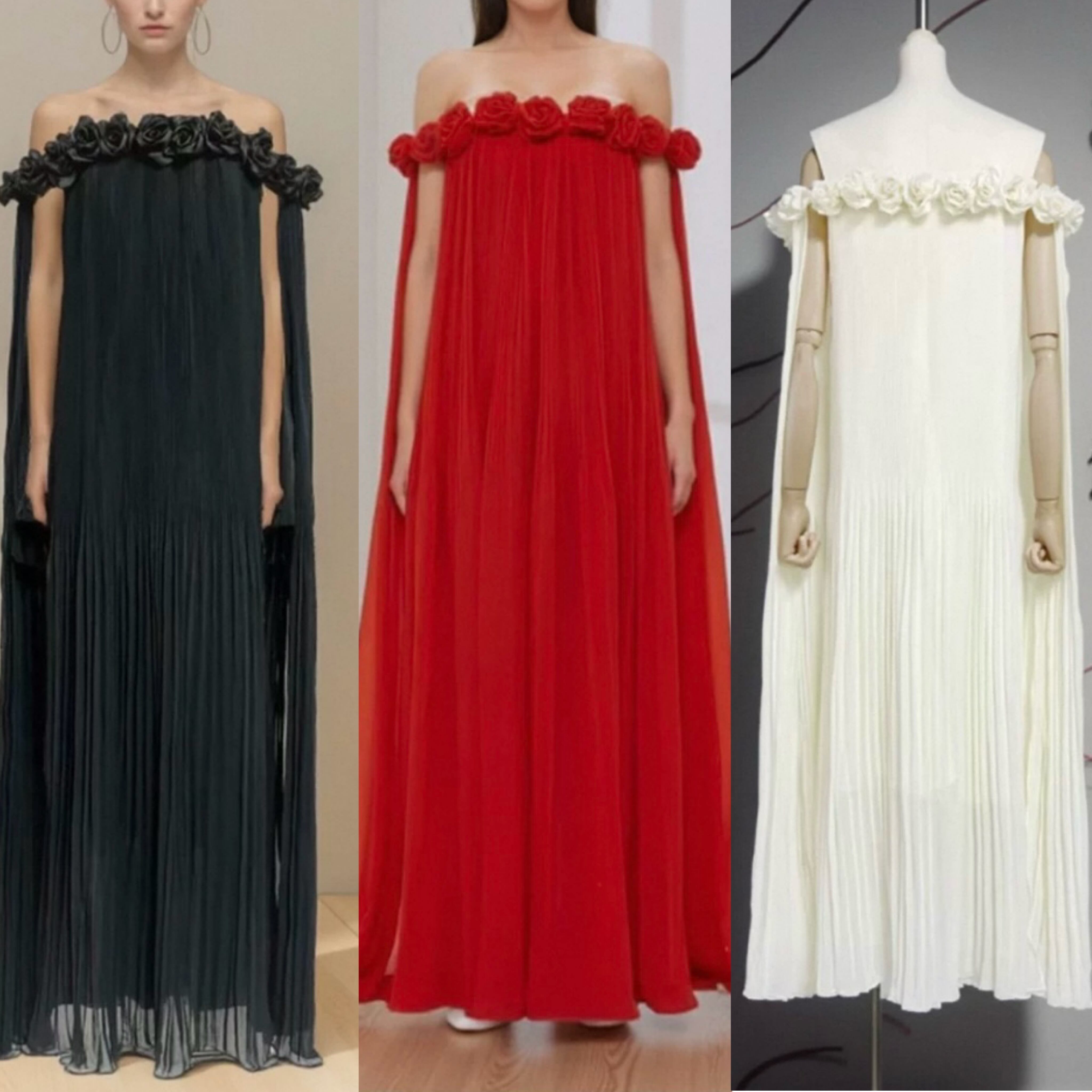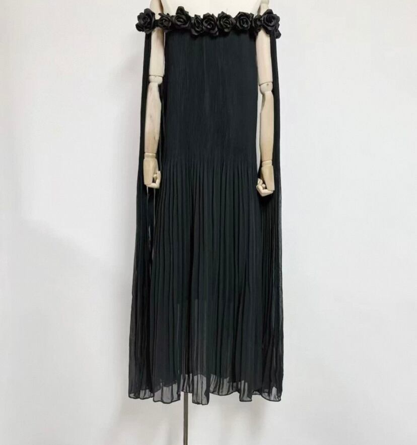 オフショルダー 薔薇 フラワー エレガント ワンピース、プリーツ スカート ドレス ,赤 黒 白 デコルテ XL ワンピース ローズ 銀座 パーティー