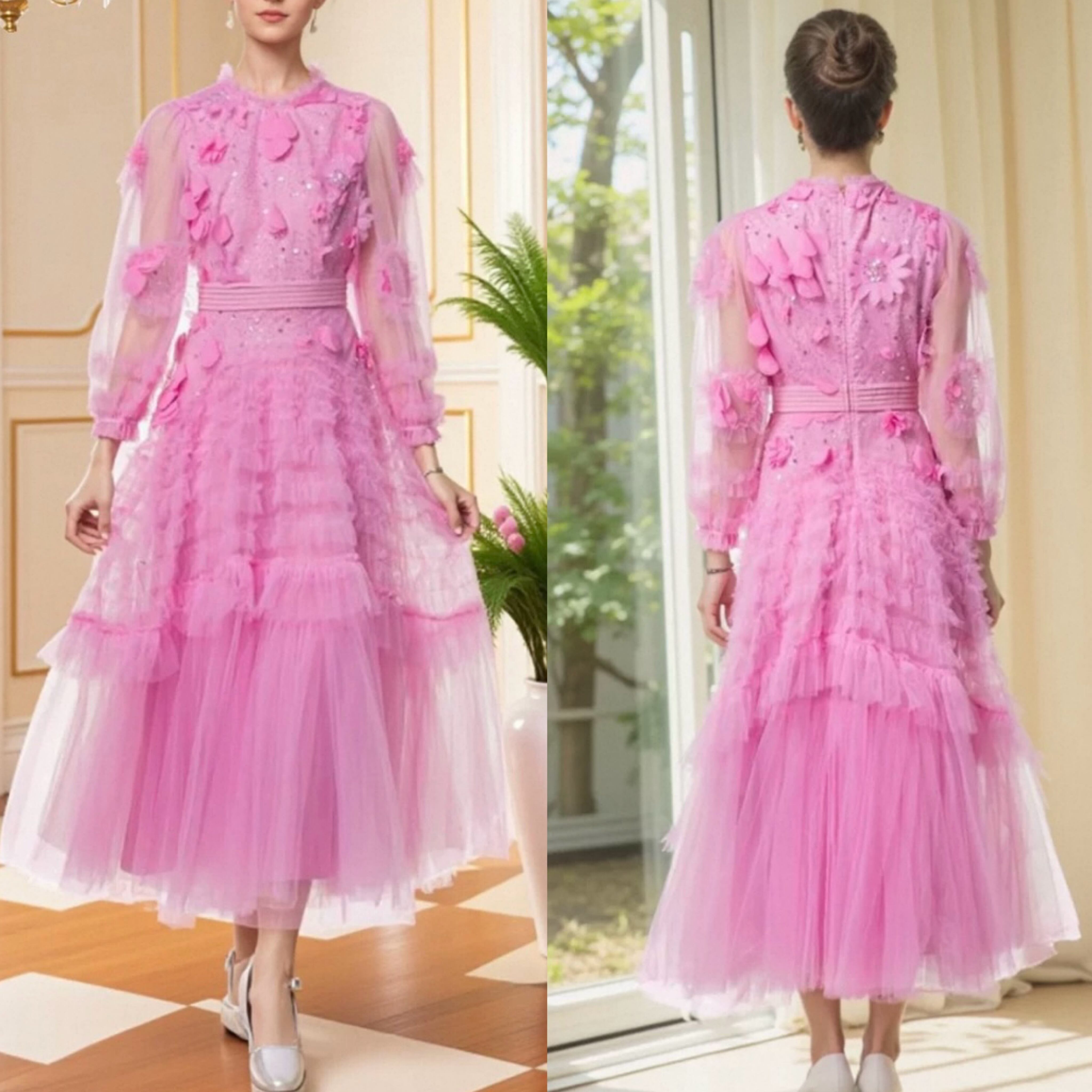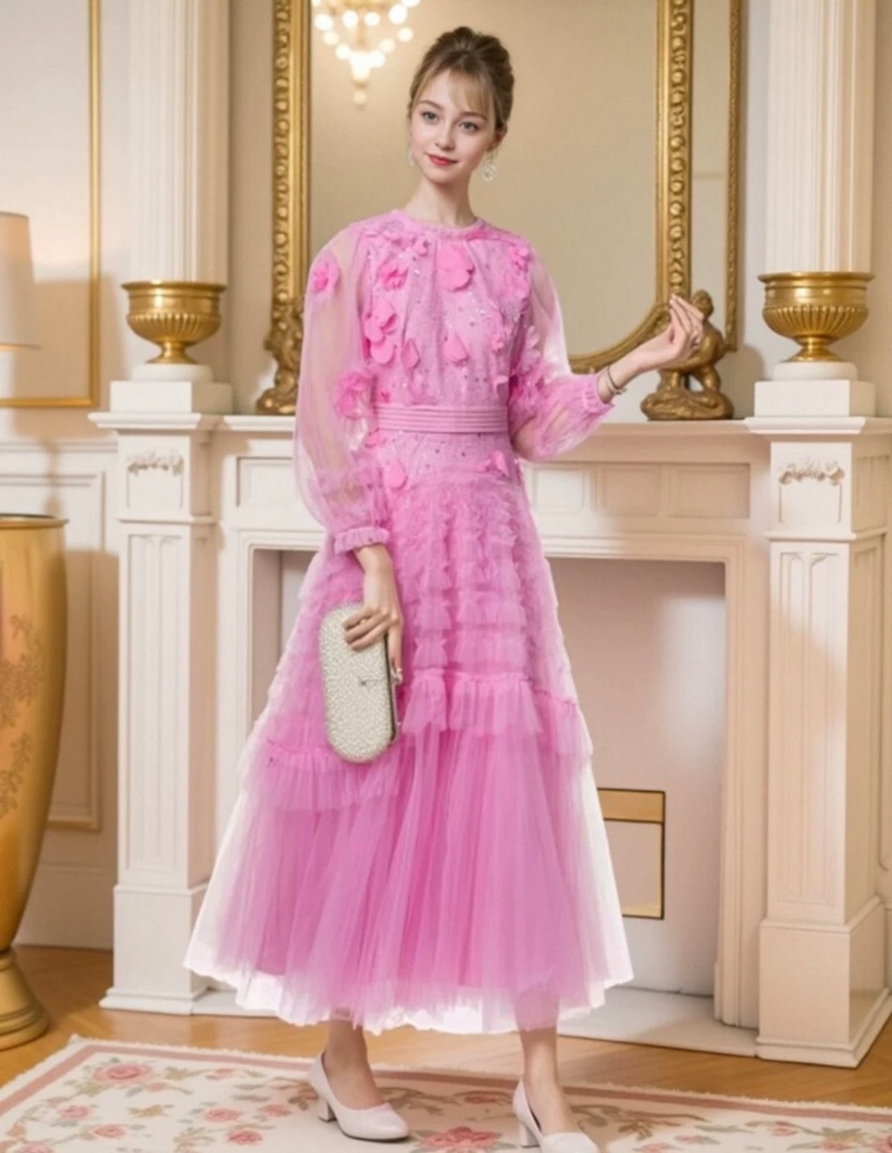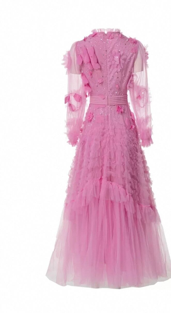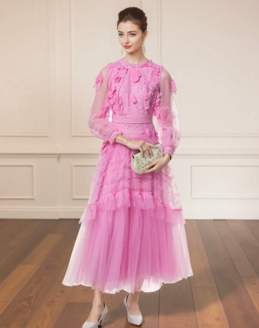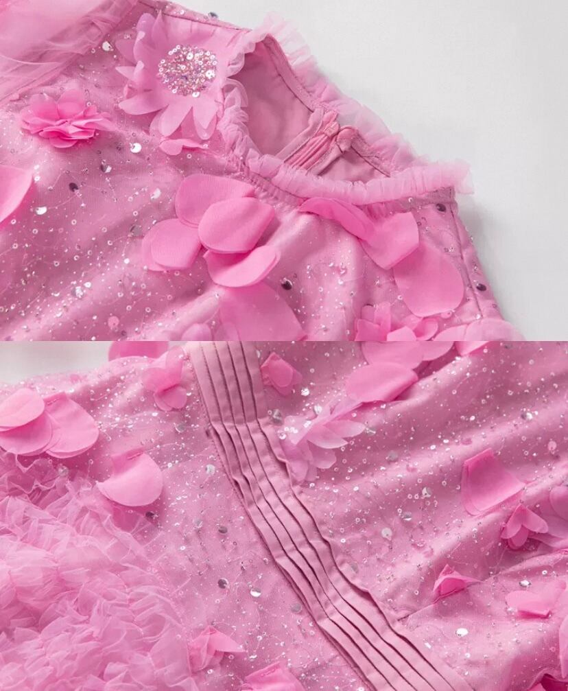 ピンク 花柄、フラワー エレガント、XL キラキラ スパンコール、ラメ ワンピース、ドレス、エレガント ゴージャス、銀座 発表会、 デコレーション