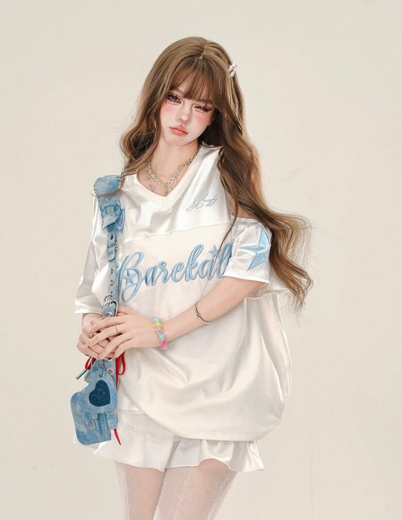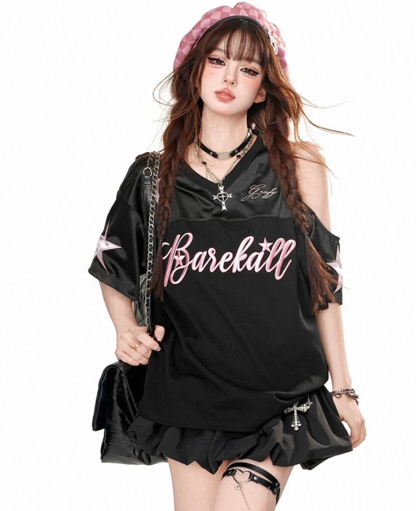 オフショルダー、リボン Tシャツ、ブラウス、トップス、半袖、ピンク、黒ジャージスエット 白 水色 原宿 カジュアル かわいい