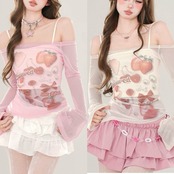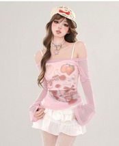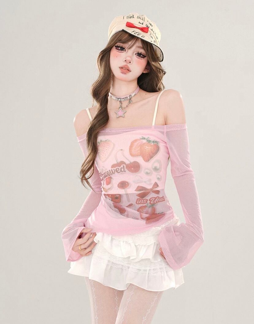 白 ピンク かわいい ハート いちご リボン 赤 シースルー トップス ブラウス Tシャツ シースルー キャミソール かわいい 原宿 ホワイト 姫 ロリータ