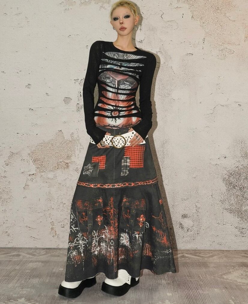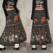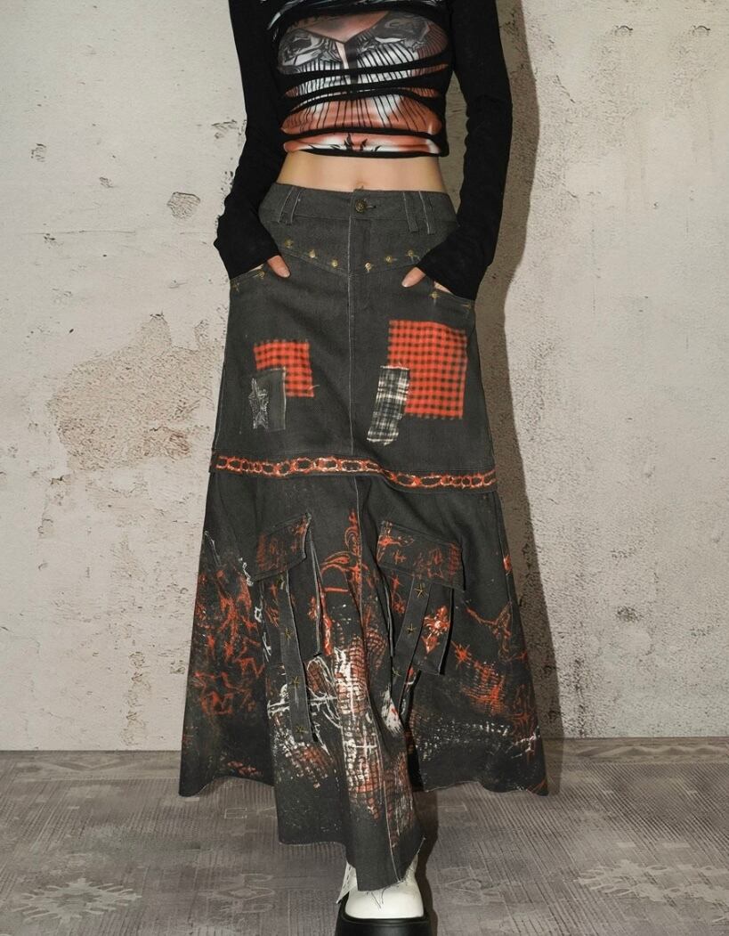 エスニック、赤 黒 ボトムス マキシ タイト スカート マーメイド、パッチワーク アジアン ポケット、オレンジ、赤 花柄、フラワー 裏原宿 古着