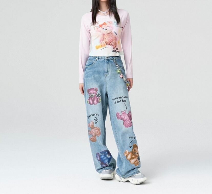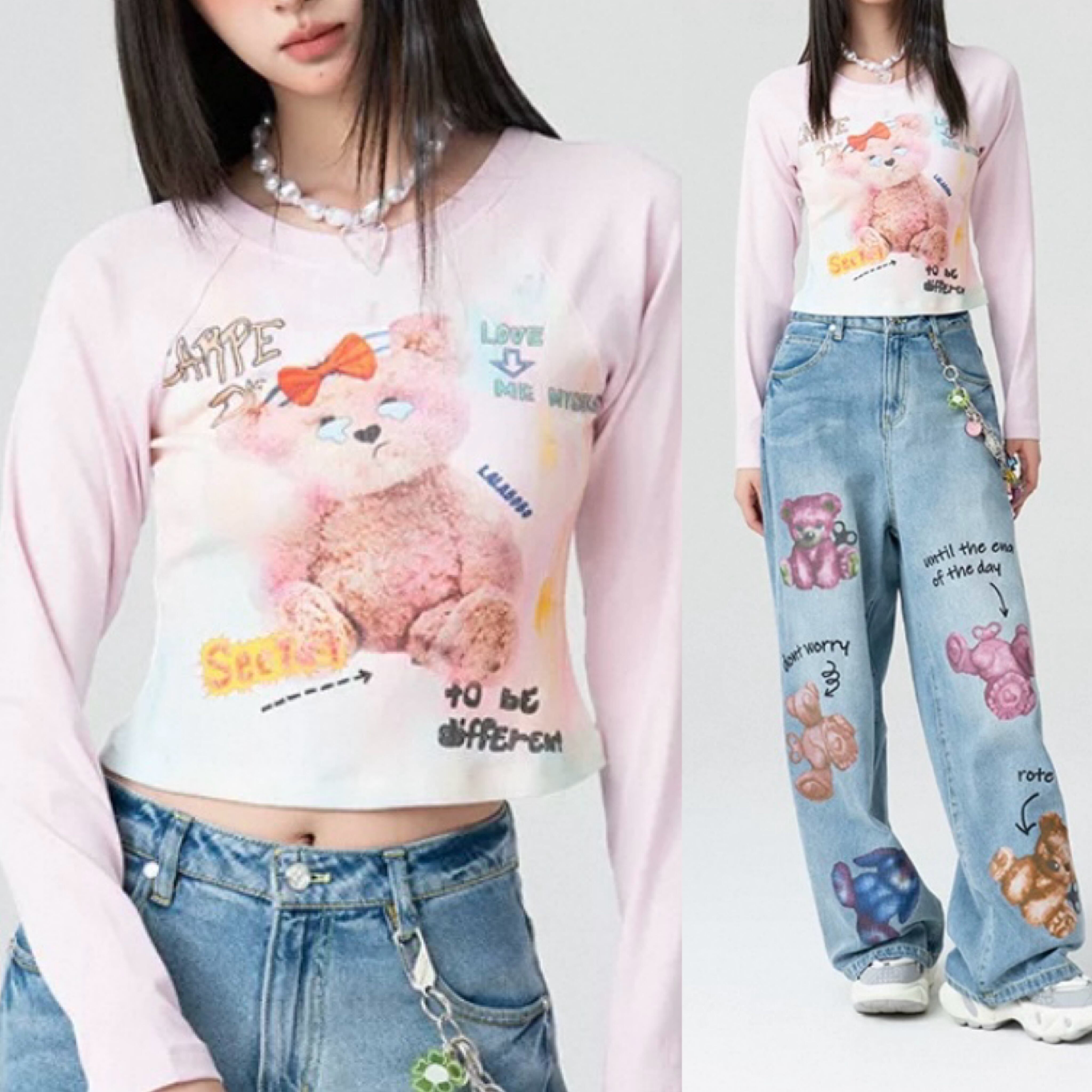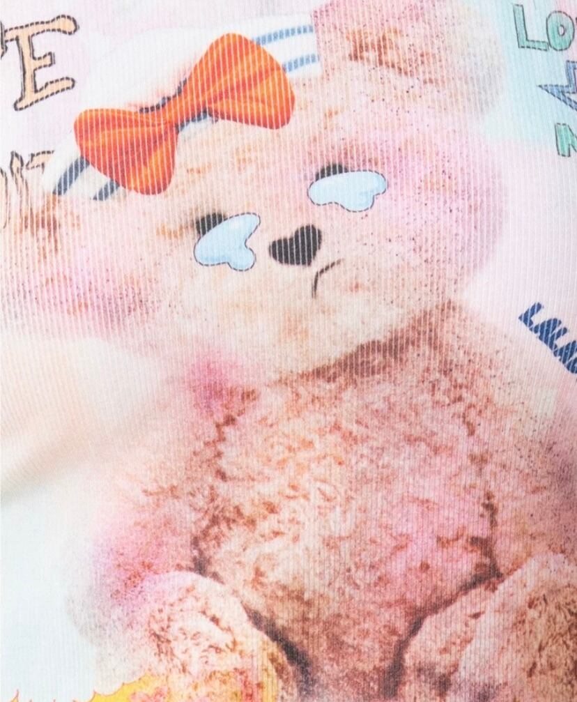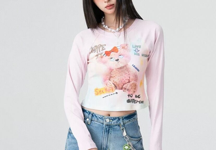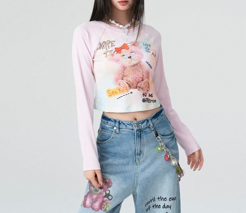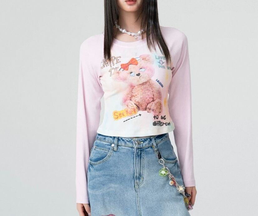 くまちゃん Tシャツ、白 かわいい トップス ロングTシャツ、ブラウス、リボン 落書き、くまちゃん、茶色 原宿