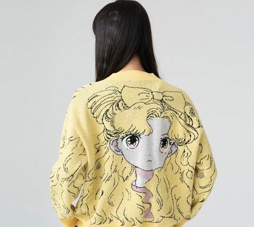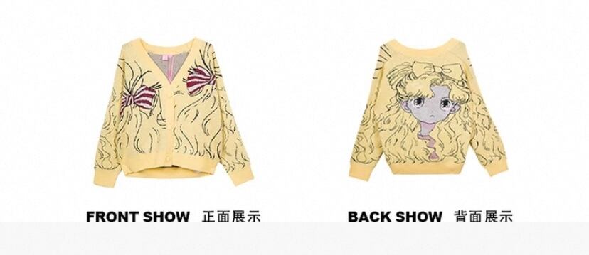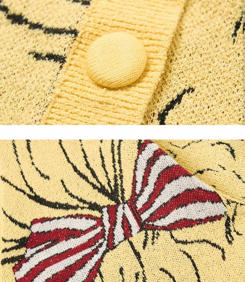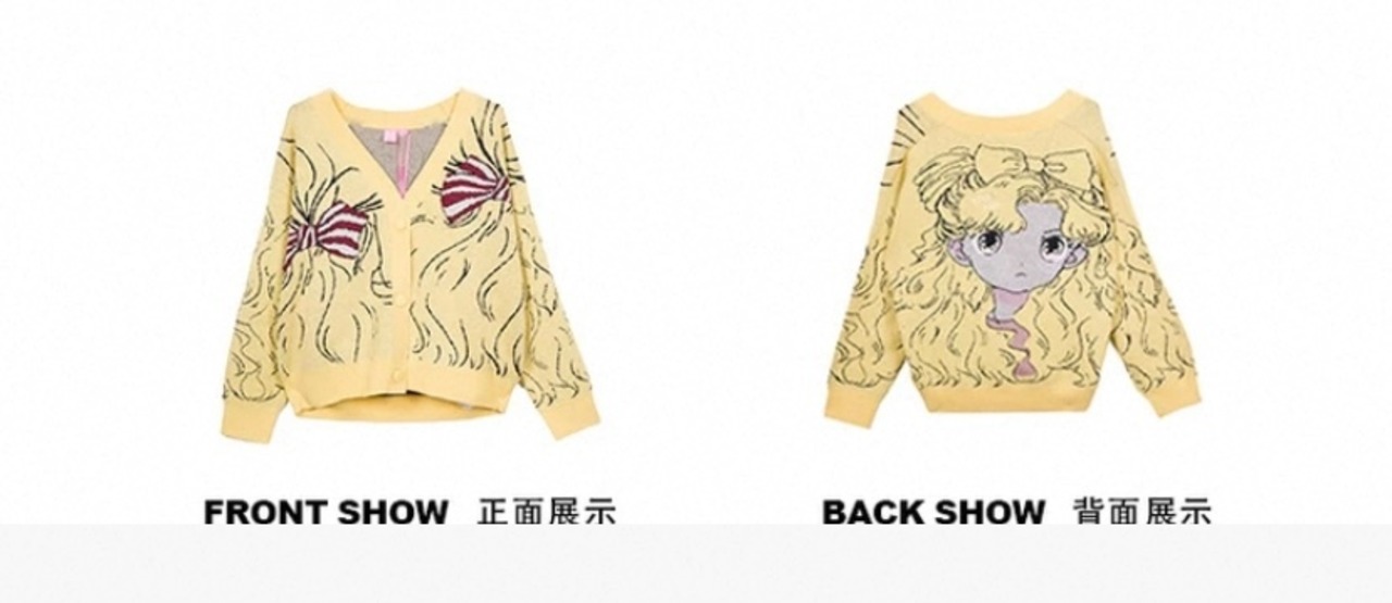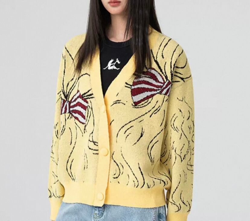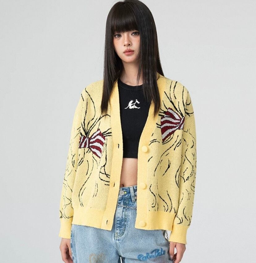 黄色 カーディガン、かわいい 漫画、少女 人形、リボンニット、セーター、アウター、トップス、コート、ジャケット 原宿 かわいい