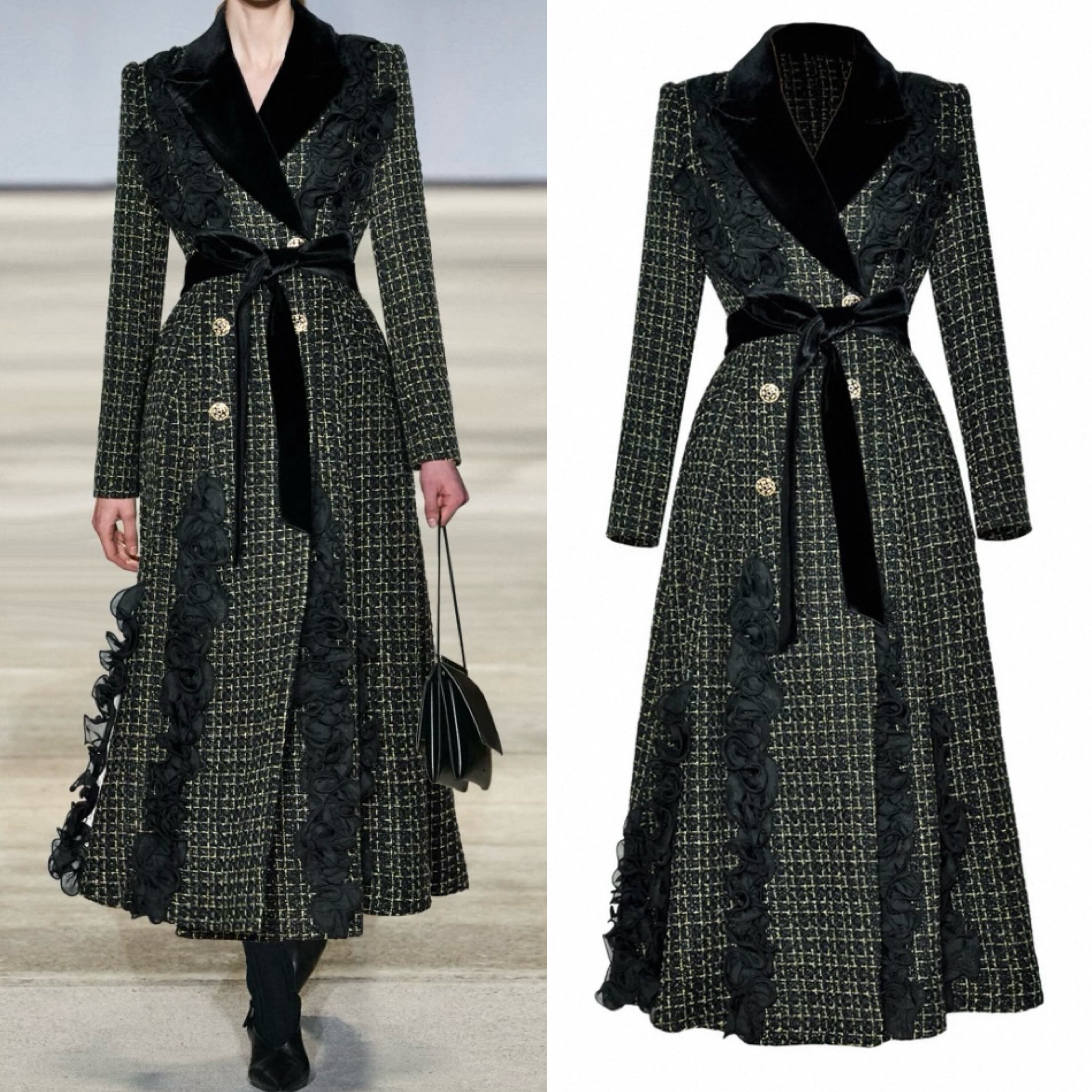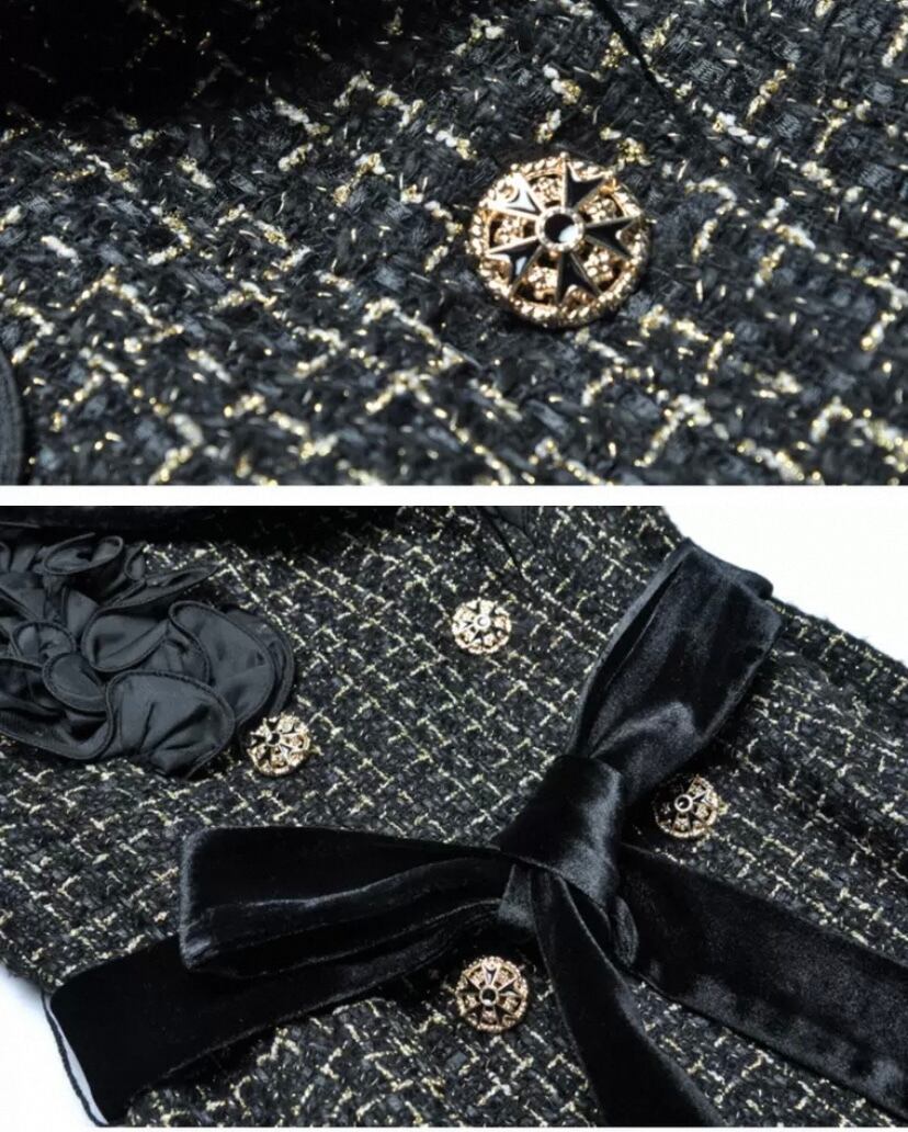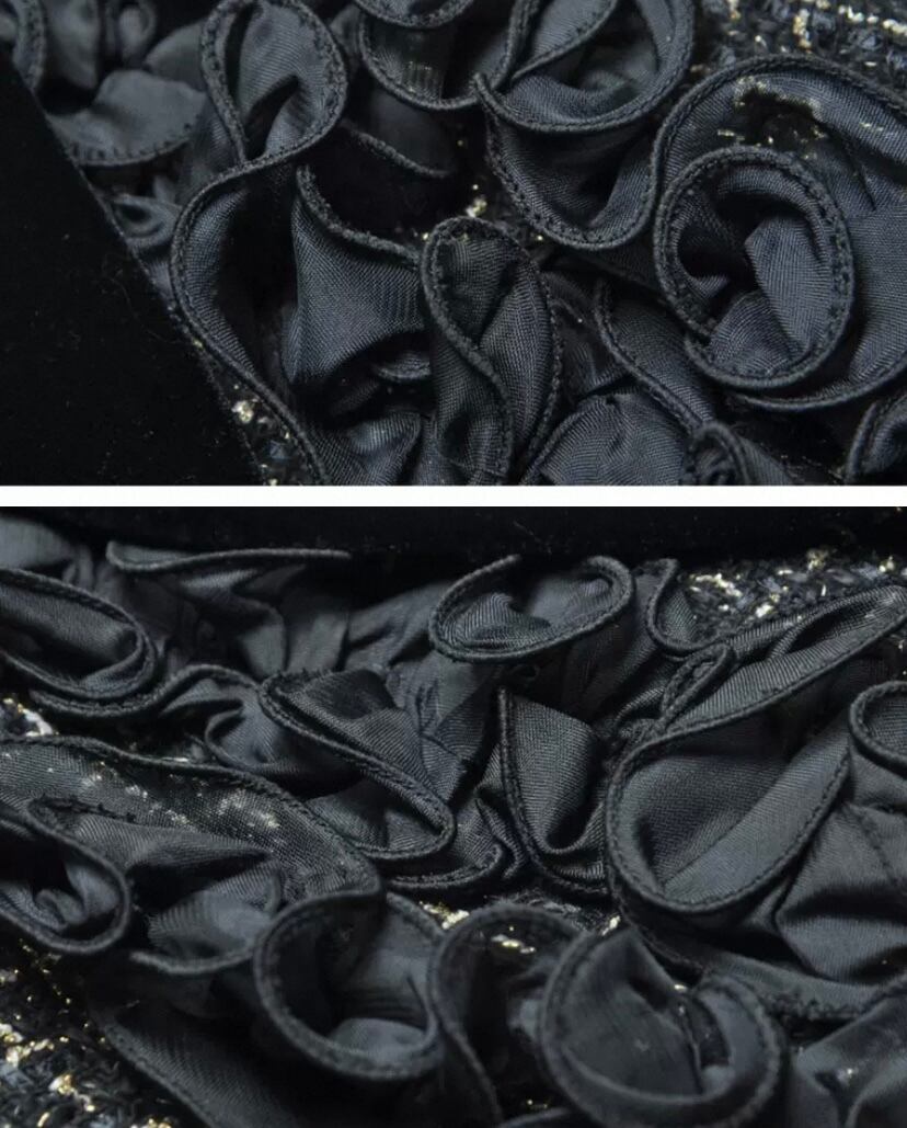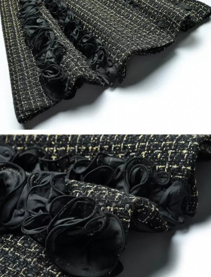 黒 ラメ ツイード ジャケット チェック、フリル アウター ロング ワンピース、カーディガン、ブルゾン コート、エレガント XL
