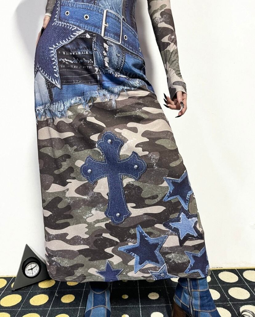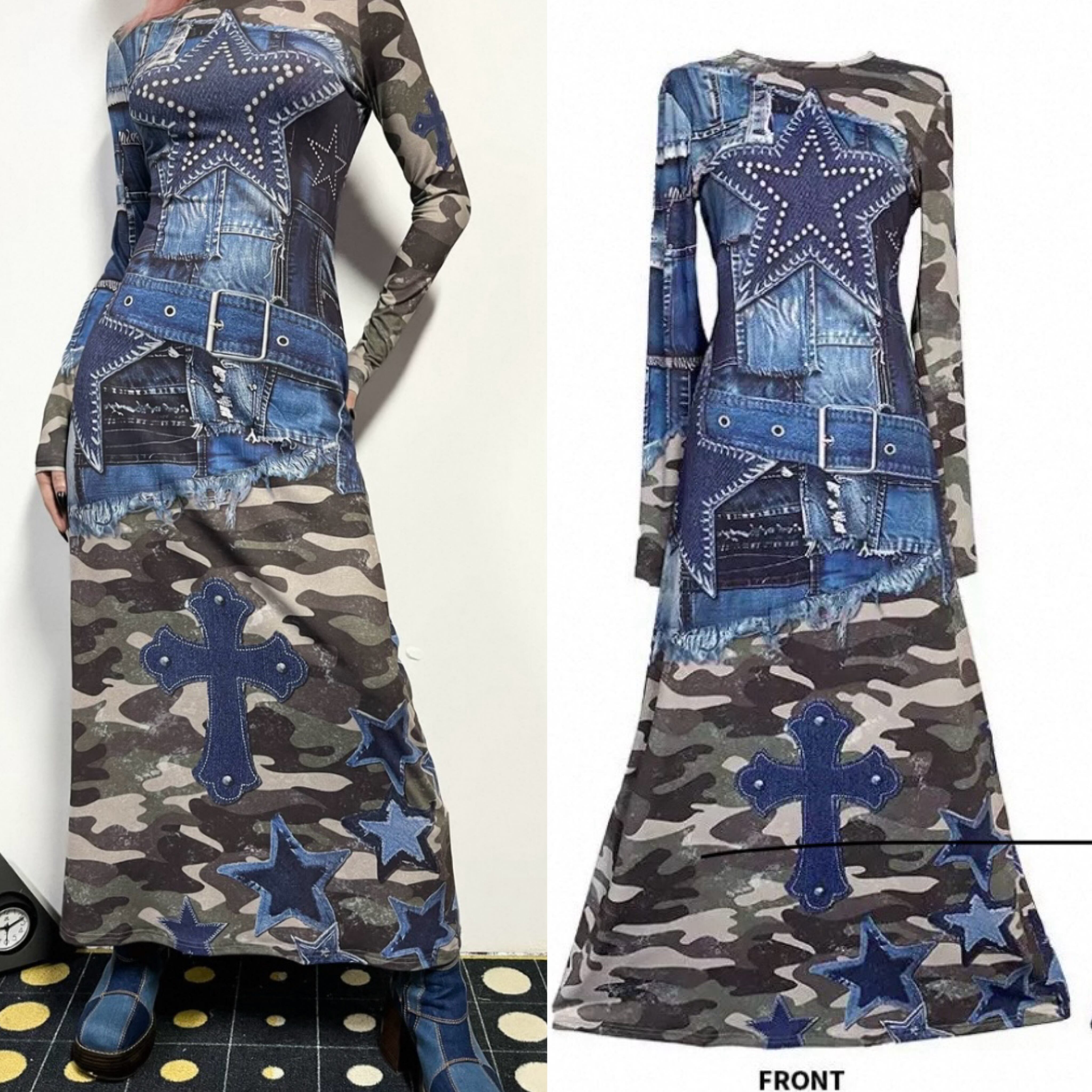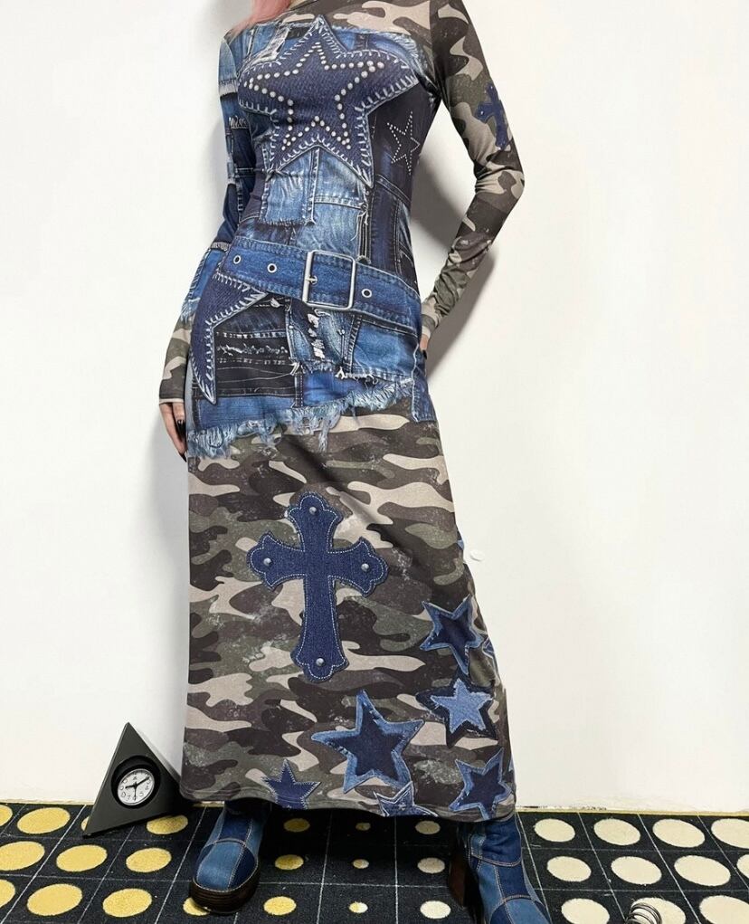 デニム レオパード、カモフラージュ 迷彩、水色、緑、トップス、長袖 Tシャツ マキシ ワンピース ストリート 原宿、ロック、パンク 騙し絵