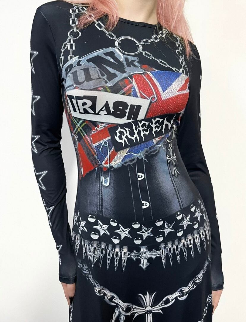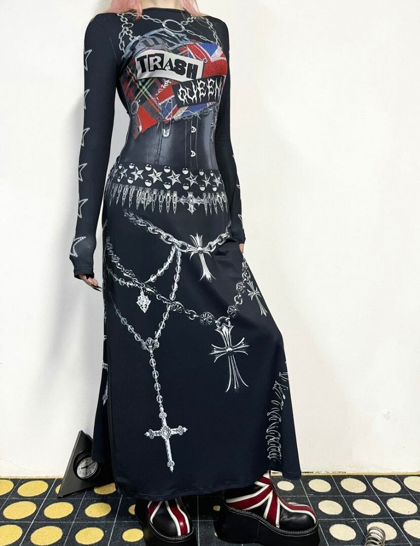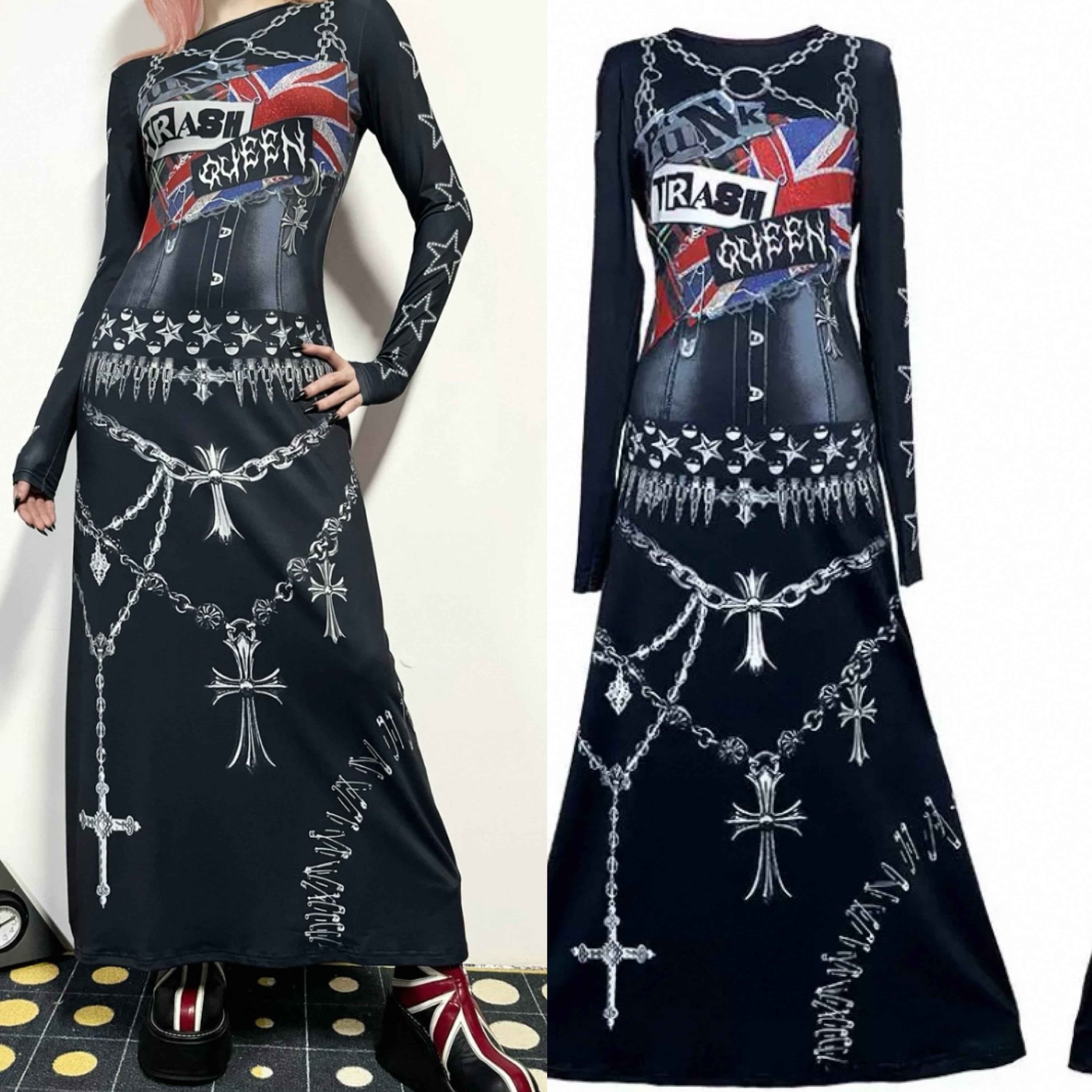 黒 イギリス 国旗 デニム レオパード、カモフラージュ 迷彩、水色、緑、トップス、長袖 Tシャツ マキシ ワンピース ストリート 原宿、ロック、パンク 騙し絵 クロス チェーン、騙し絵 ワンピース、マキシロング ロック、パンク 原宿、セクシー 長袖 Tシャツ