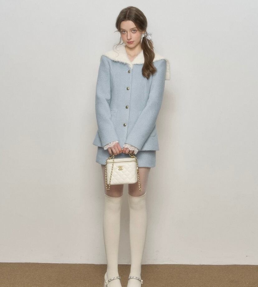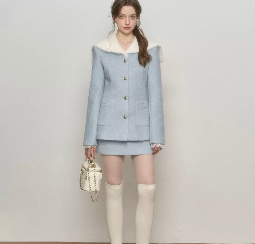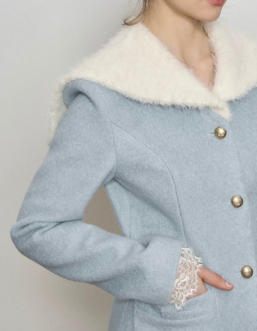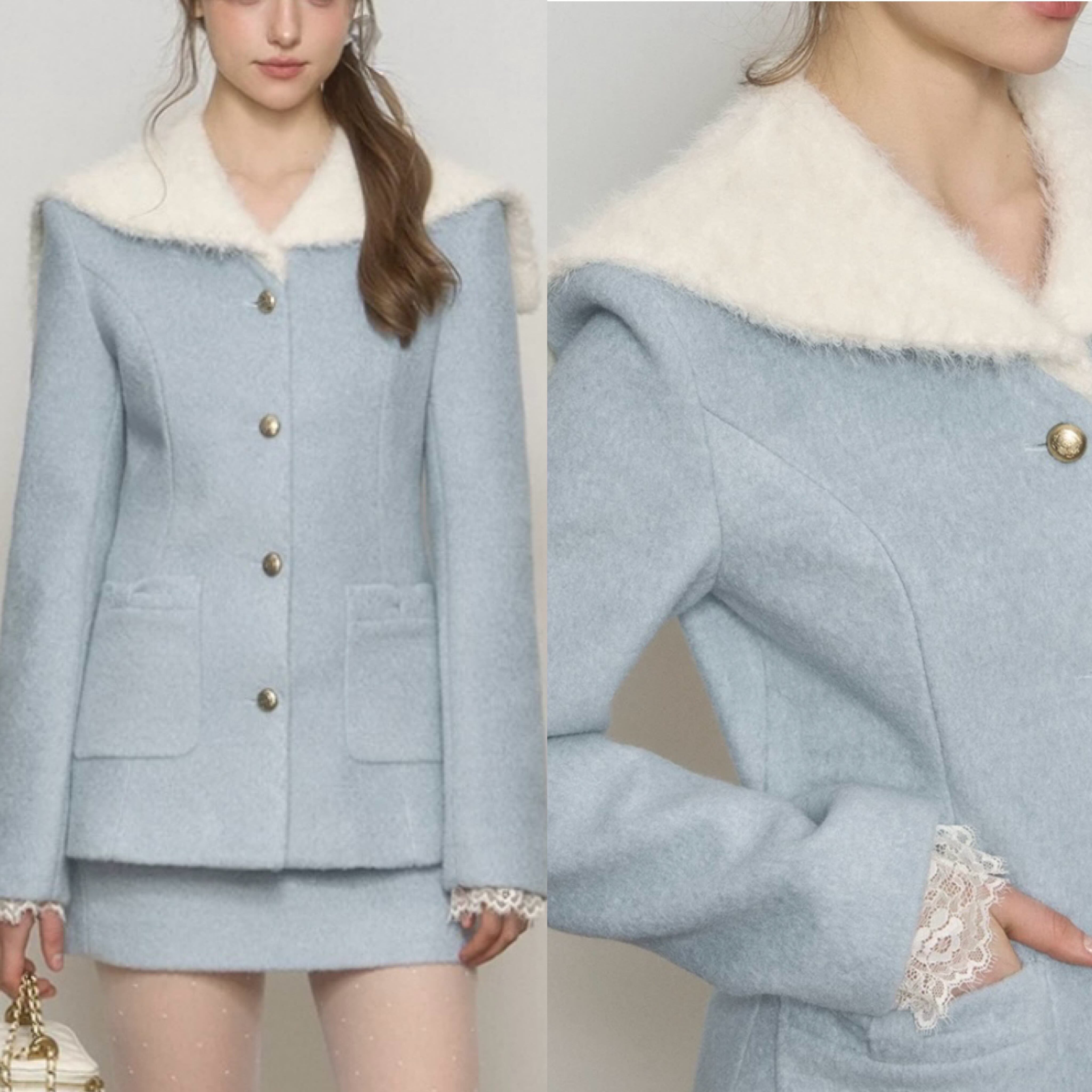 【ジャケット】モヘア、セーラー、水色、白、ふわふわ、ジャケット、アウター、コート、カーディガン、ブルゾン、お嬢様、エレガント、シンプル、かわいい 原宿、表参道
