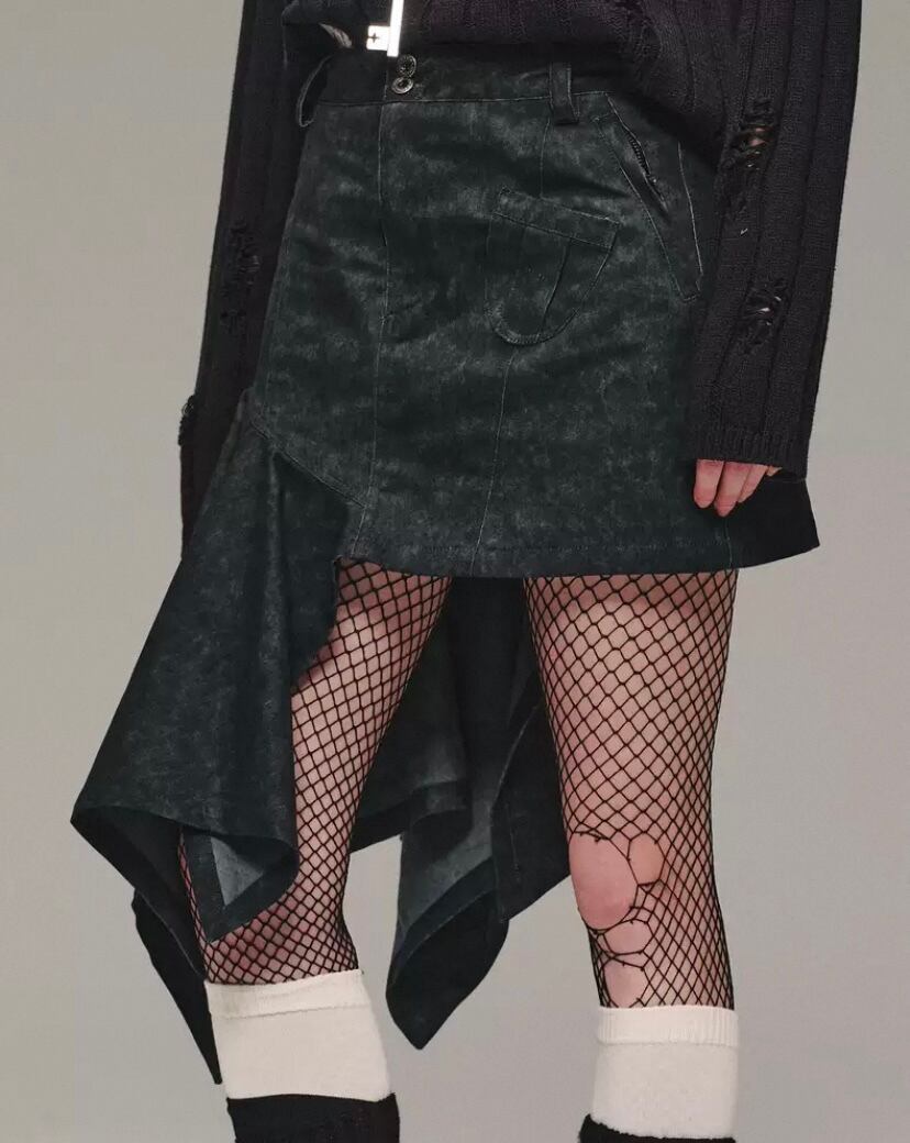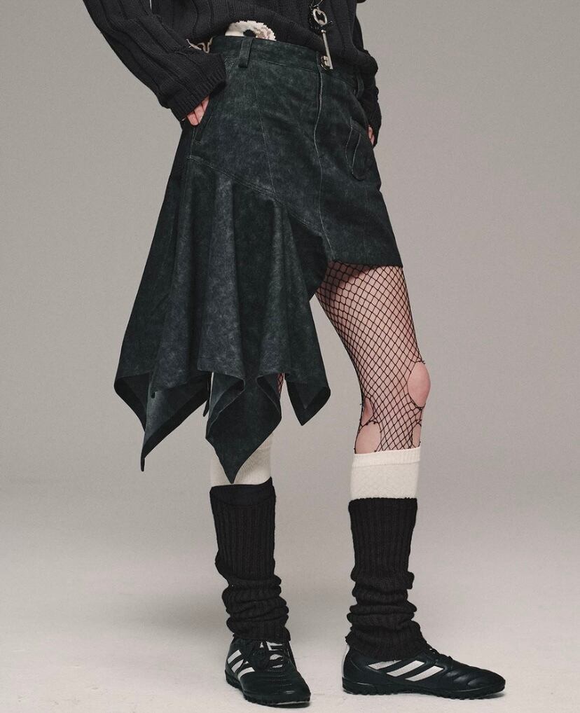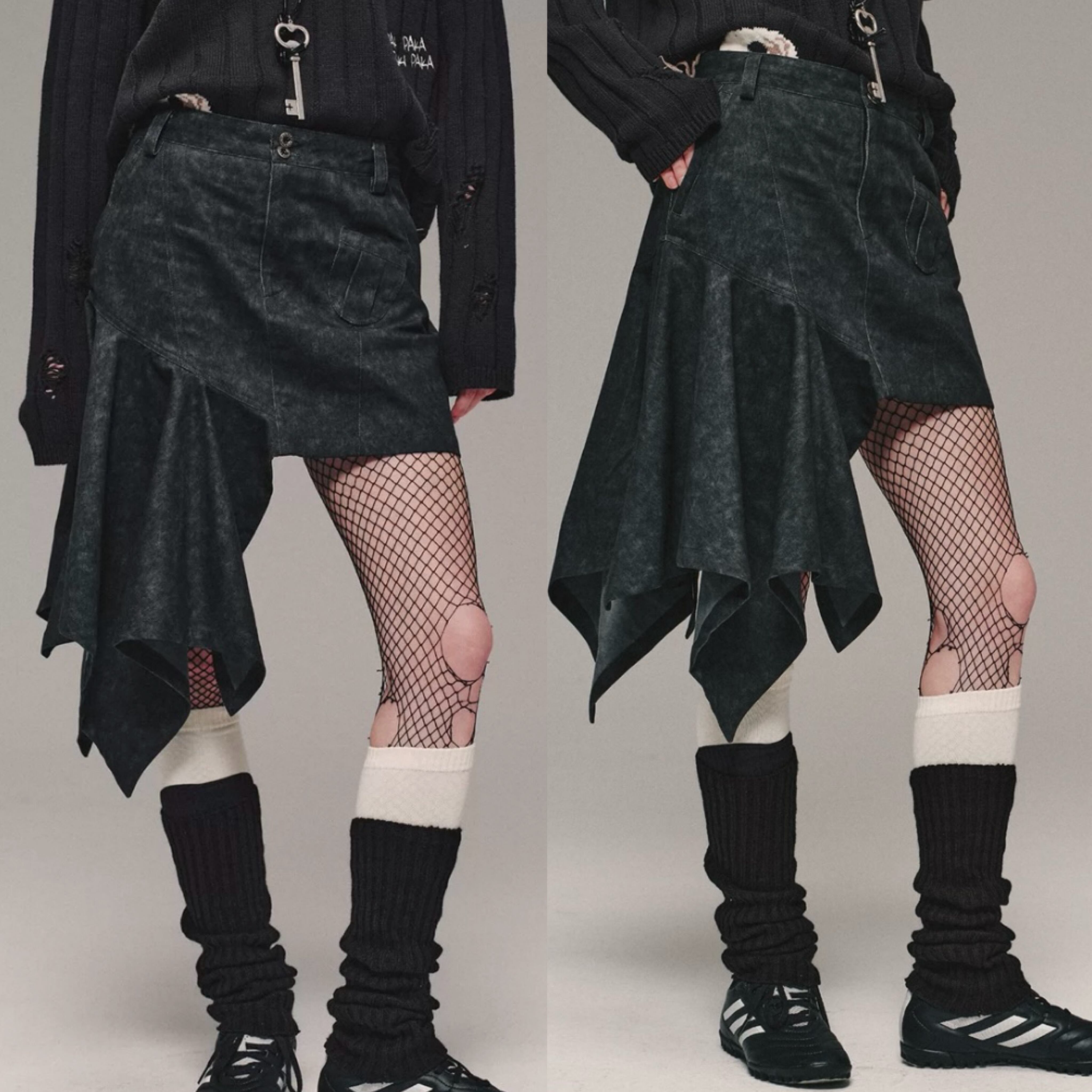 アシンメトリー、黒 ブラック ロック、重ね着 ミニスカート、ボトムス クラブ、ダンス、原宿、裏原宿、パンク かっこいい ワイルド レザー風 ショートパンツ デニム
