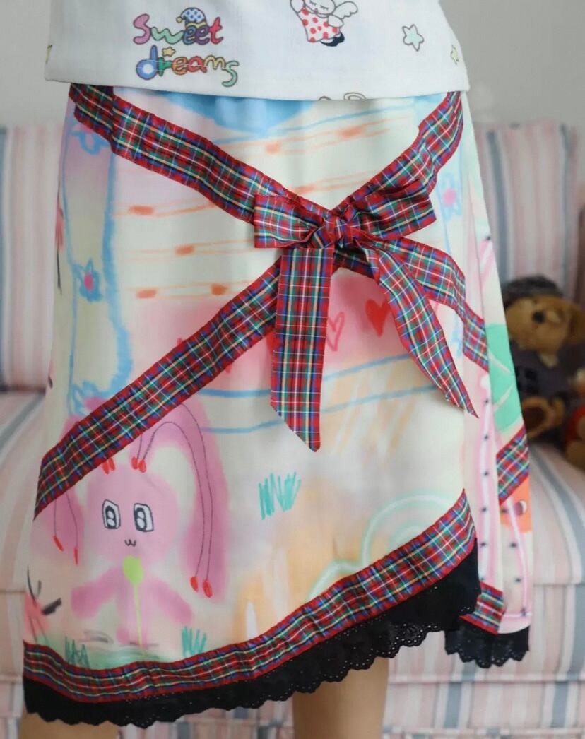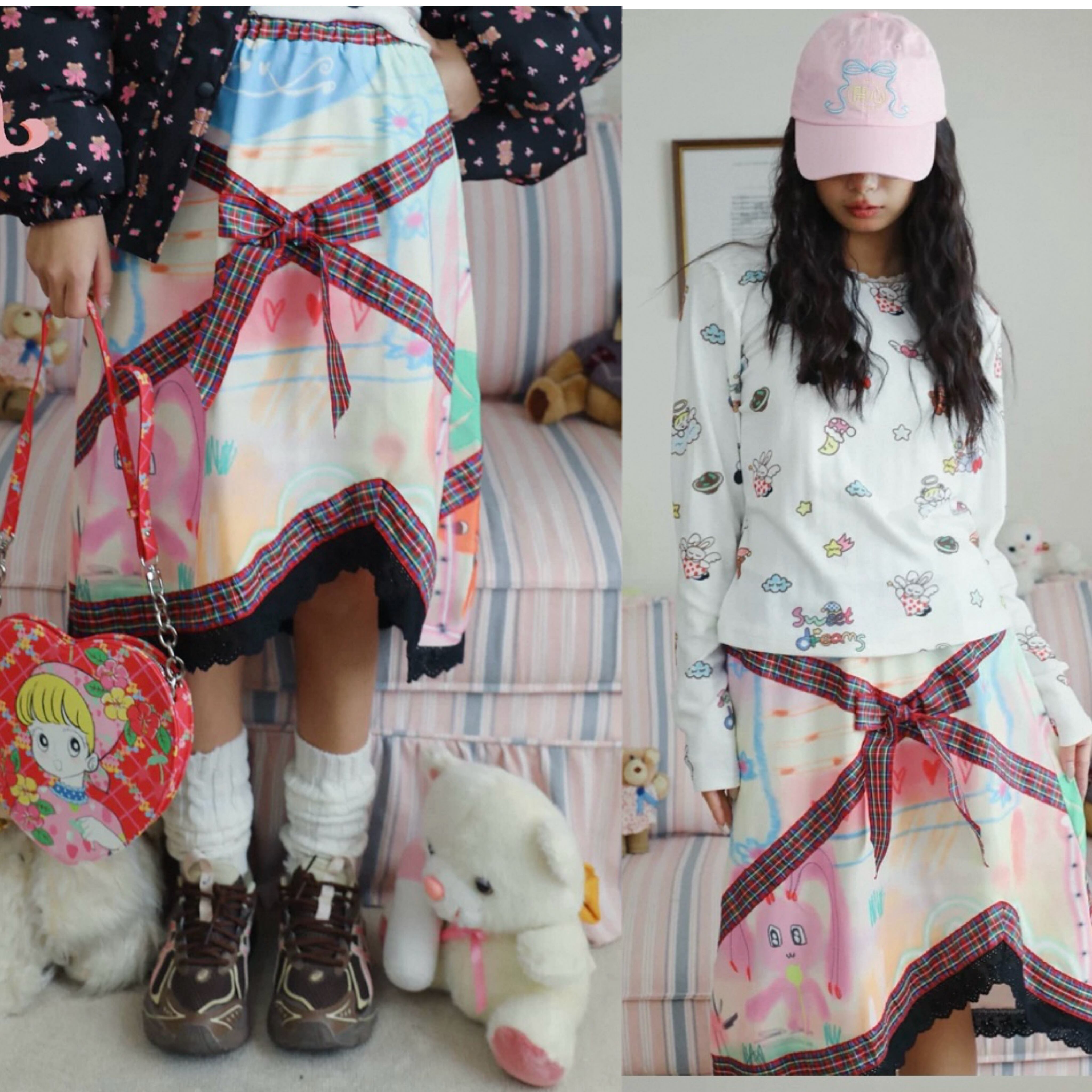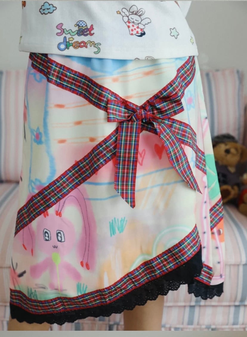 スカート ボトムス リボン チェック フレアスカート 原宿 ガーリー 可愛い 総柄 落書き