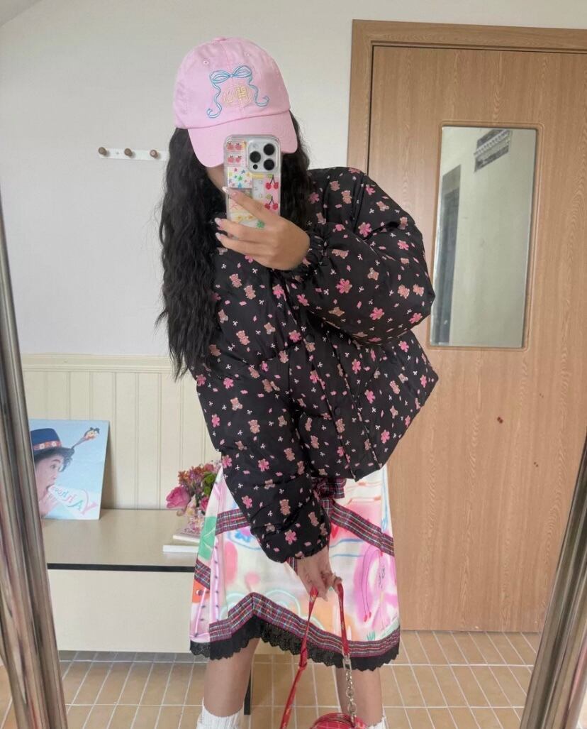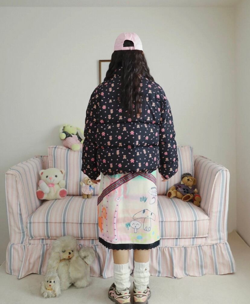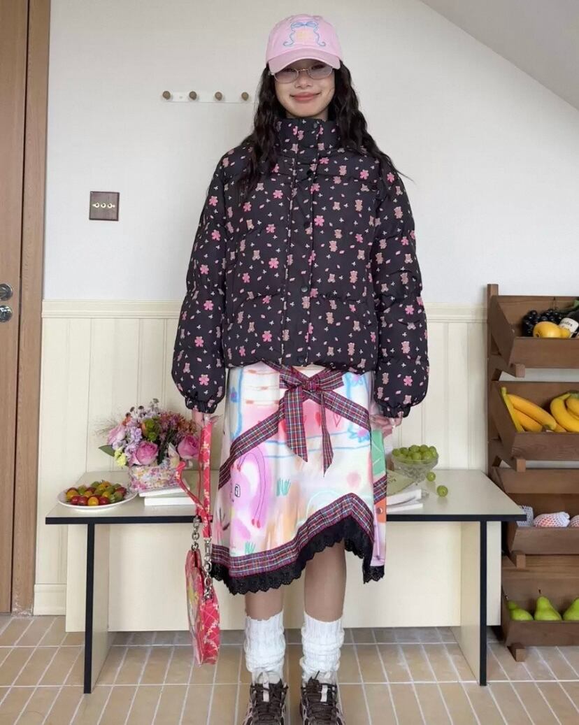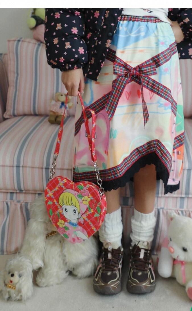 スカート ボトムス リボン チェック フレアスカート 原宿 ガーリー 可愛い 総柄 落書き