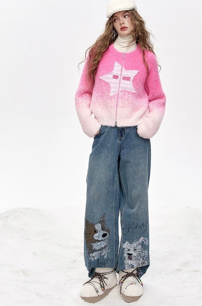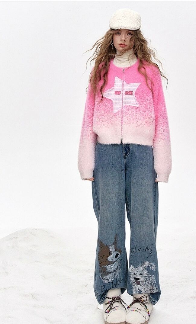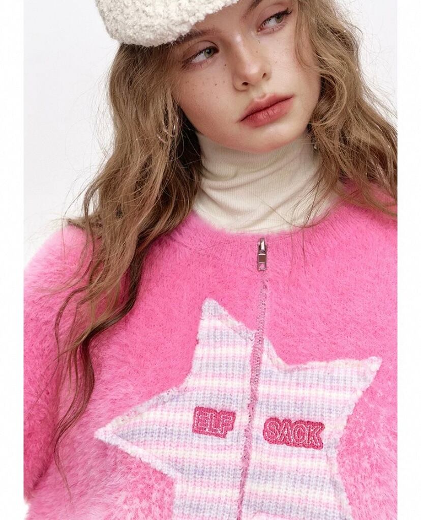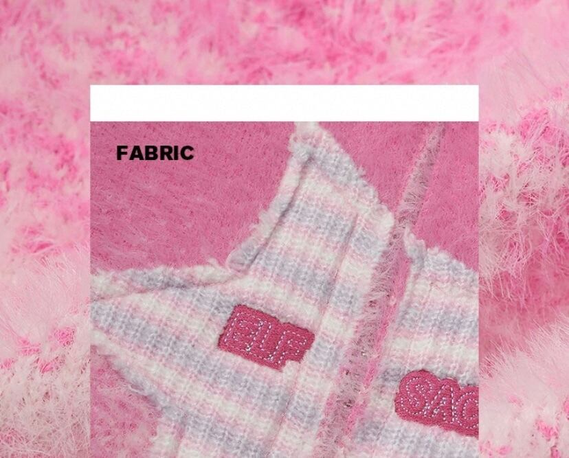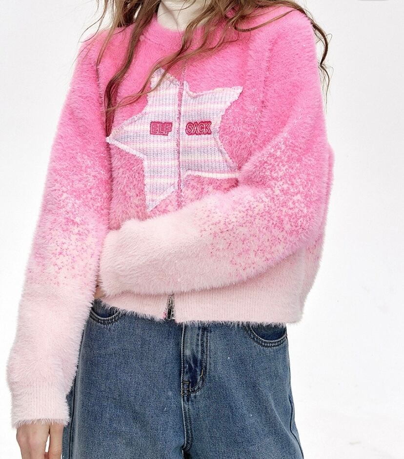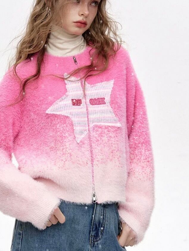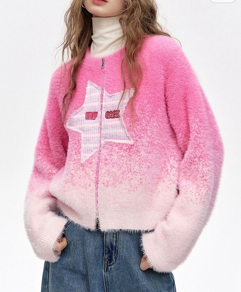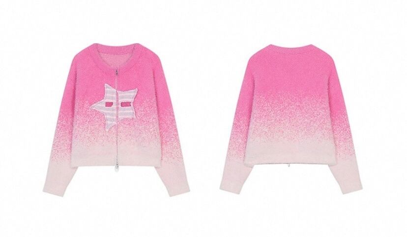 ピンク 星 カーディガン 星 ピンク、かわいい グラデーション、白、トップス、セーター、アウター、原宿、カジュアル