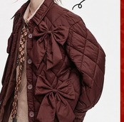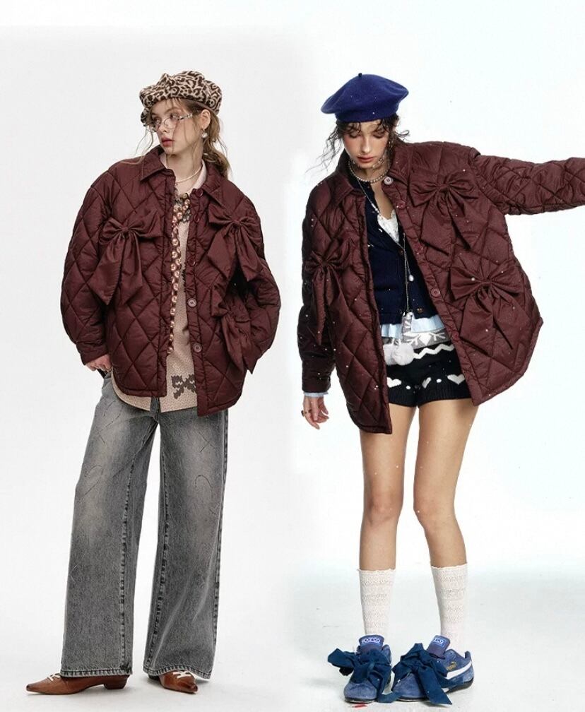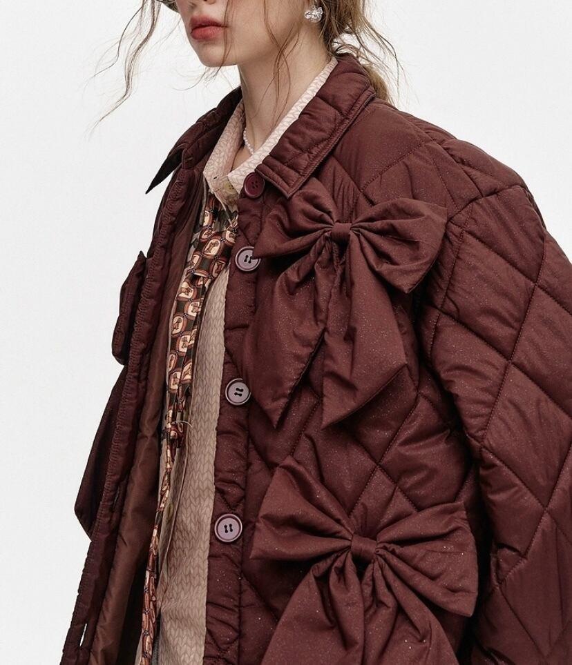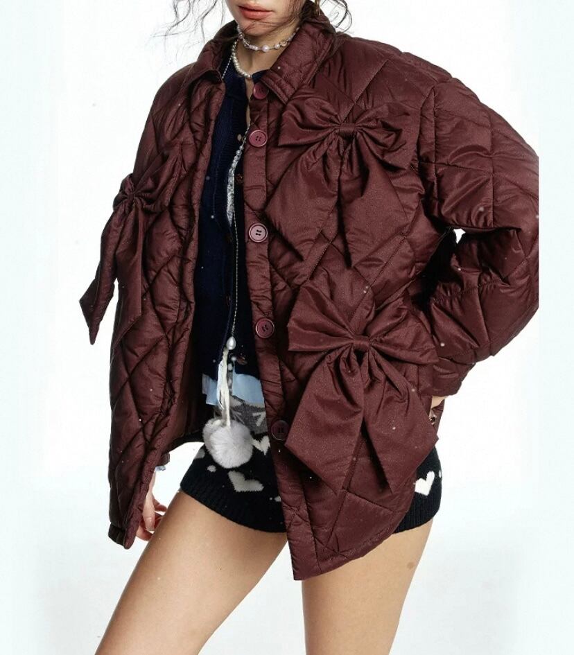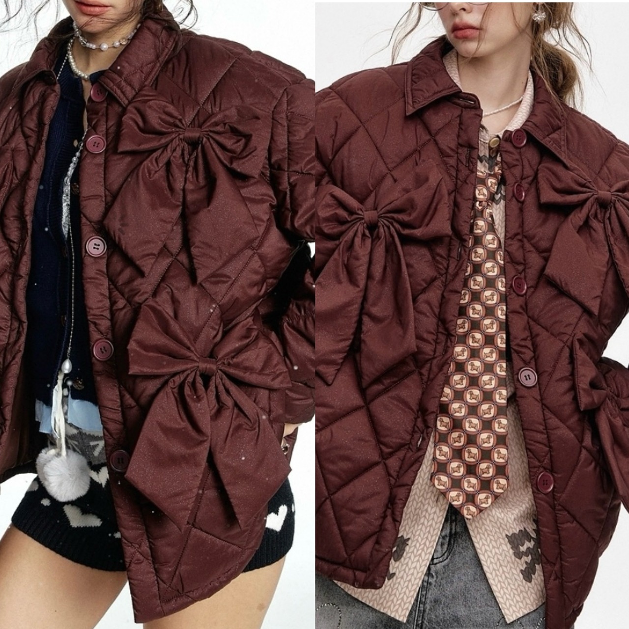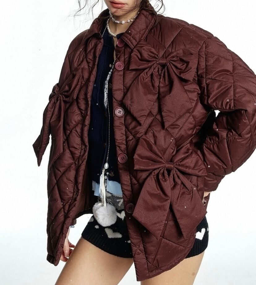 茶色、リボン、アウター ジャケット、コート、ジャンバー、ブルゾン、リボン、キルティング、カーディガン、シャツ、ブラウス、トップス 原宿、かわいい シンプル 暖かい