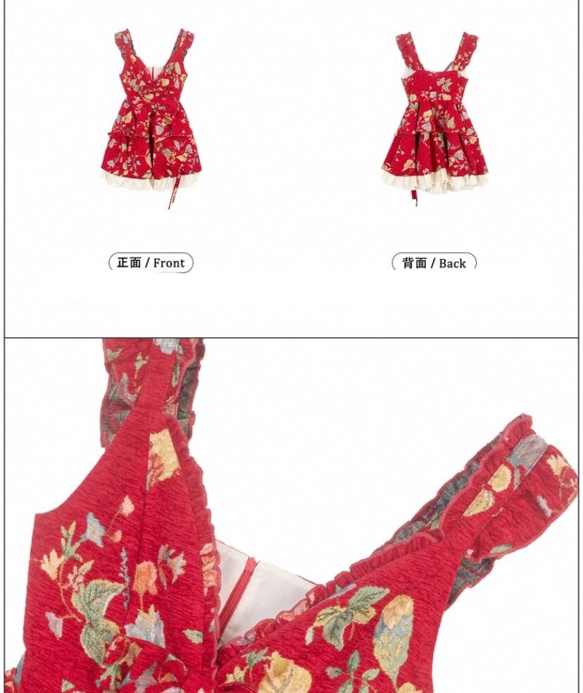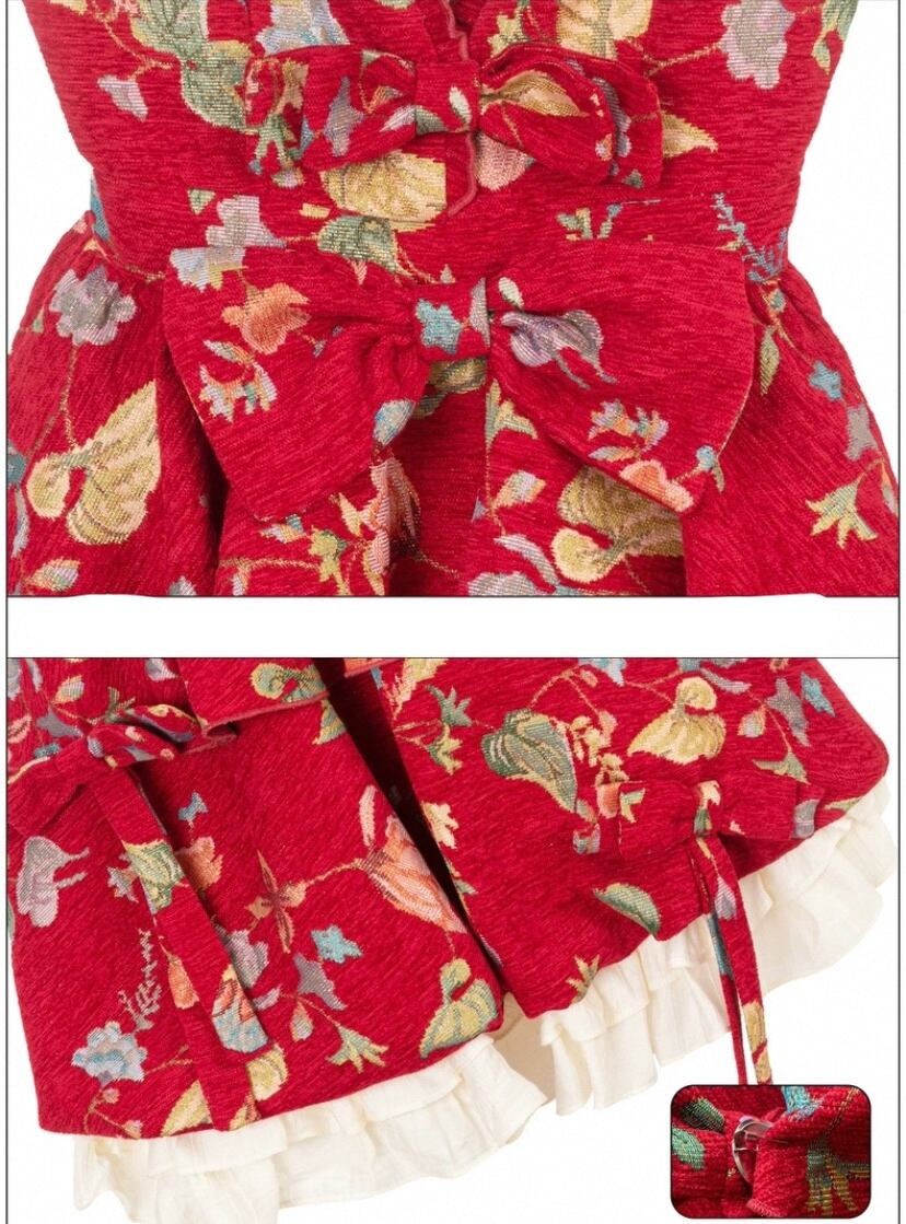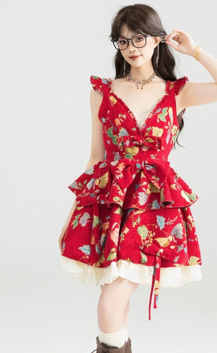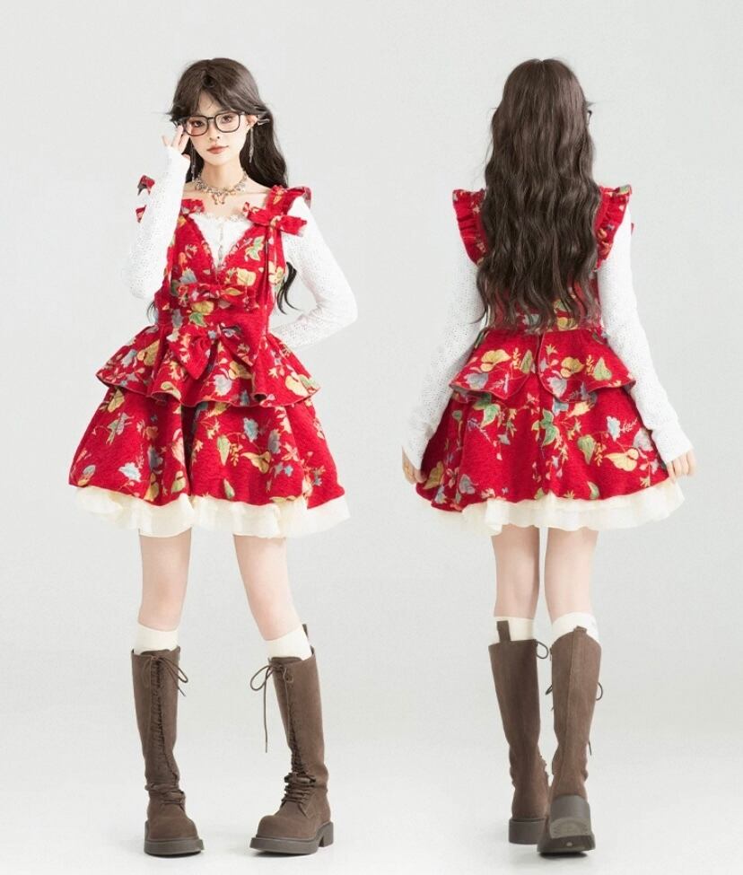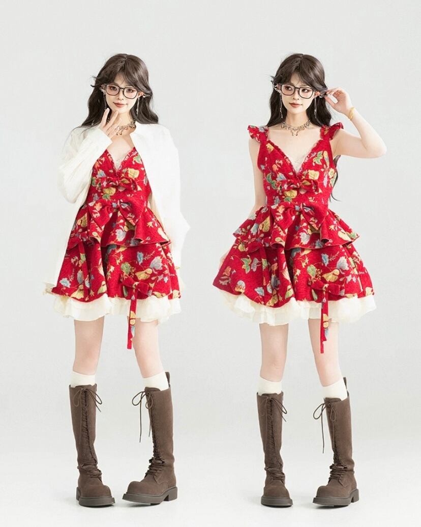 赤 リボン 和柄 和風 花柄、浴衣 ワンピース ガーリー XL 原宿 スリーブ 重ね着 可愛い ミニスカート