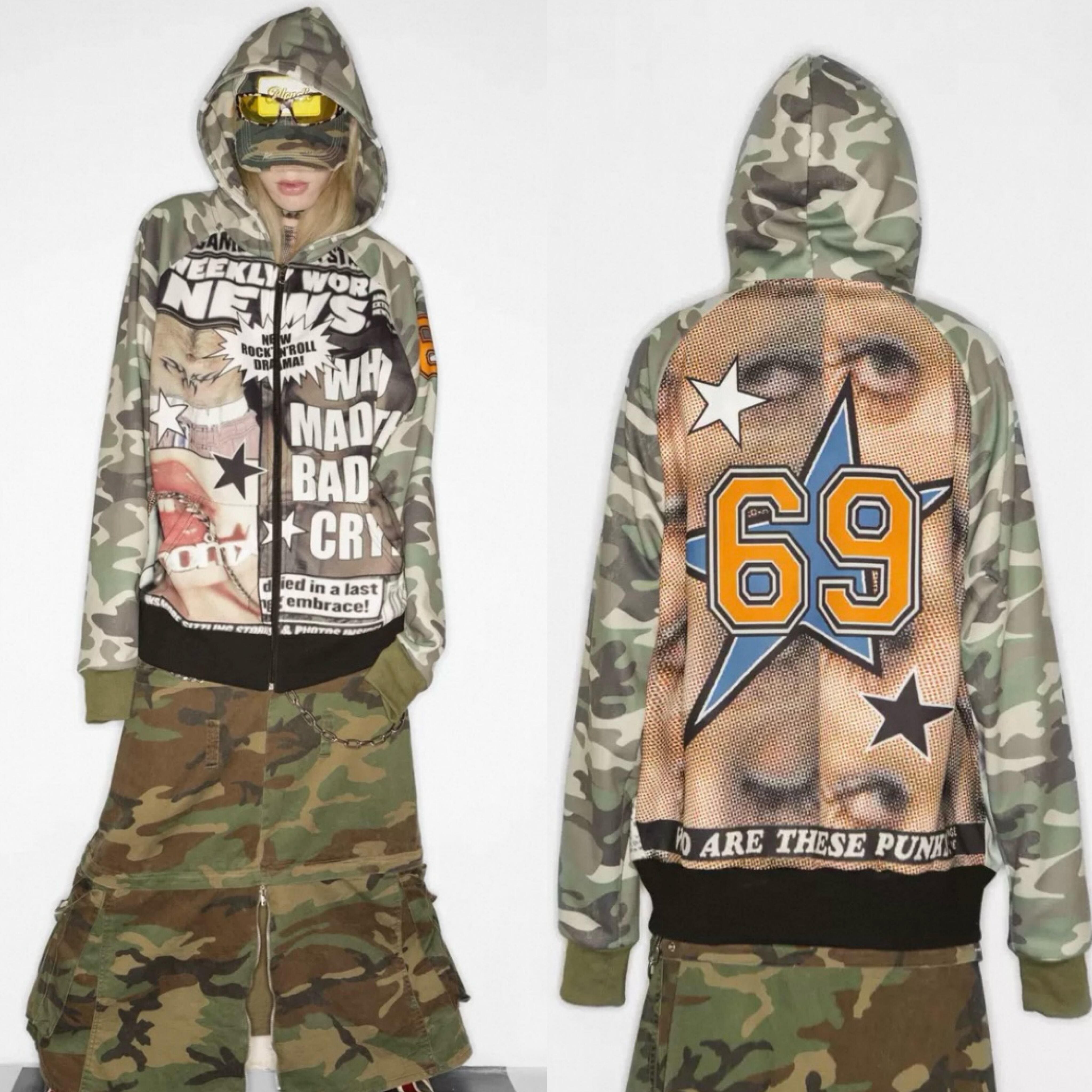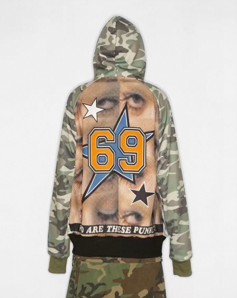 緑 カーキ 迷彩 カモフラージュ パーカー スウェット トレーナー 69 オレンジ ナンバー バイク、カジュアルストリート、ヒップホップ、原宿、ユニセックス メンズライク トップス アウター