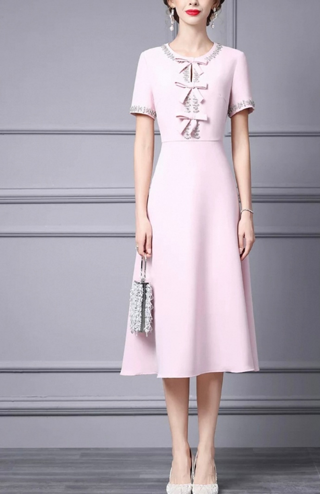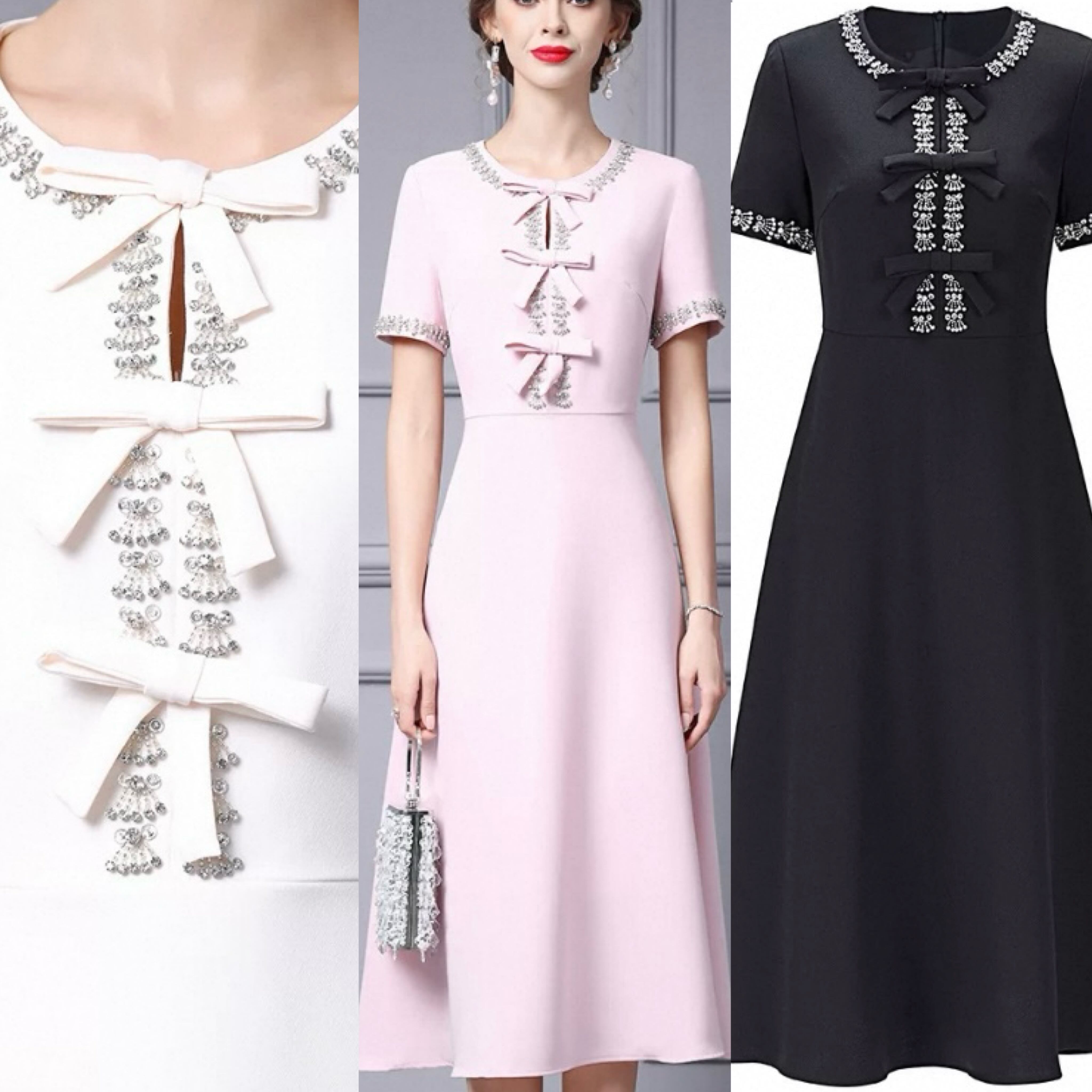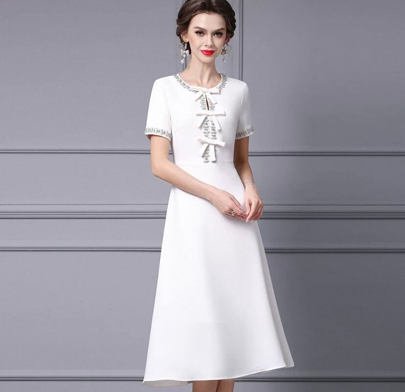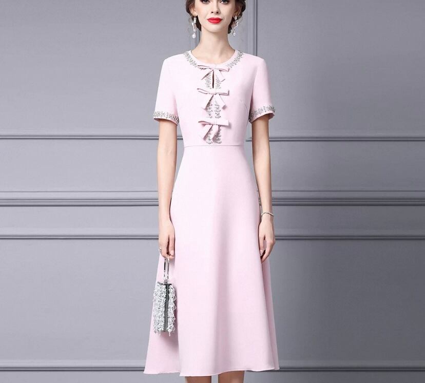 ピンク リボン 白 黒 ビーズ ラインストーン キラキラ 半袖 エレガント Aライン ワンピース、ネックレス ドレス XL 銀座 表参道、お嬢様 パーティー