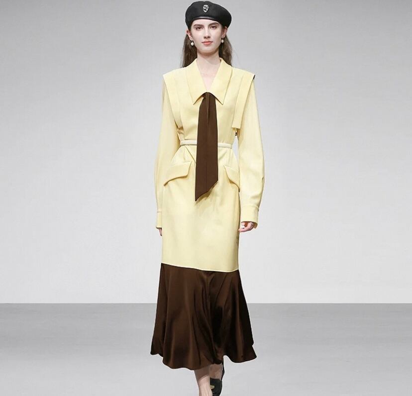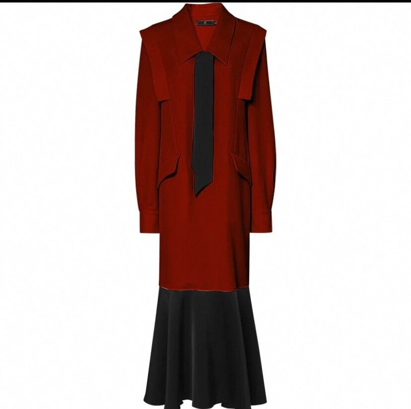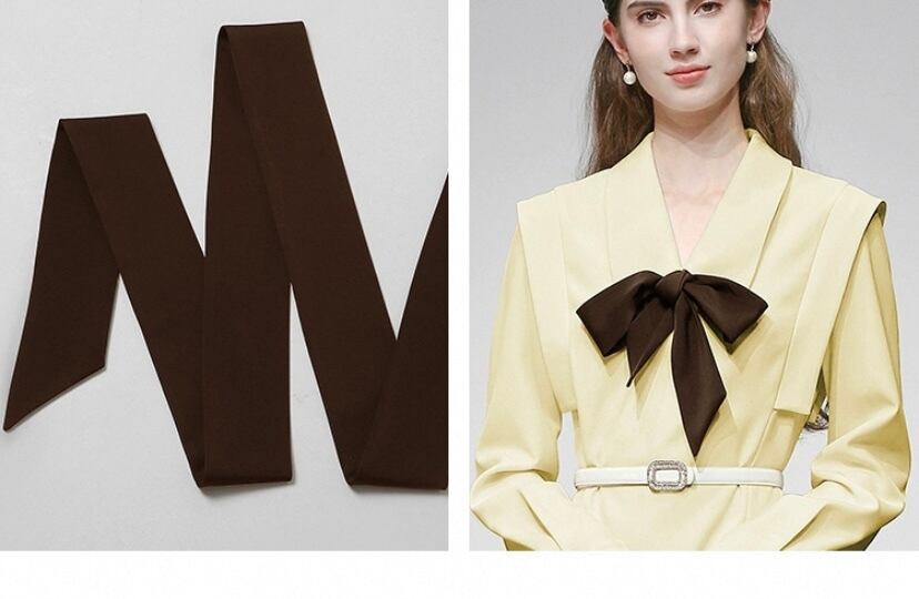 赤 黄色、茶色、バイカラー ブラウス、リボン、ネクタイ、マーメイド、バイカラー、襟