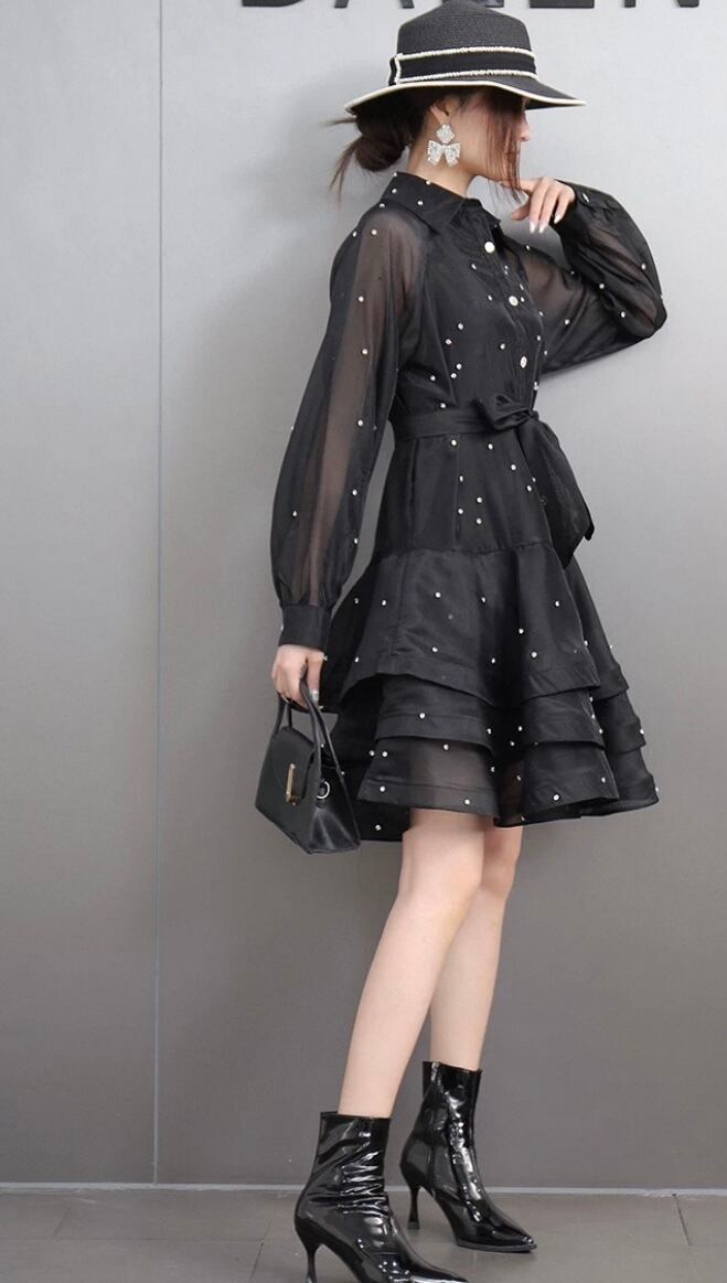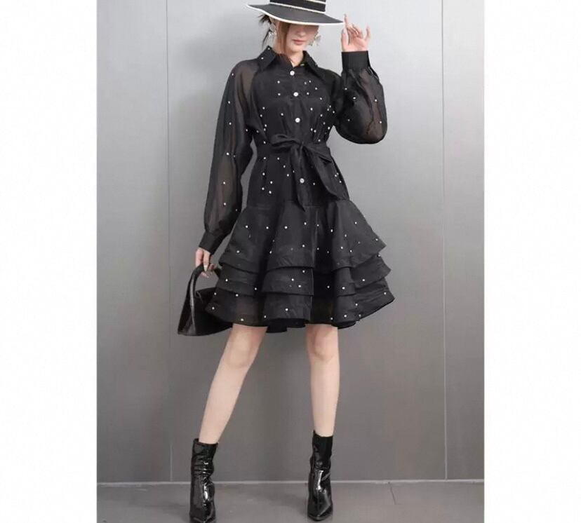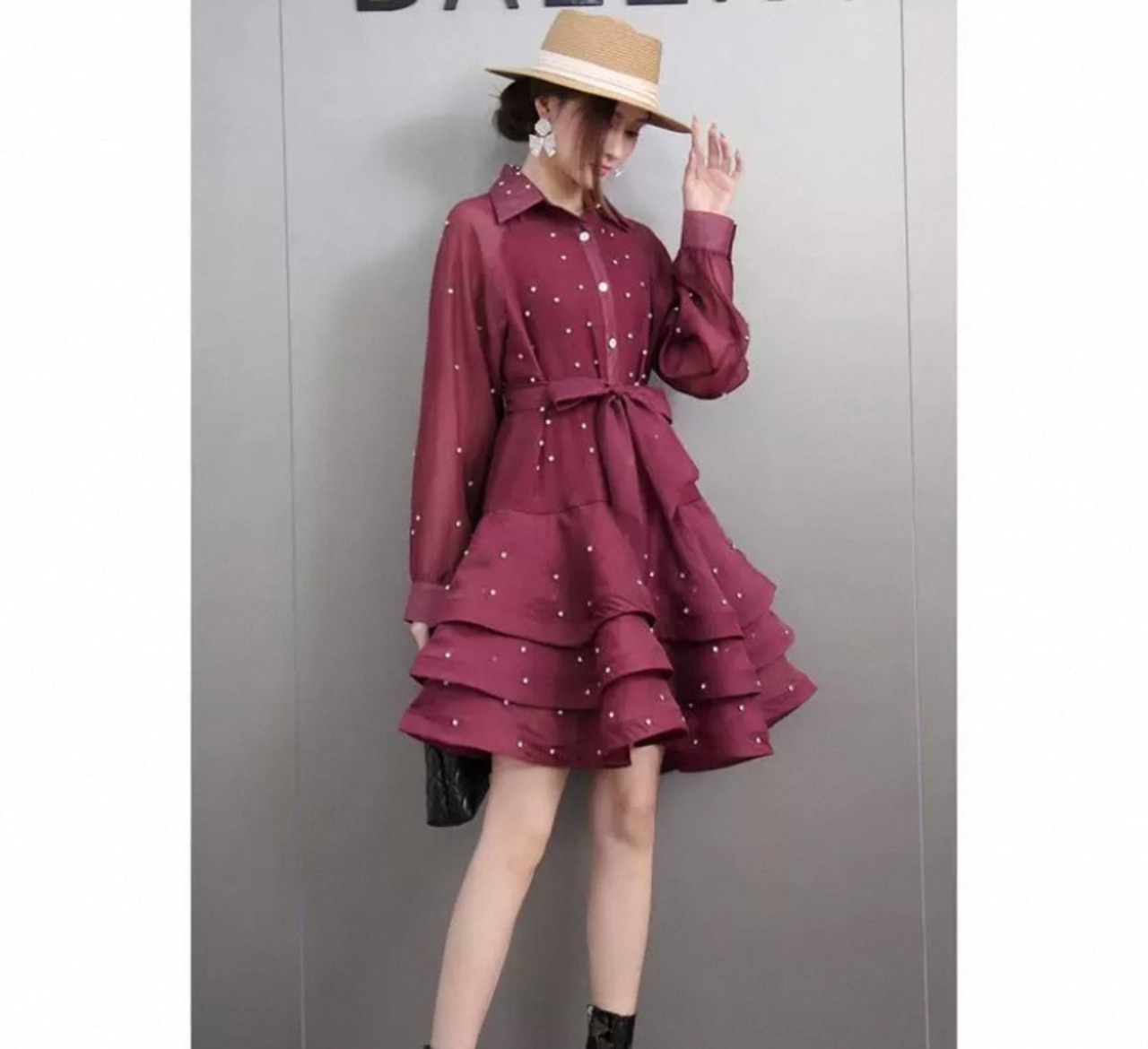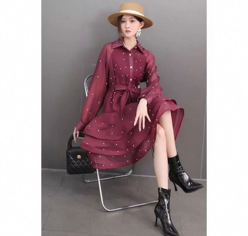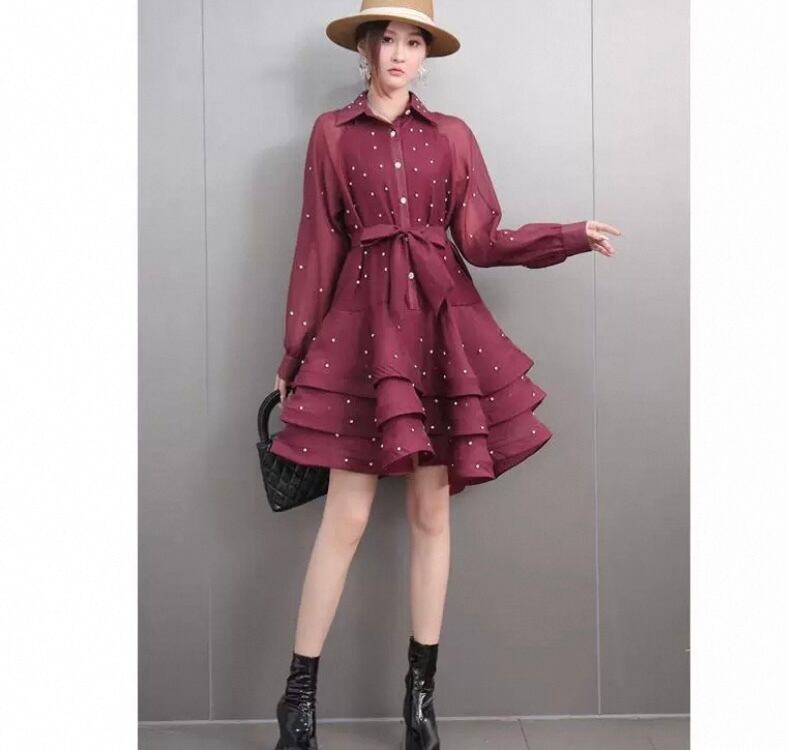 黒 赤 ブラウス、ワインレッド ワンピース、カジュアル、シンプル パール ブラウス、ゆったり ミニスカート フレアスカート