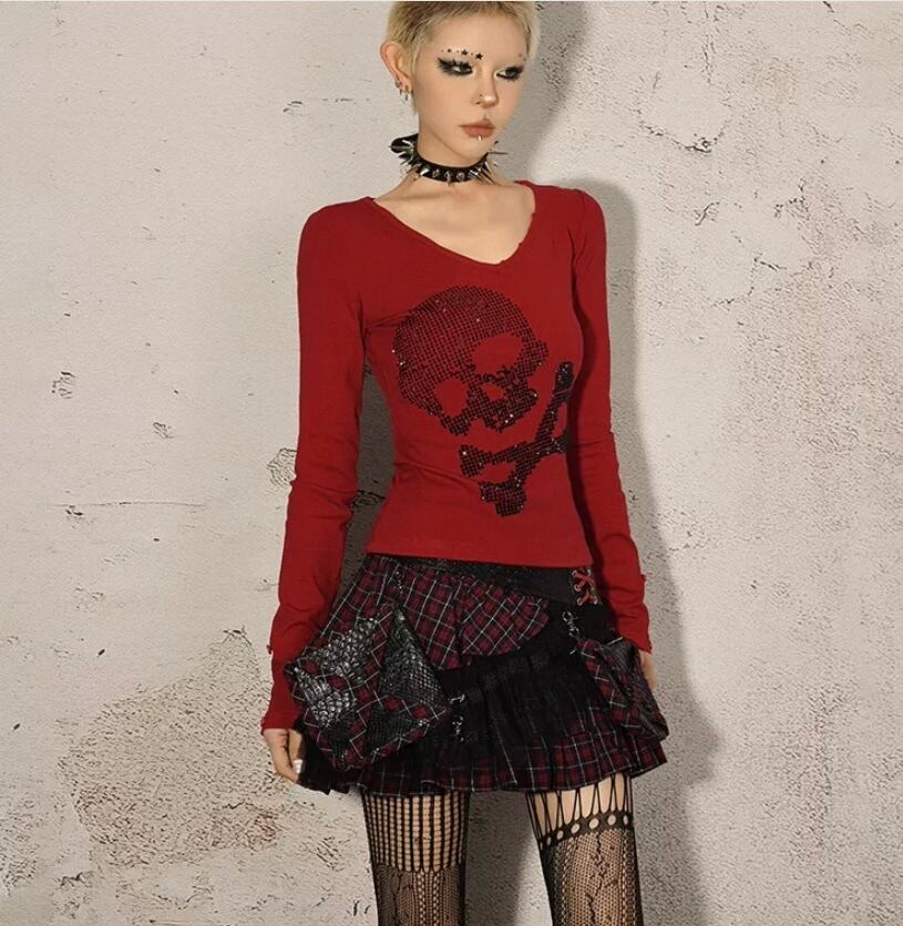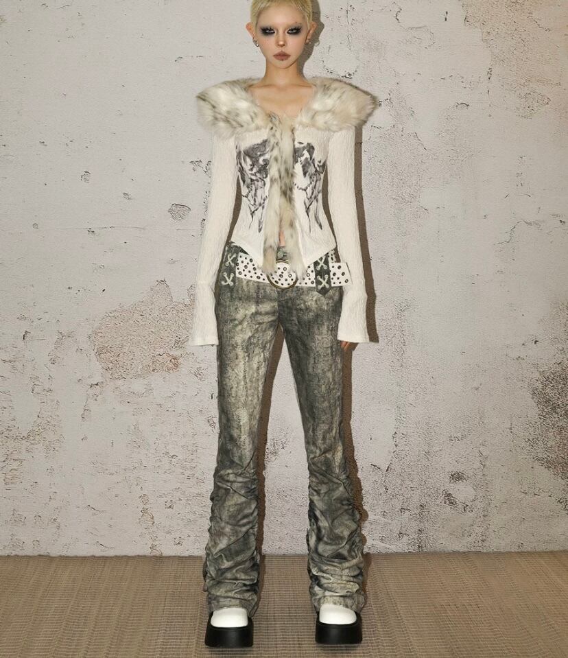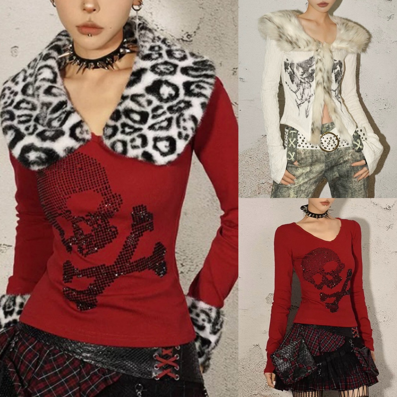 【襟取り外し可能】赤 カーディガン、白、ファー レオパード 丸襟 豹柄、ドクロ、ラインストーン、トップス、カーディガン、セーター、アウター ジャケット、ロック、パンク 原宿