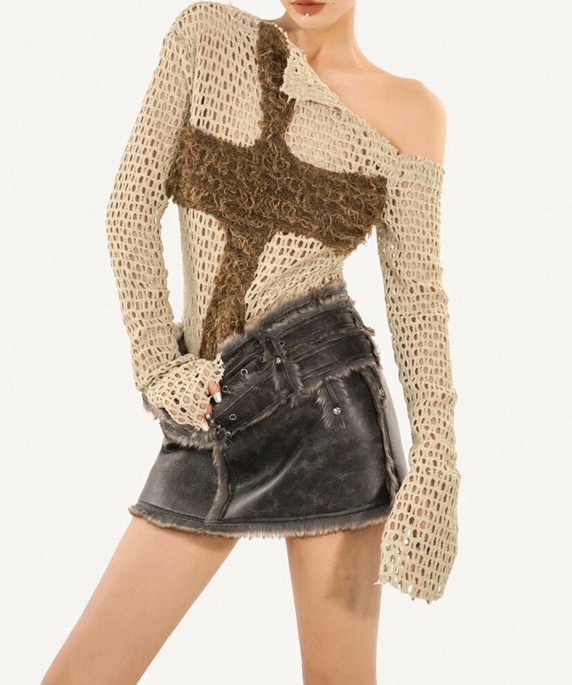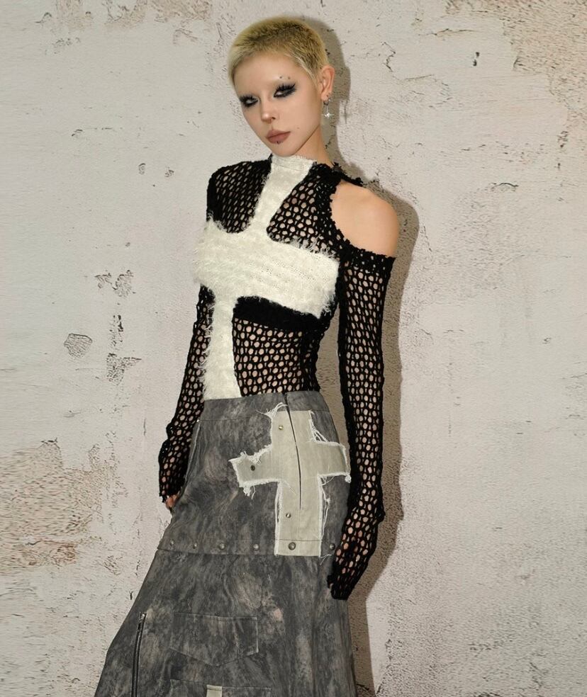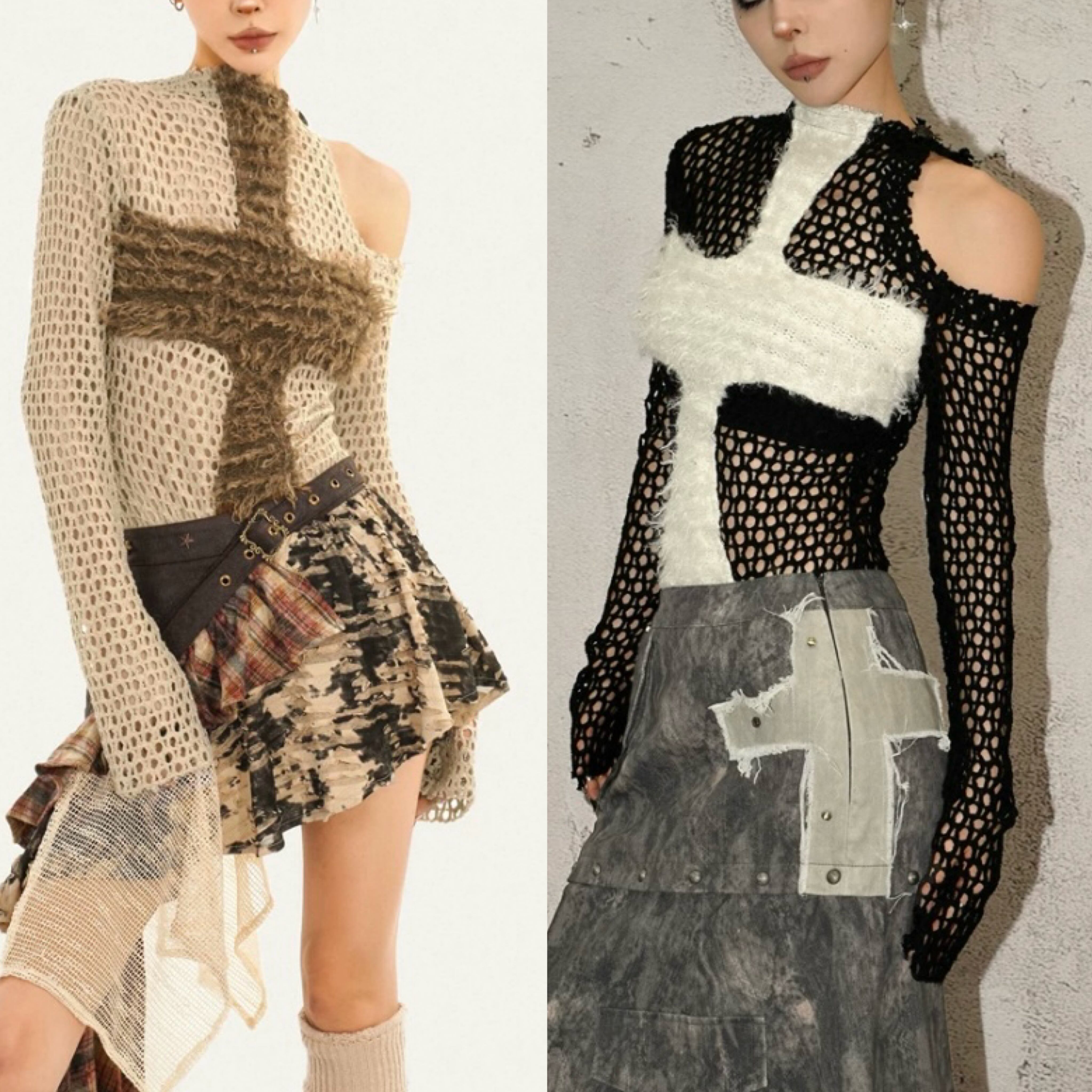 ベージュ クロス あみあみ、メッシュ、黒 ロック セクシー Tシャツ ダンス クラブ オフショルダー、トップス ブラウス、カーディガン、ダンス、原宿、渋谷 ギャル ロック、パンク セクシー
