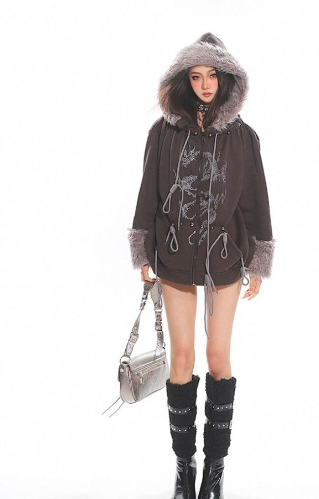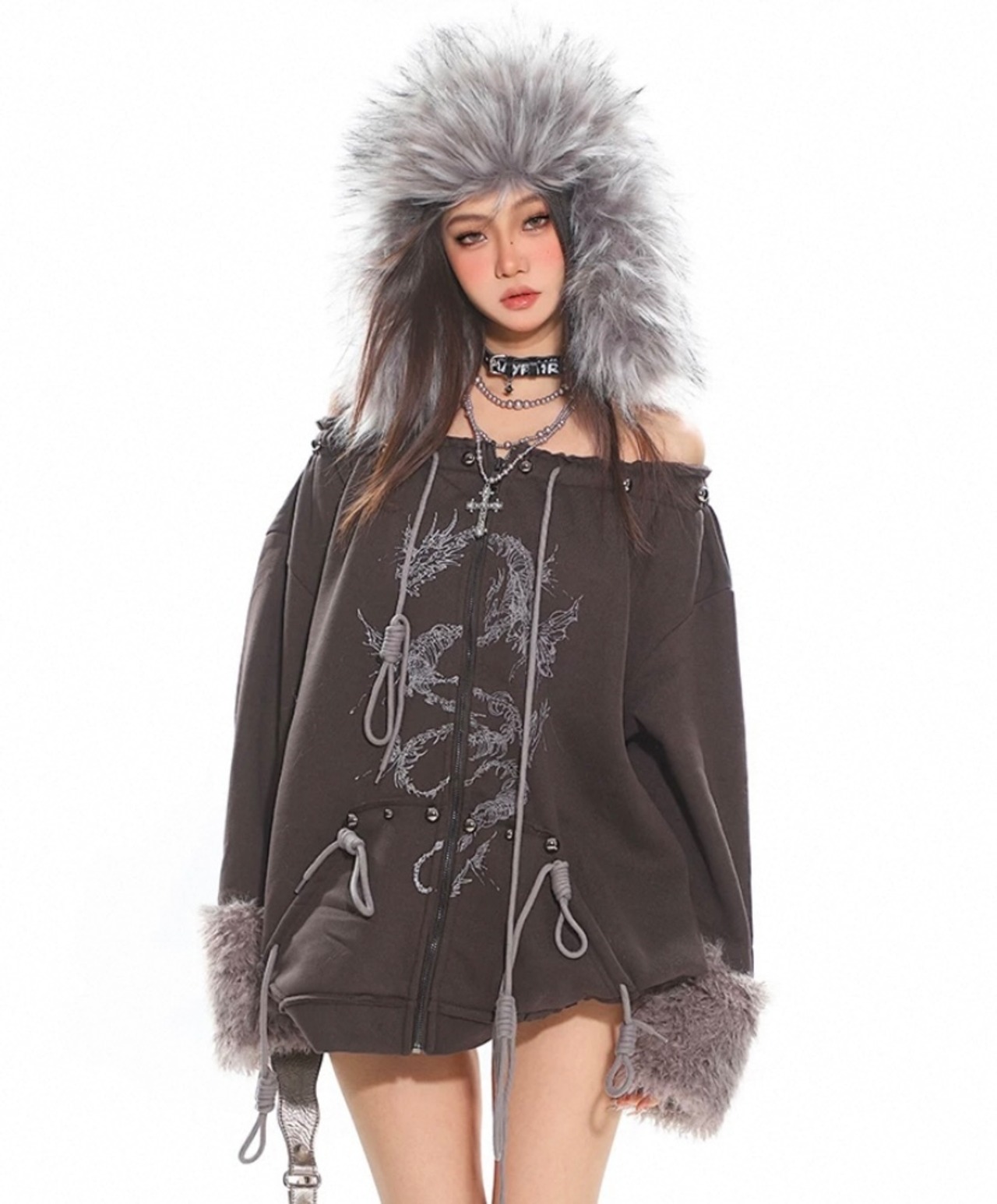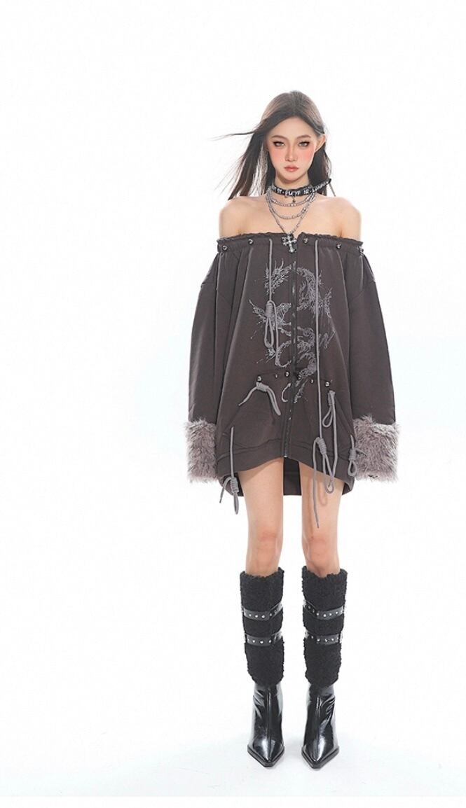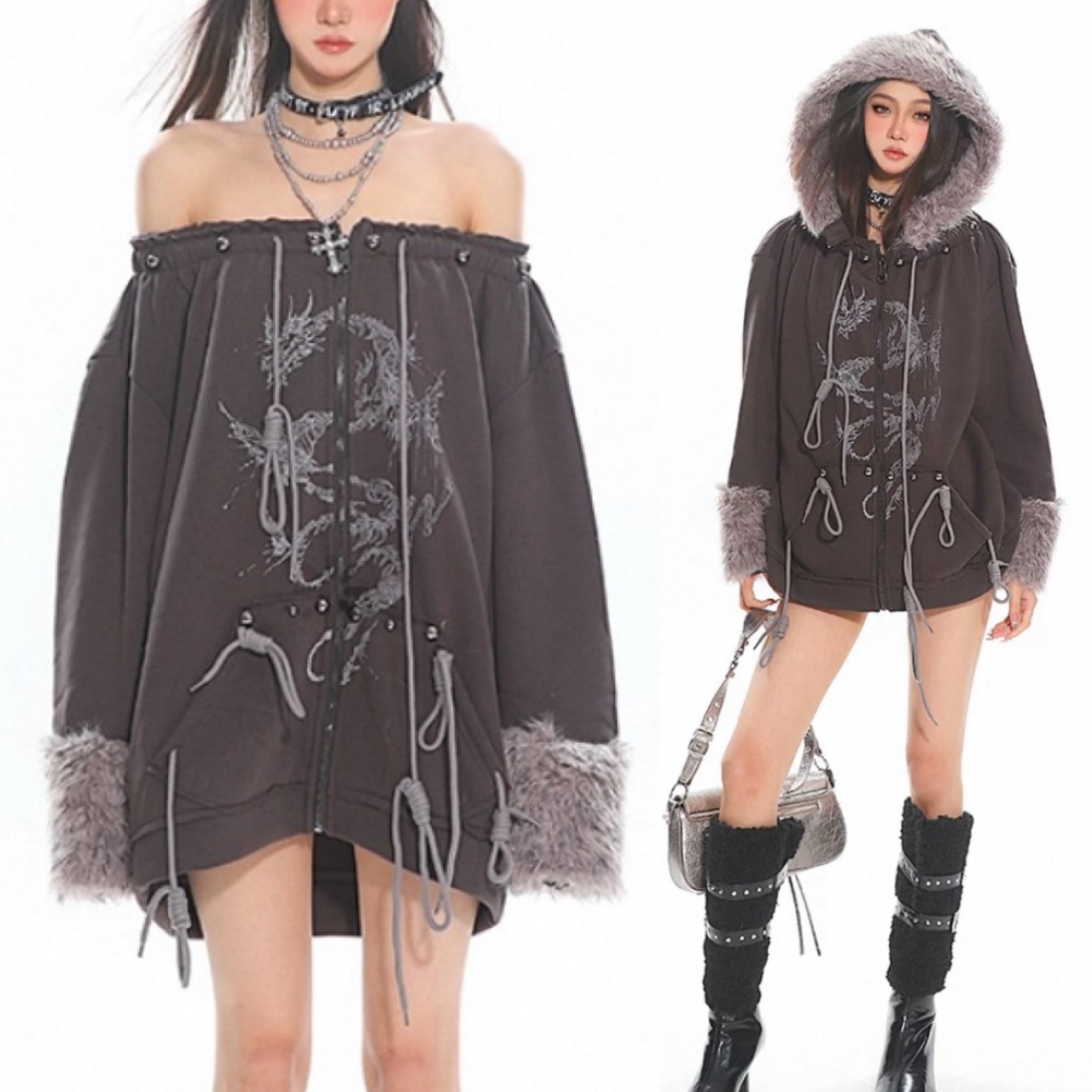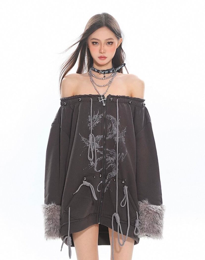 ★サイズ 【3way】ジャケット カーディガン パーカー スウェット グレー、黒 フード パーカー オフショルダー ワンピース ストリート 原宿、渋谷 ギャル Y2K ダンス クラブ アウター カーディガン