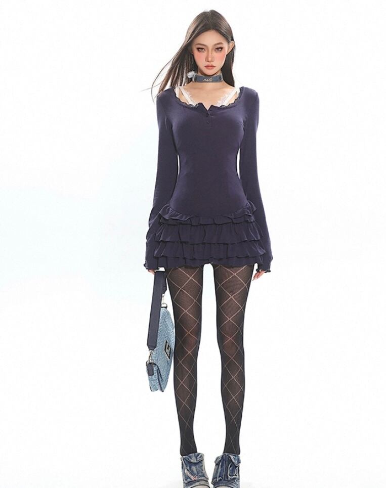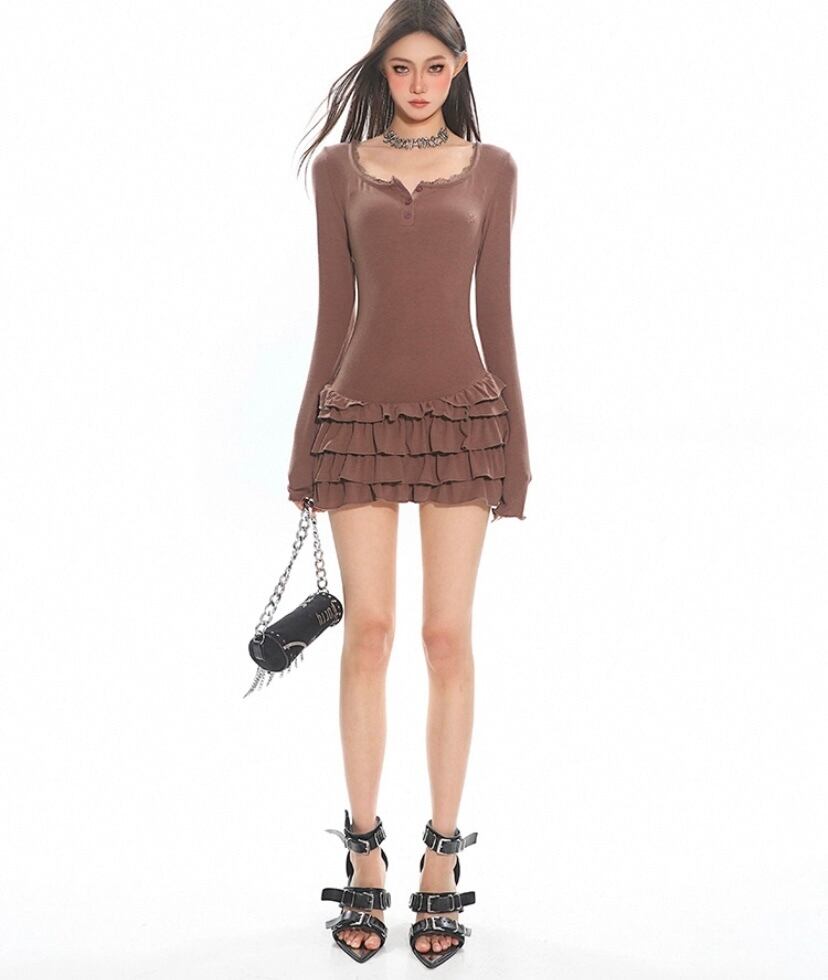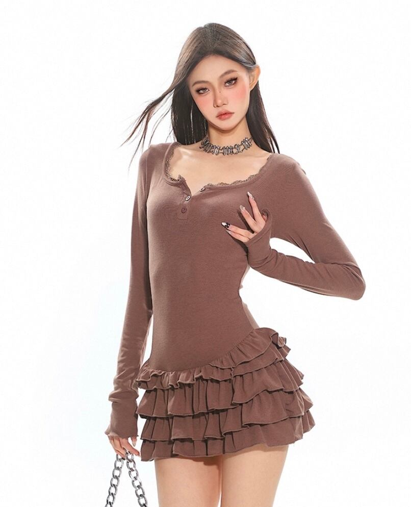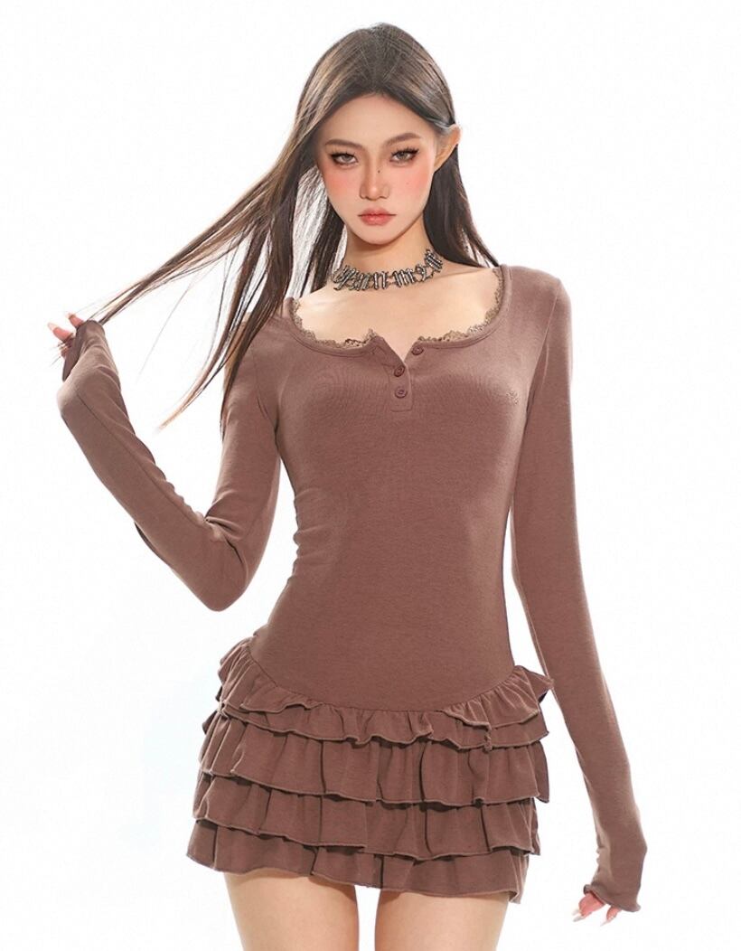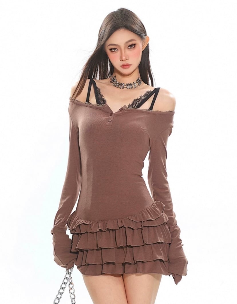 【2way】ワンピース ベージュ、ネイビー オフショルダー、茶色 トップス Tシャツ ブラウス ロングTシャツ フリル リボン ミニスカート カジュアル スウェット ストリート、渋谷 原宿、ダンス クラブ Y2K ギャル