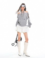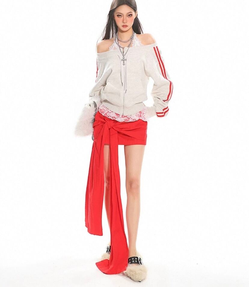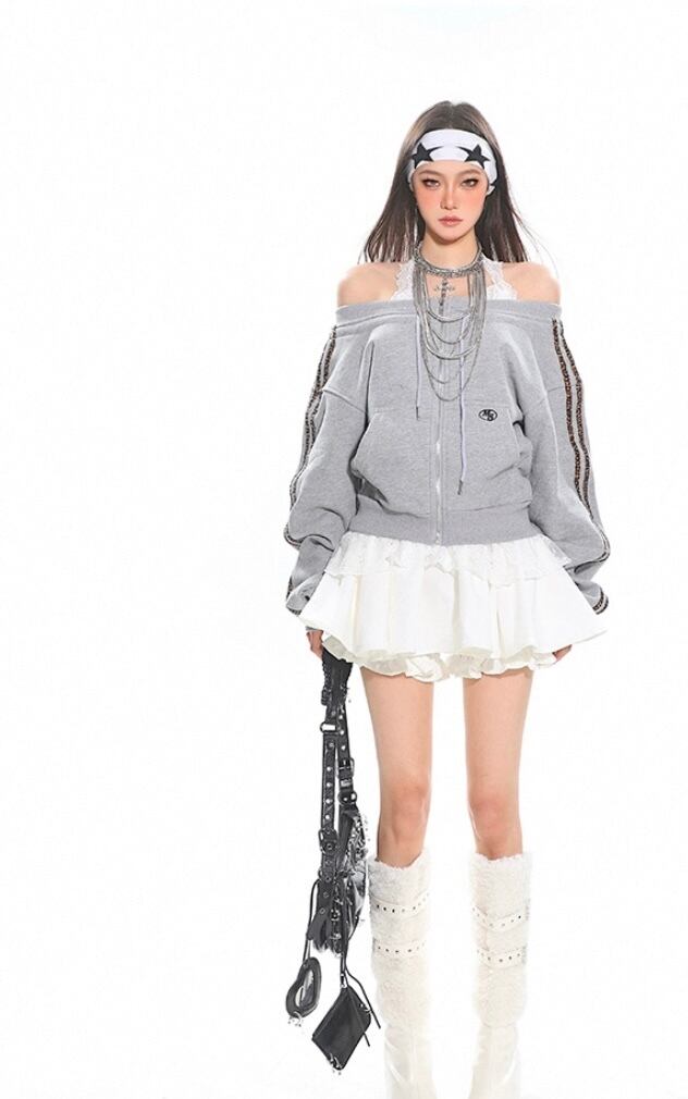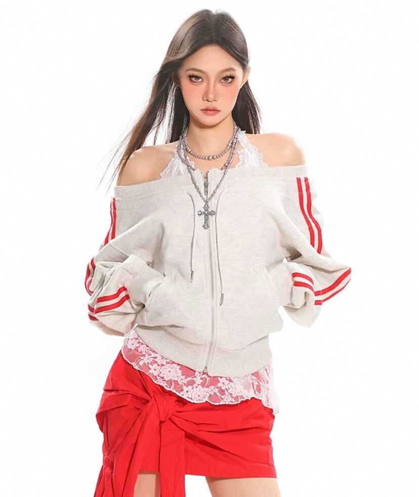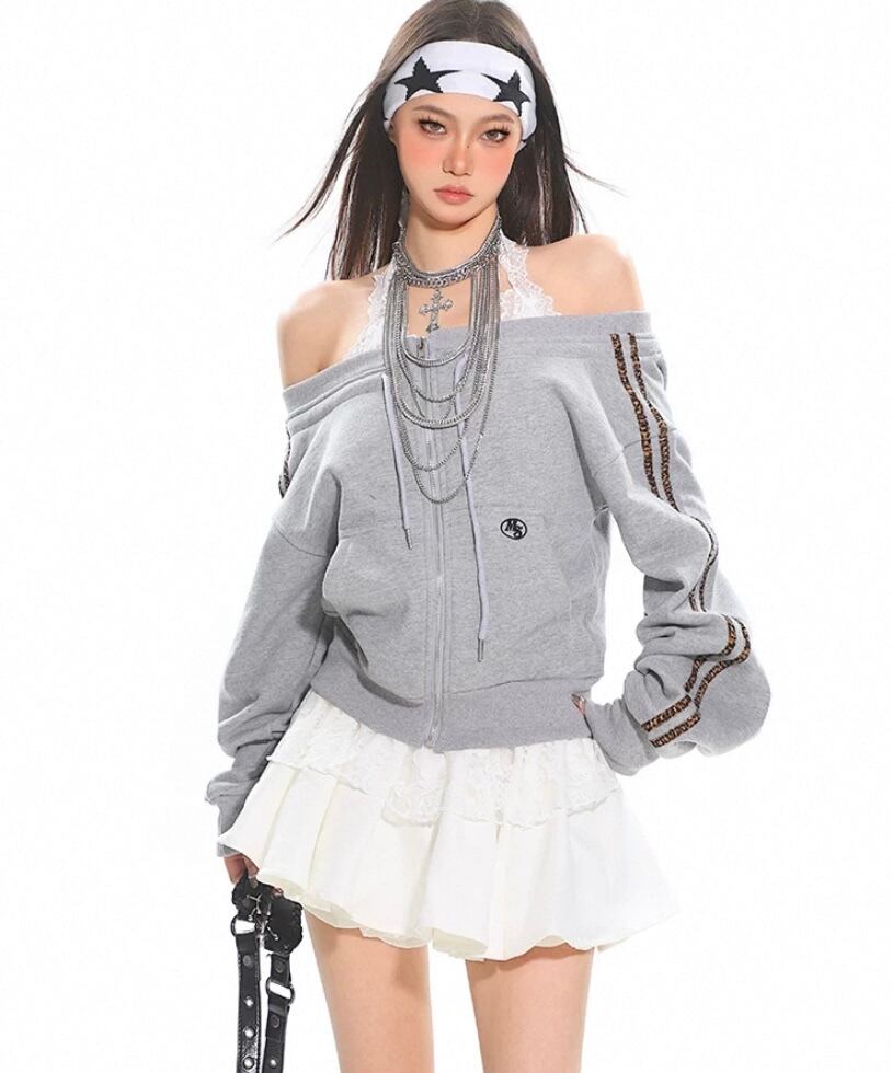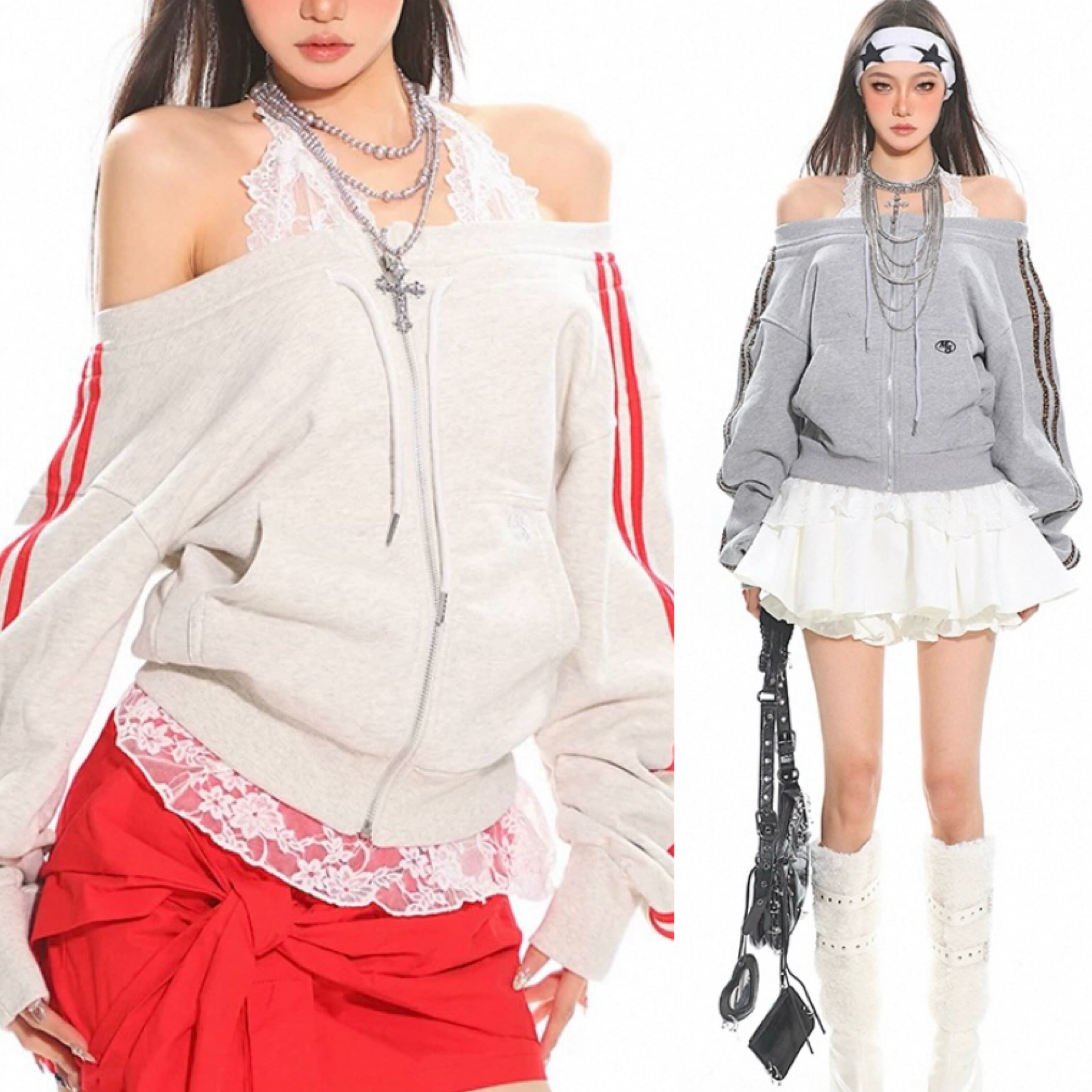 スウェット パーカー トレーナー オフショルダー ストリート テニス スポーツ 赤 グレー ギャル ストリート 原宿、ダンス クラブ、Y2K カジュアル アウター ジャケット コート カーディガン トップ
