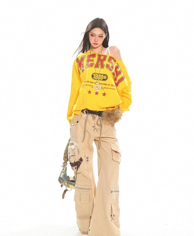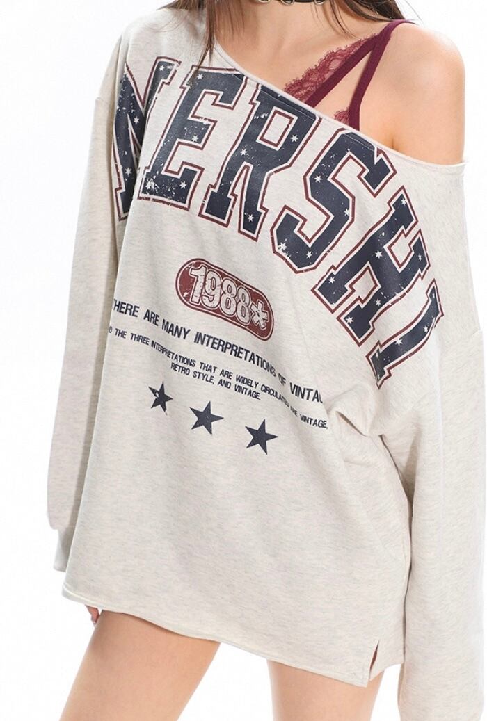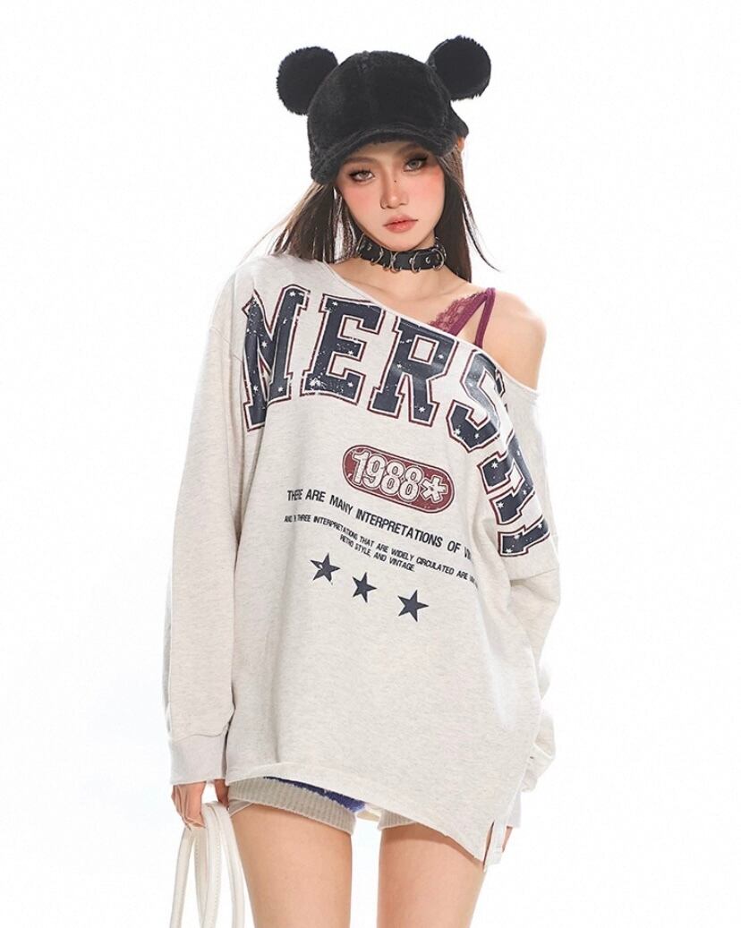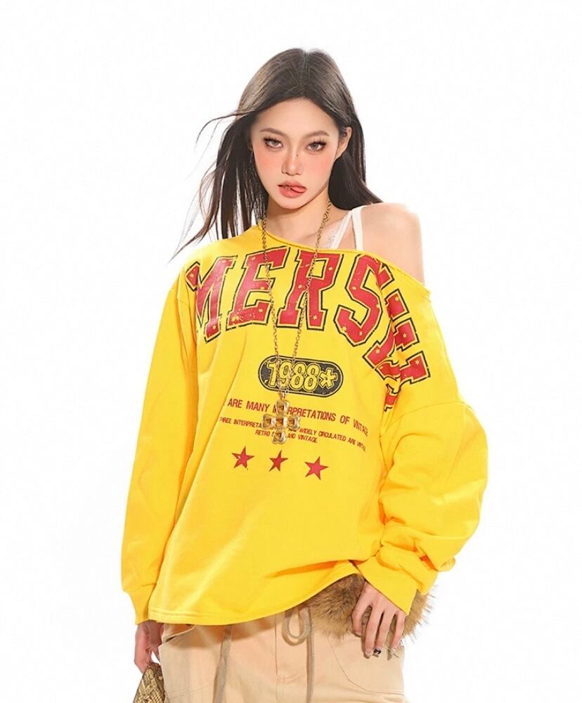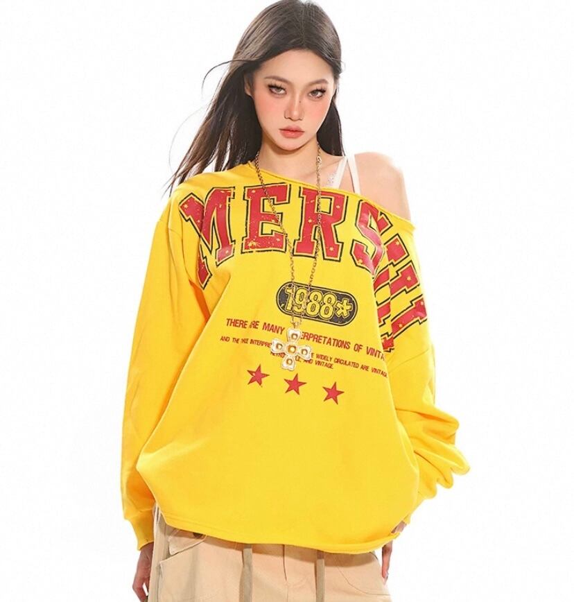オフショルダー ワンピース トレーナー、グレー アイボリー アメリカ スクールガール 黄色 トップス スウェット パーカー カジュアル ギャル 1988 スウェット トップス ストリート 渋谷 原宿 カジュアル