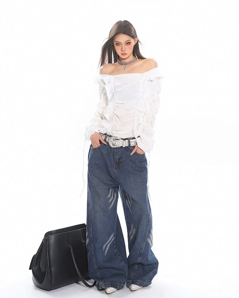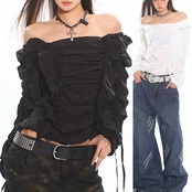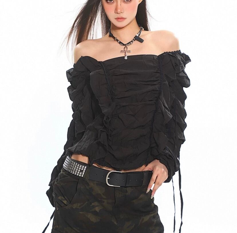 黒白、ブラック、ホワイト、シンプル、オフショルダー ダンス クラブ トップス、ブラウス、シャツ、ショート ストリート、カジュアル、渋谷 原宿、お嬢様、ギャル フリル リボン 無地