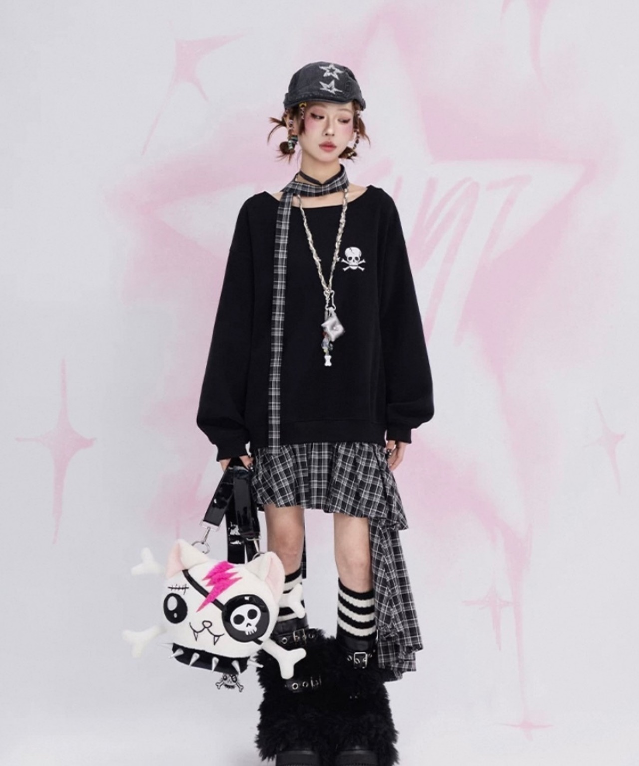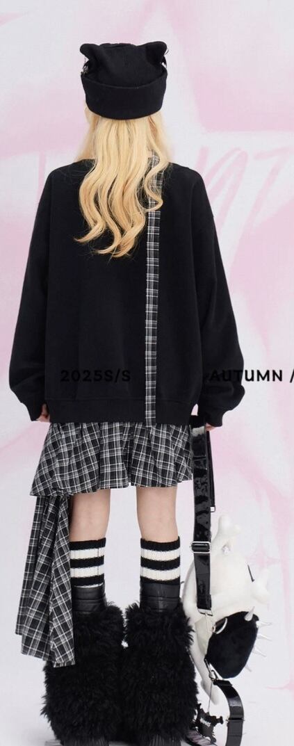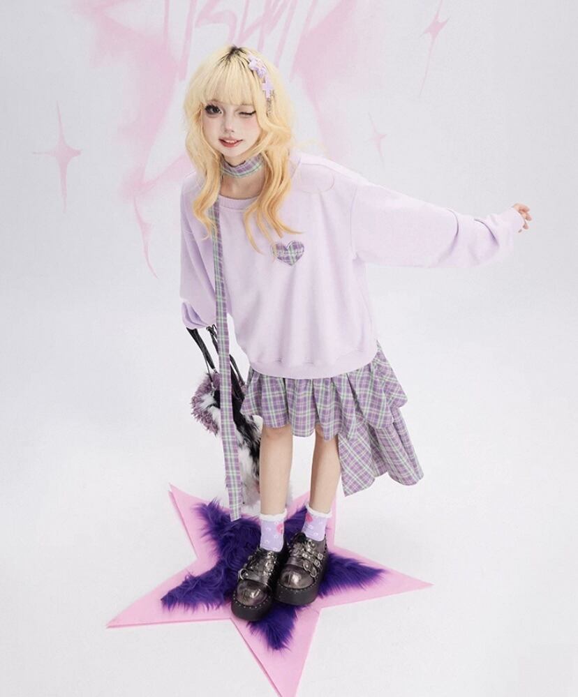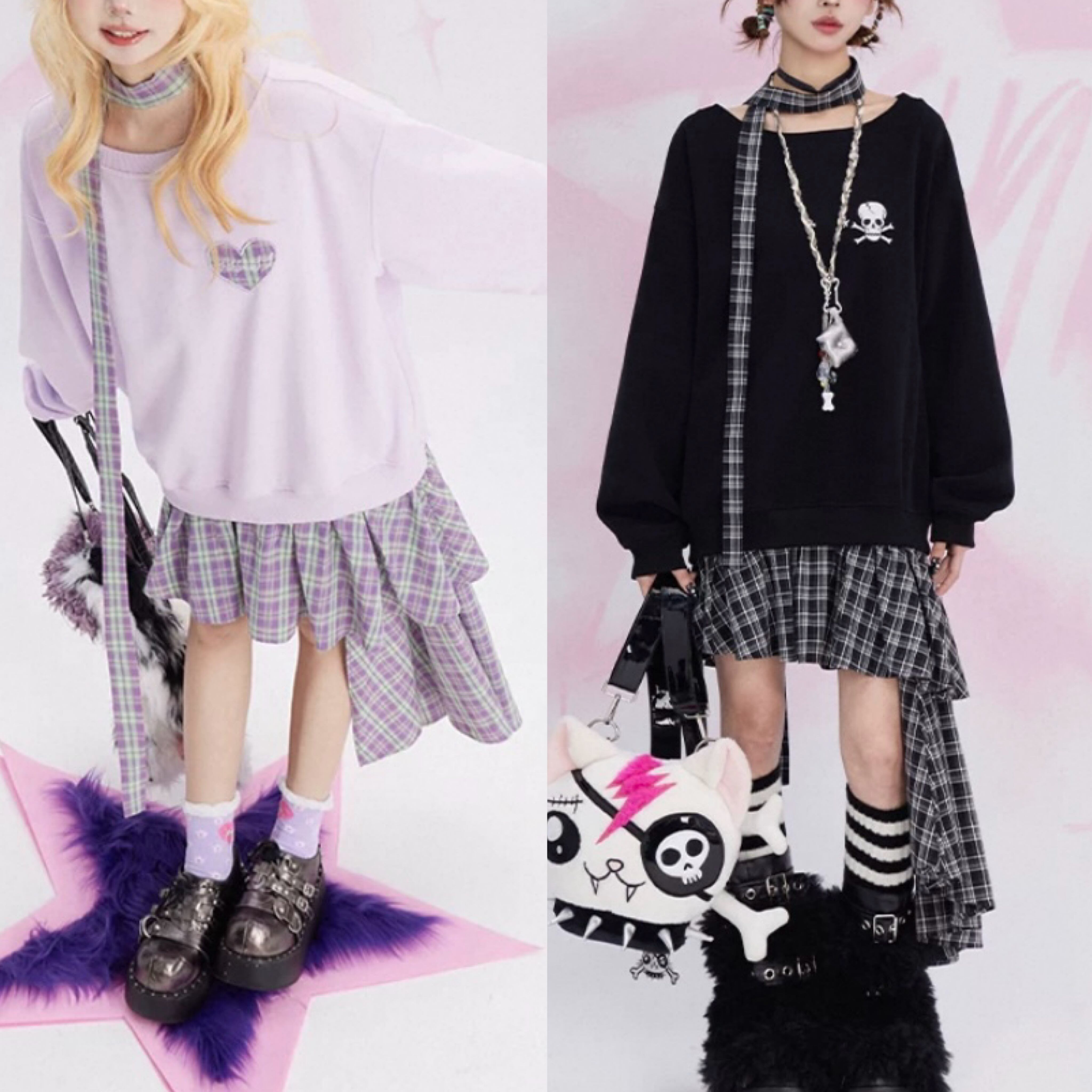 スウェット ワンピース、紫 黒 トップス トレーナー ミニスカート を チェック。かわいい スクール ガールズ 。ギャルガーリー、原宿 渋谷 ミニスカート カジュアル