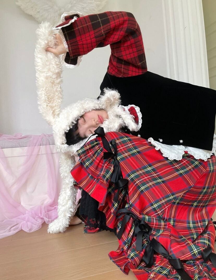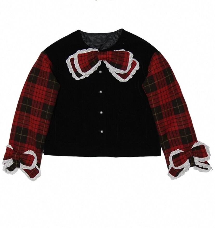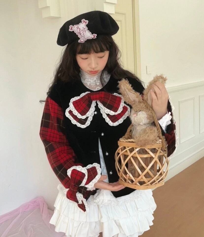 赤 リボン チェック ジャケット コート、アウター 丸襟 カーディガン かわいい 原宿 姫 ロリータ ガーリー ブルゾン イギリス 姫
