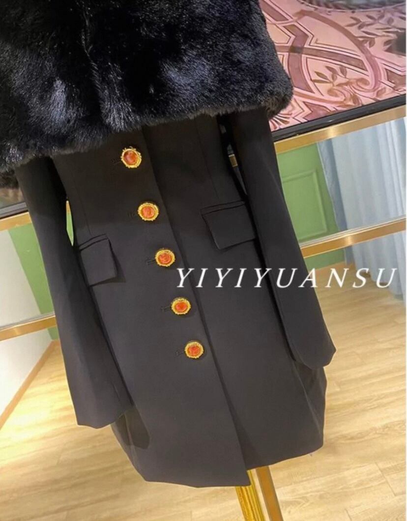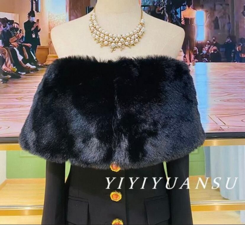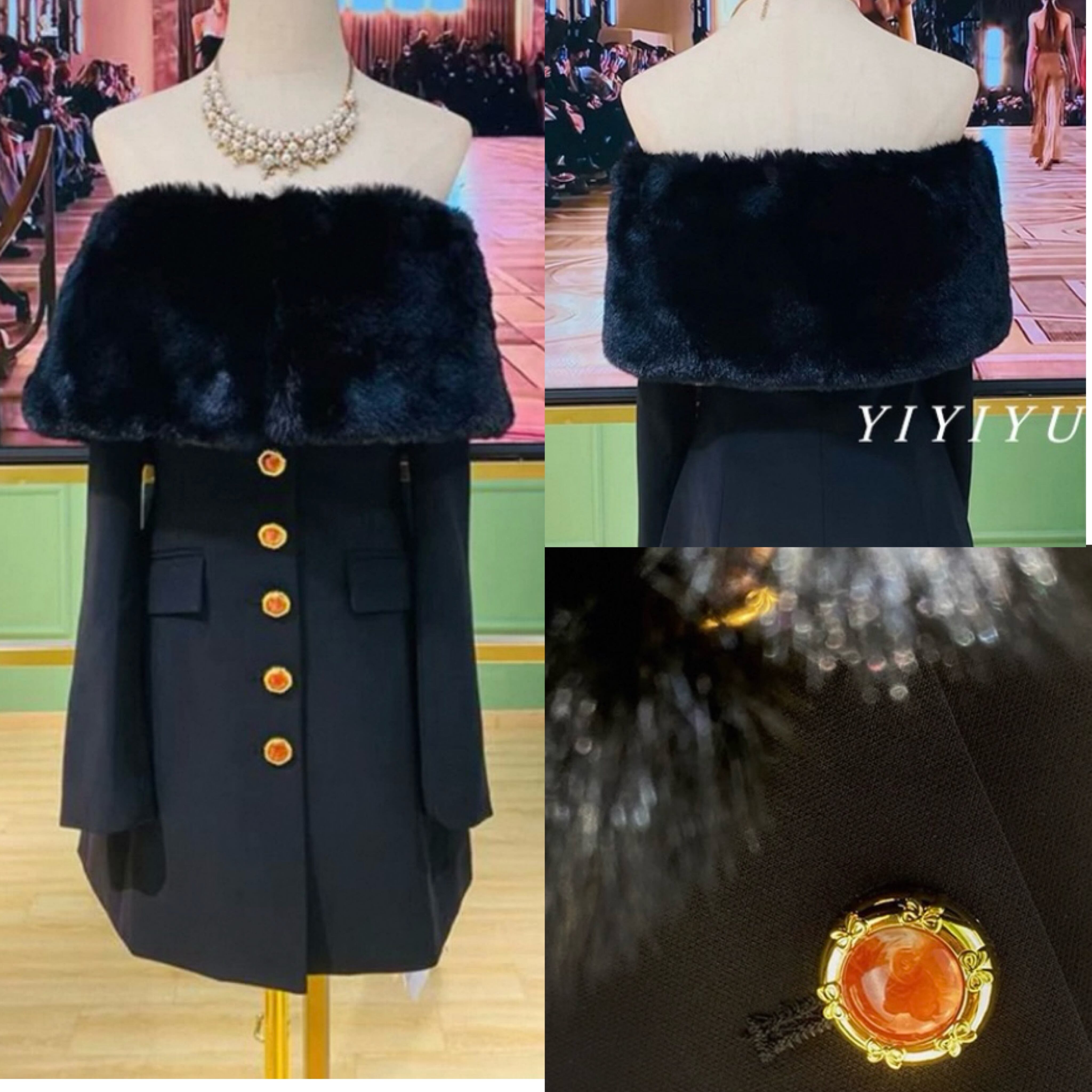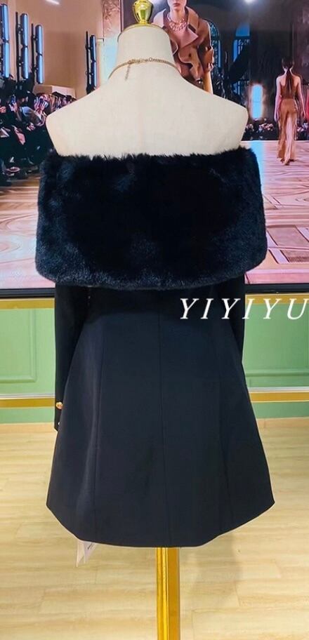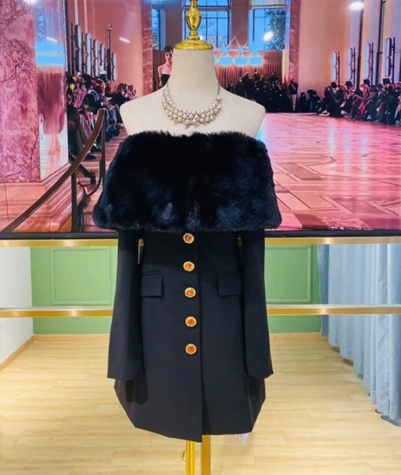 ファー オフショルダー ドレス、黒 ブラック ワンピース ドレス、エレガント ジャケット、ピンク ゴールドボタン ミニスカート タイト、エレガント、銀座 お嬢様 表参道