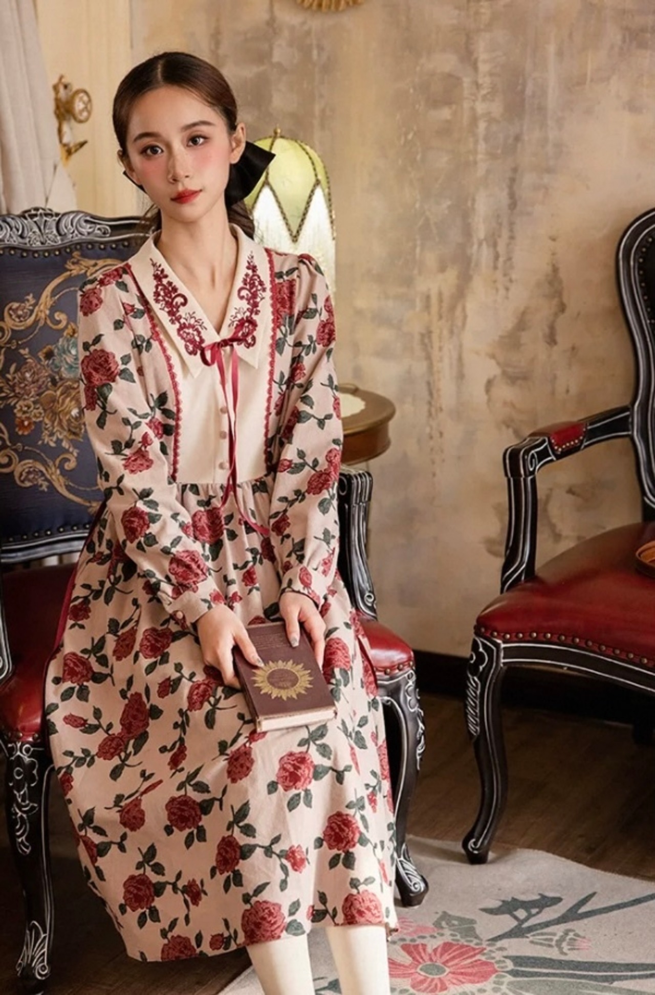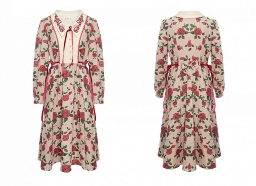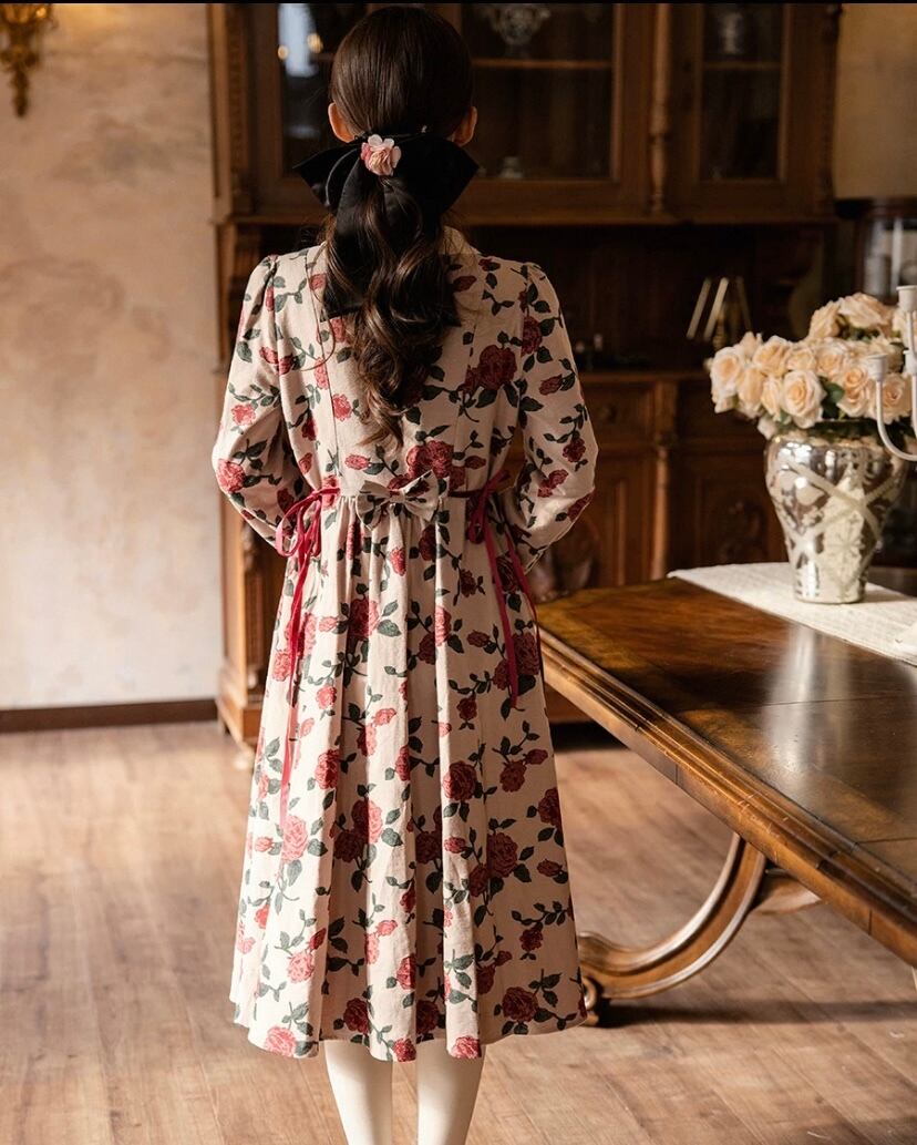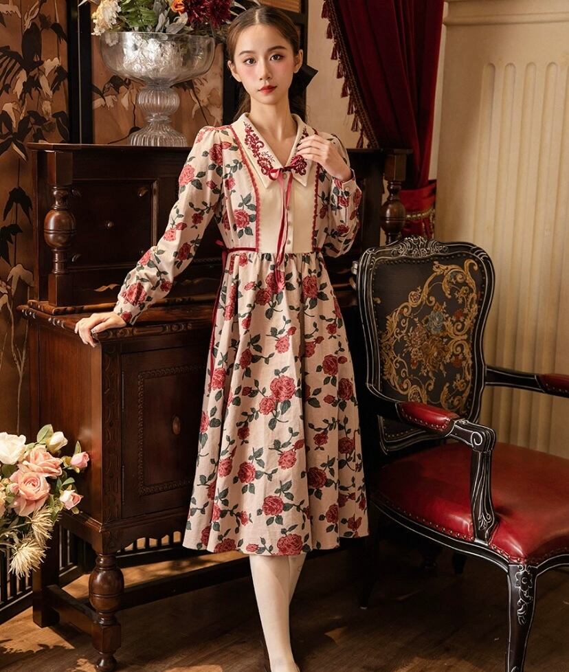 赤 XL バラ フラワー ブラウス リボン レトロ クラシック、ベージュ、かわいい 姫 漫画 ガーリー、原宿 レトロ お嬢様