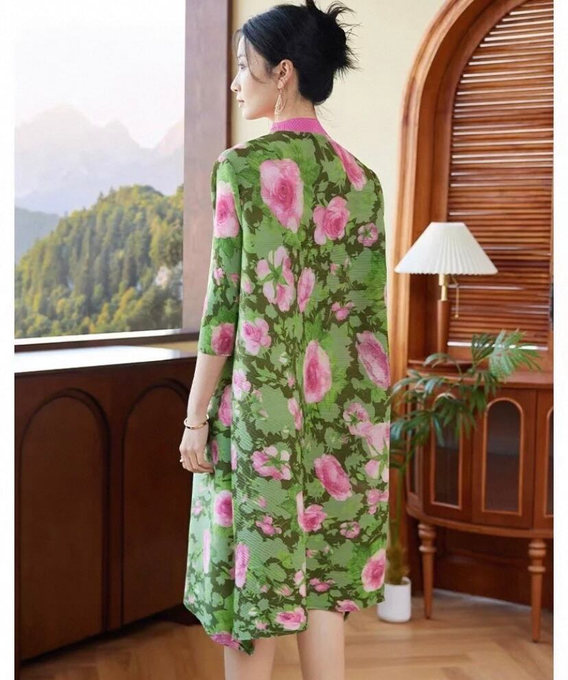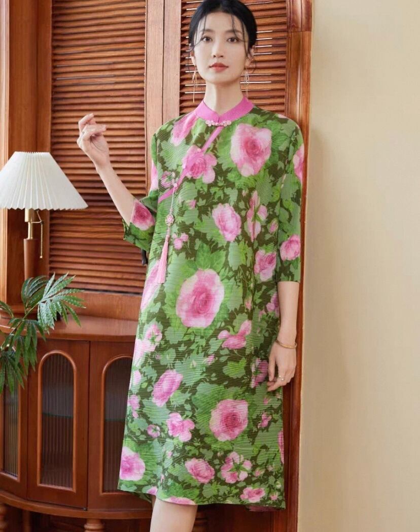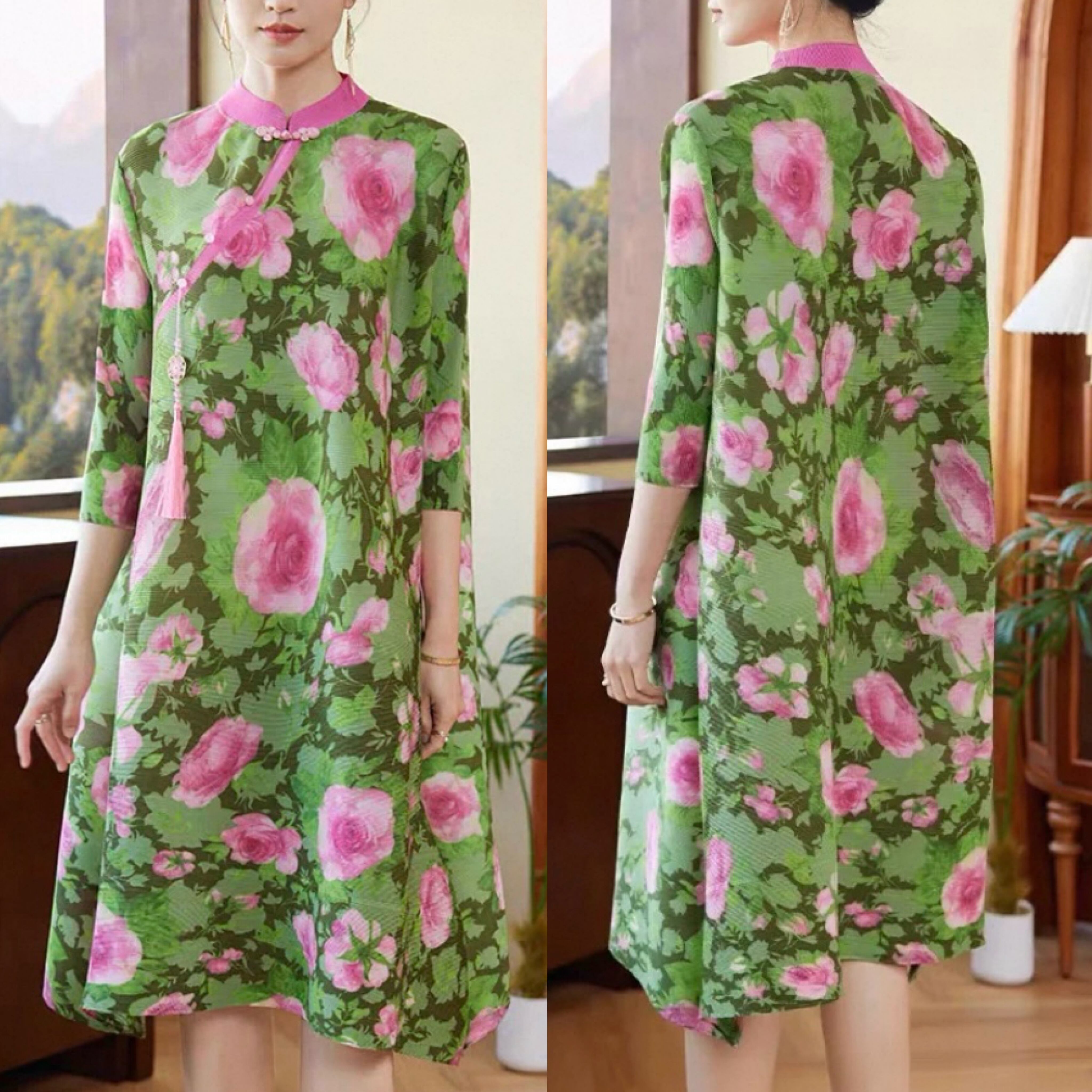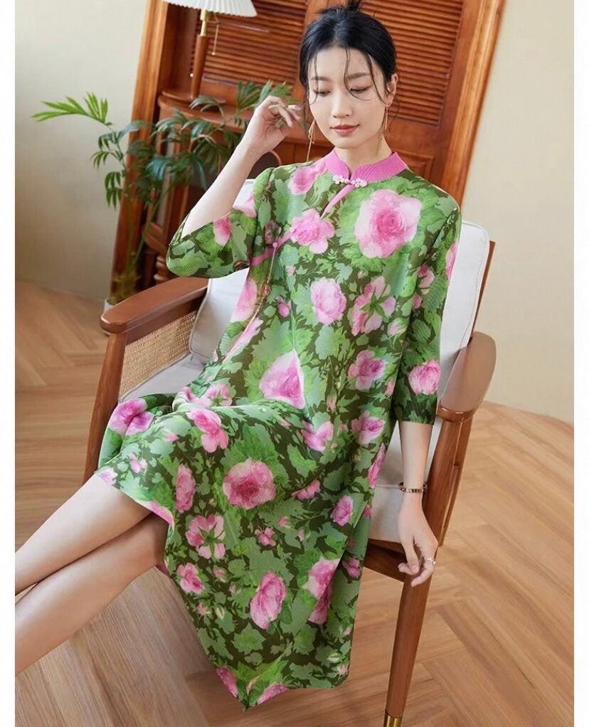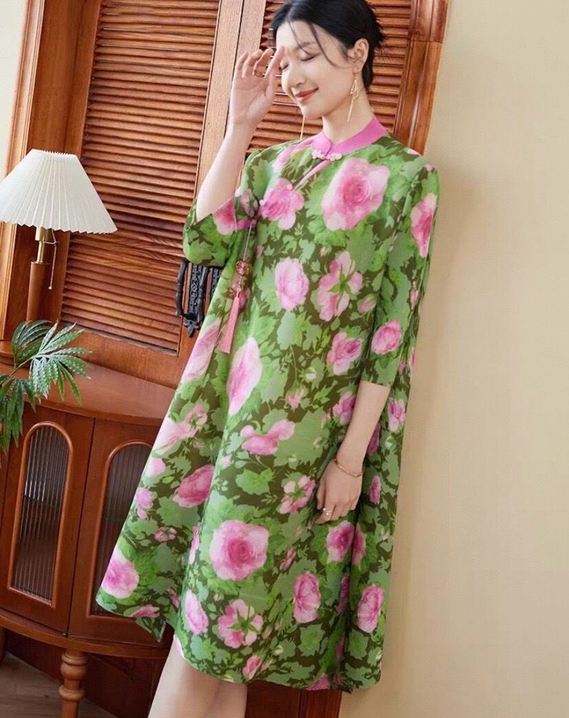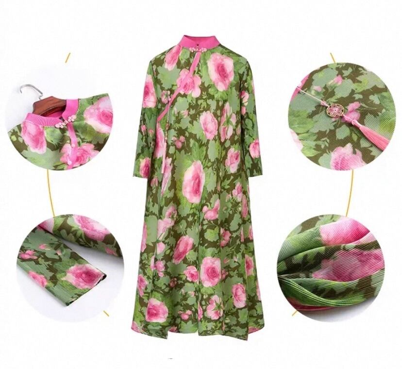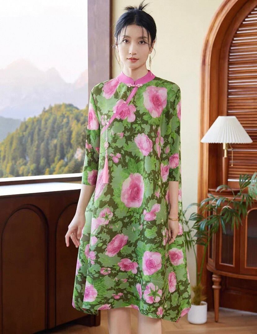 緑、ピンク、花柄、フラワー総柄、エレガント ブラウス、チャイナ ドレス ワンピース、チュニック ブラウス、かわいい エレガント マダム