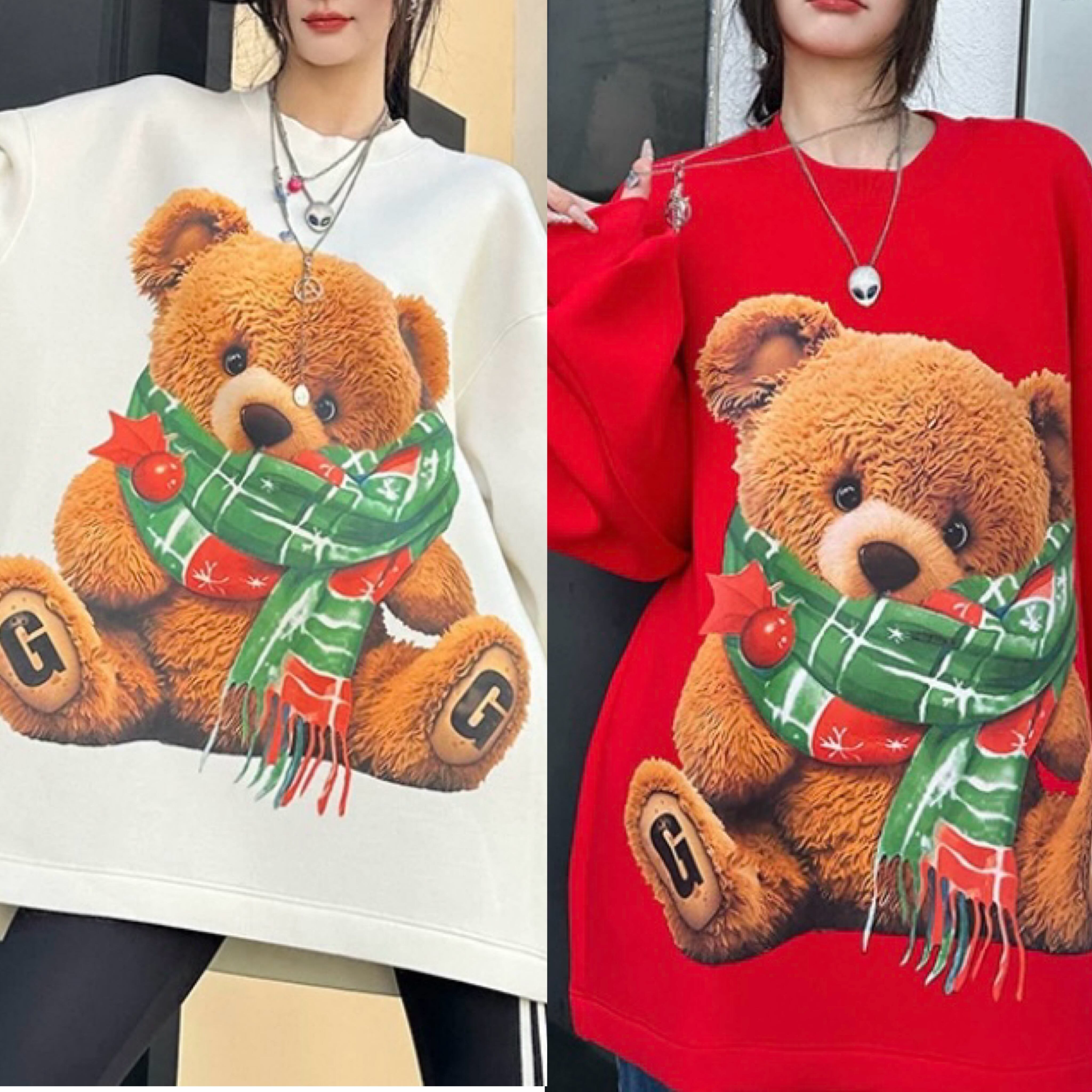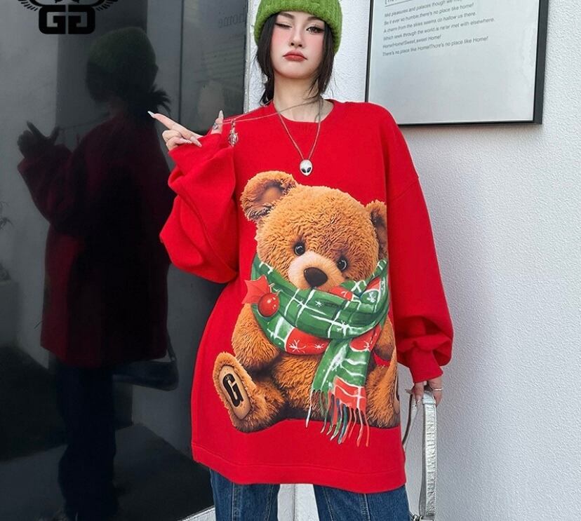 トレーナー 熊、マフラー、茶色、赤 白