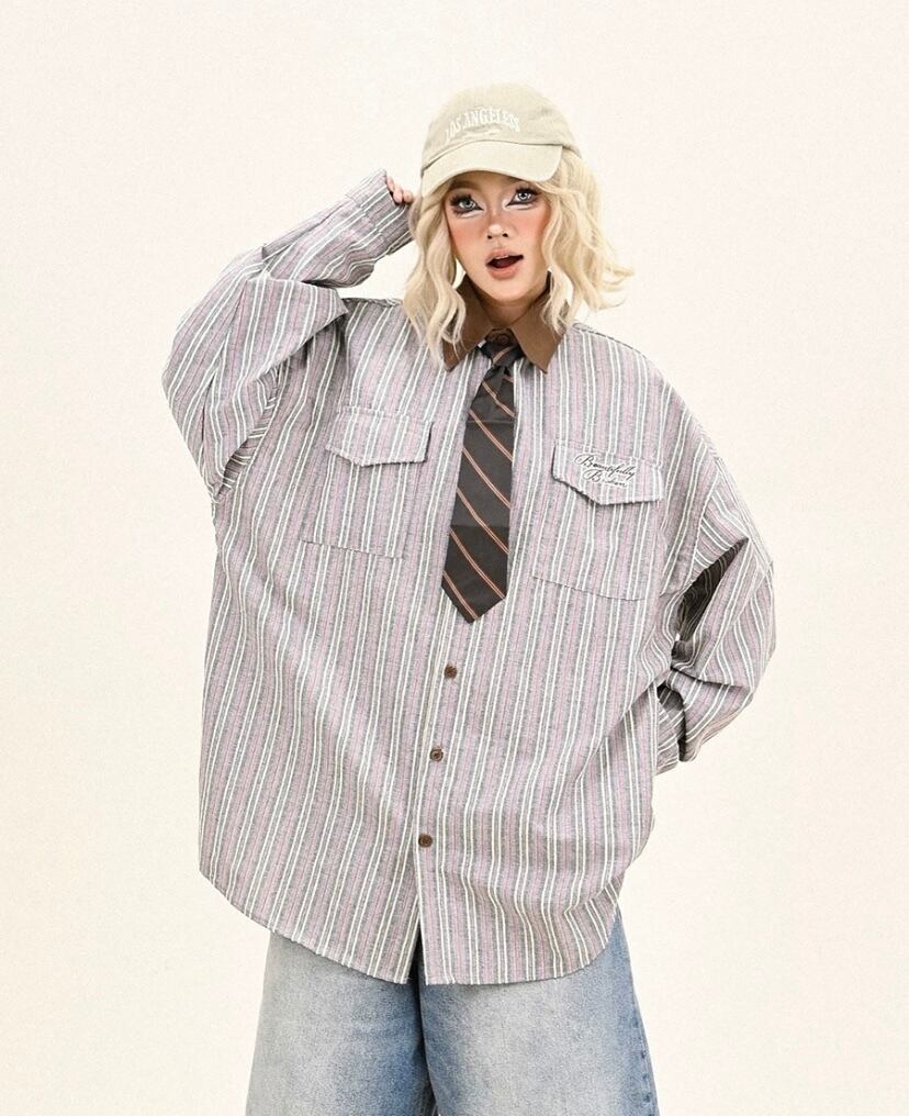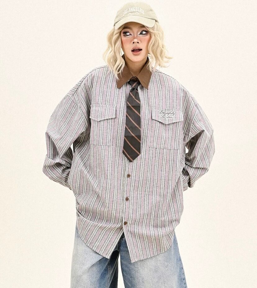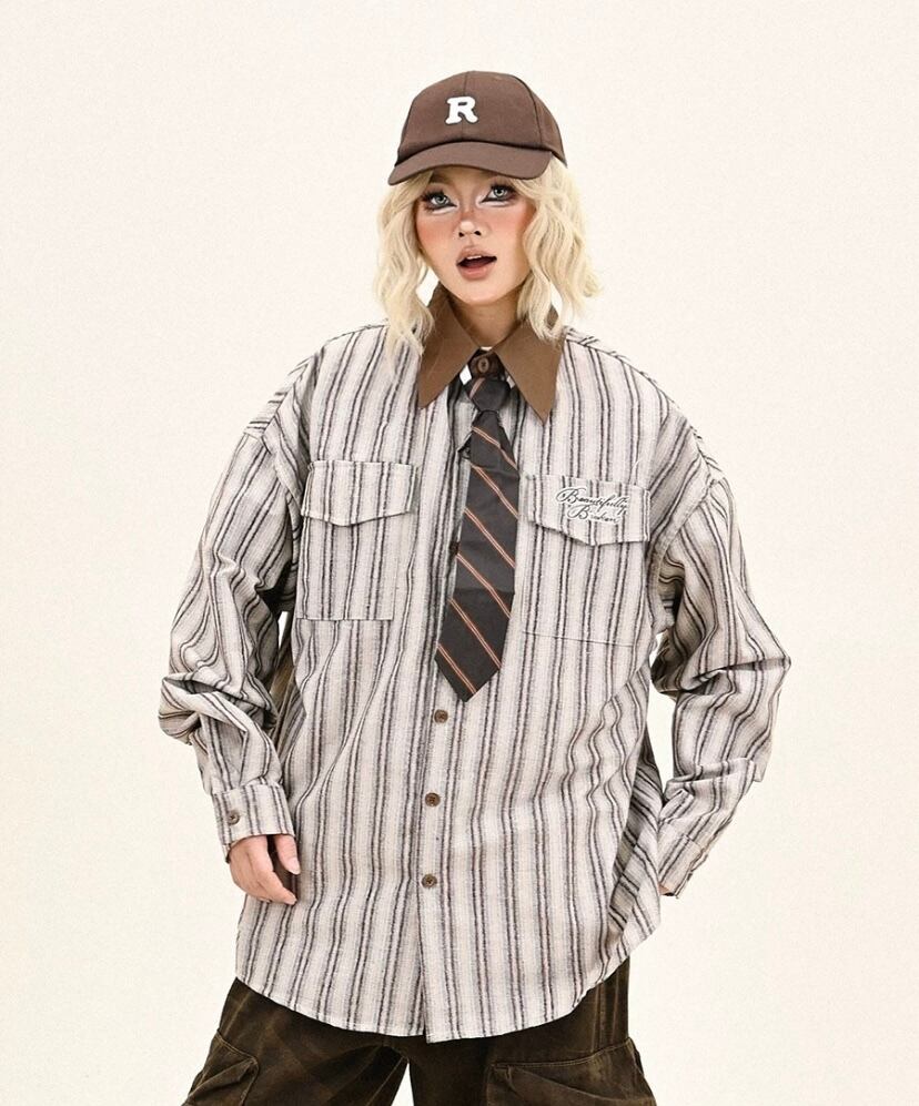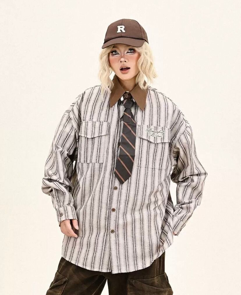 ボーダー チェック、茶色、ネクタイ、サラリーマン おじさん、風 シャツ、ブラウス メンズライク