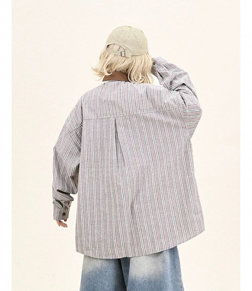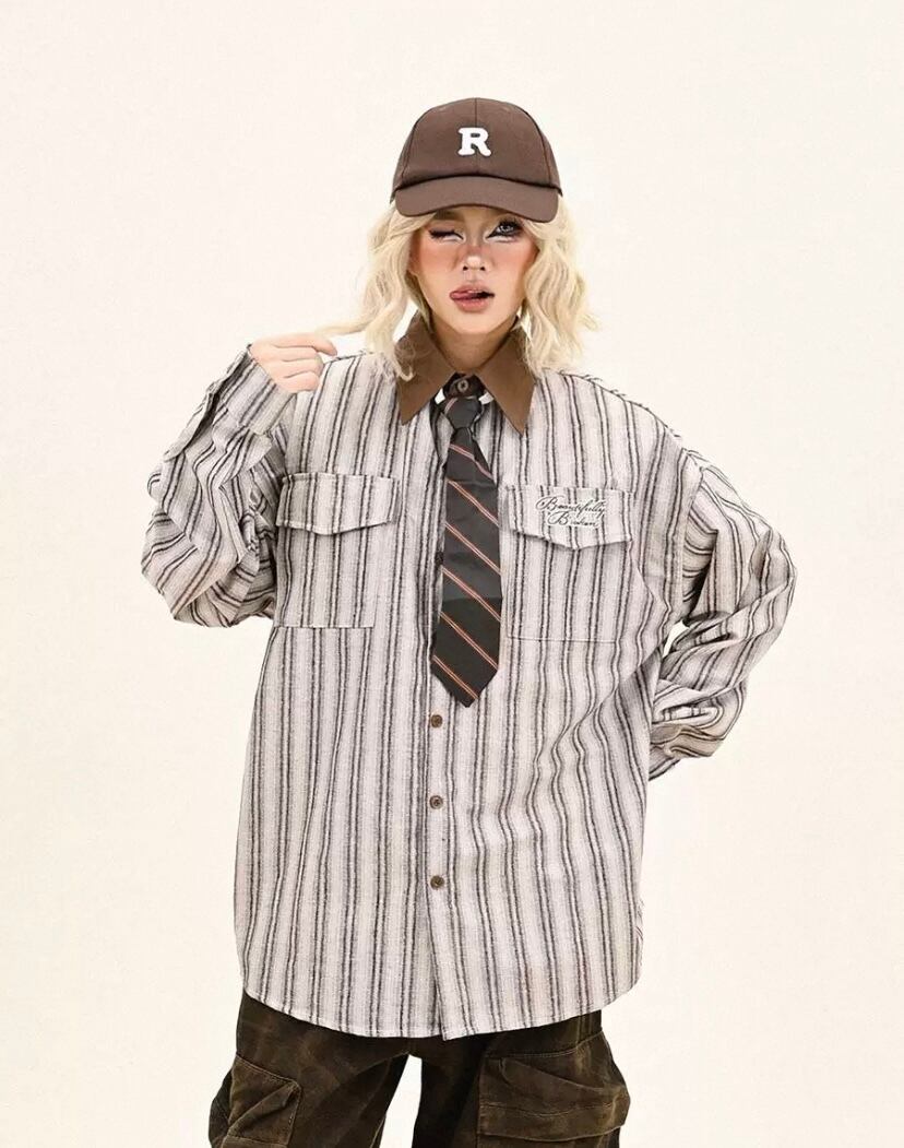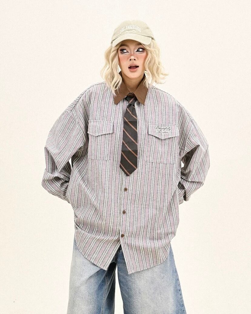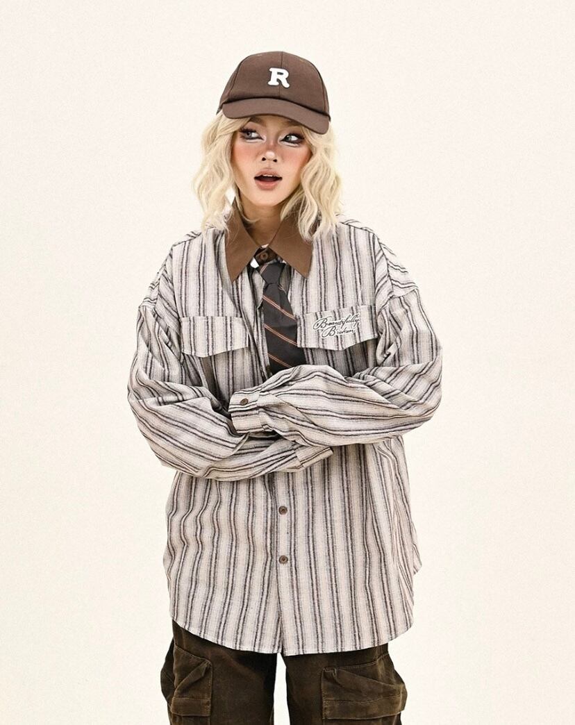ボーダー チェック、茶色、ネクタイ、サラリーマン おじさん、風 シャツ、ブラウス メンズライク