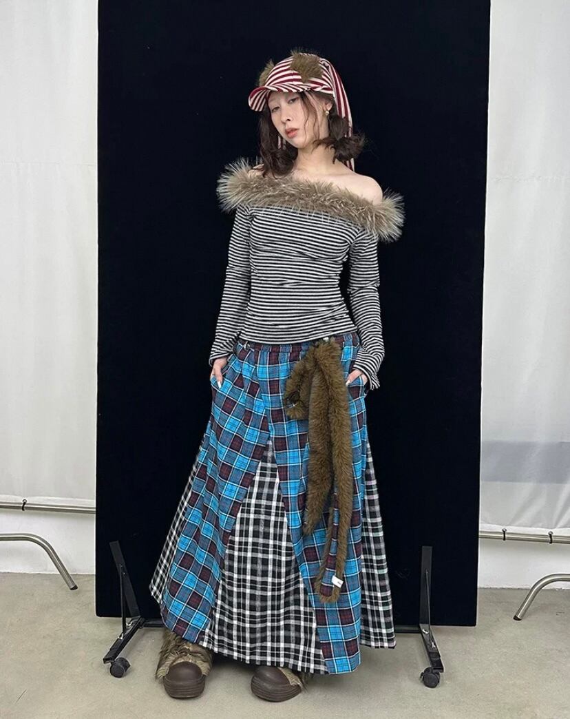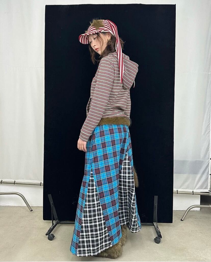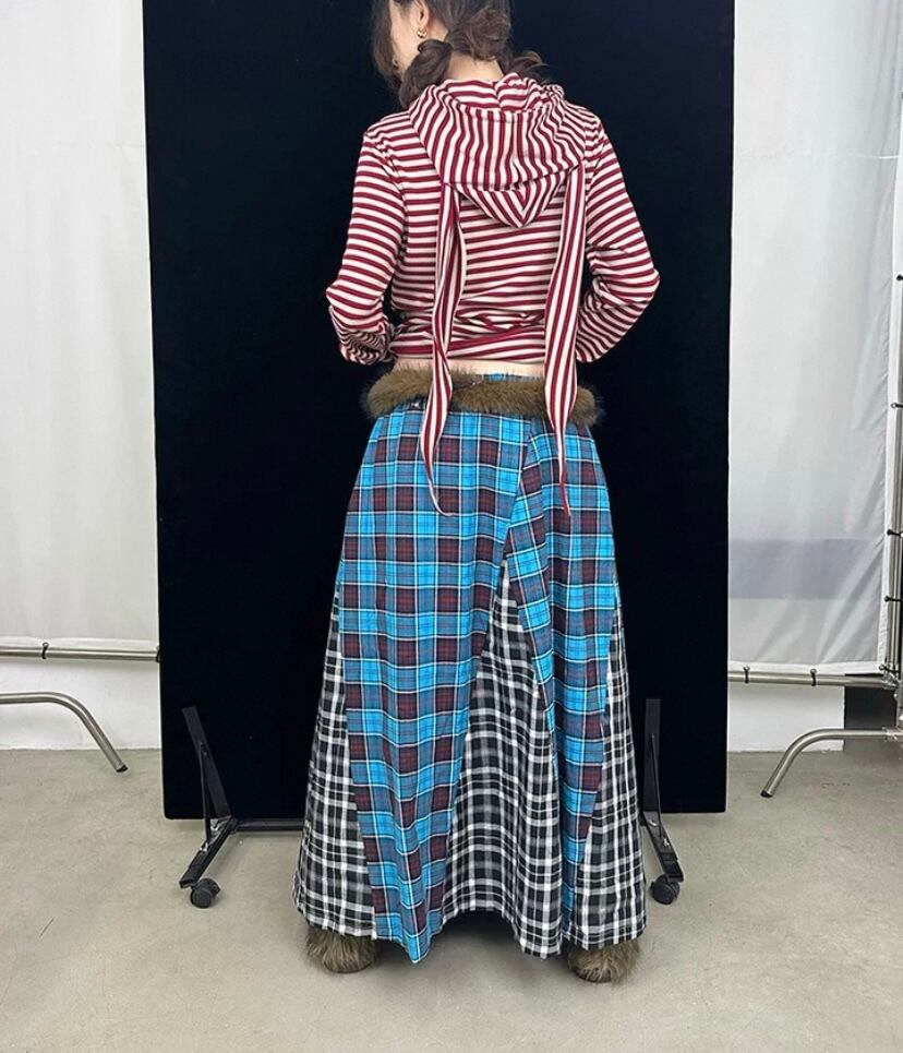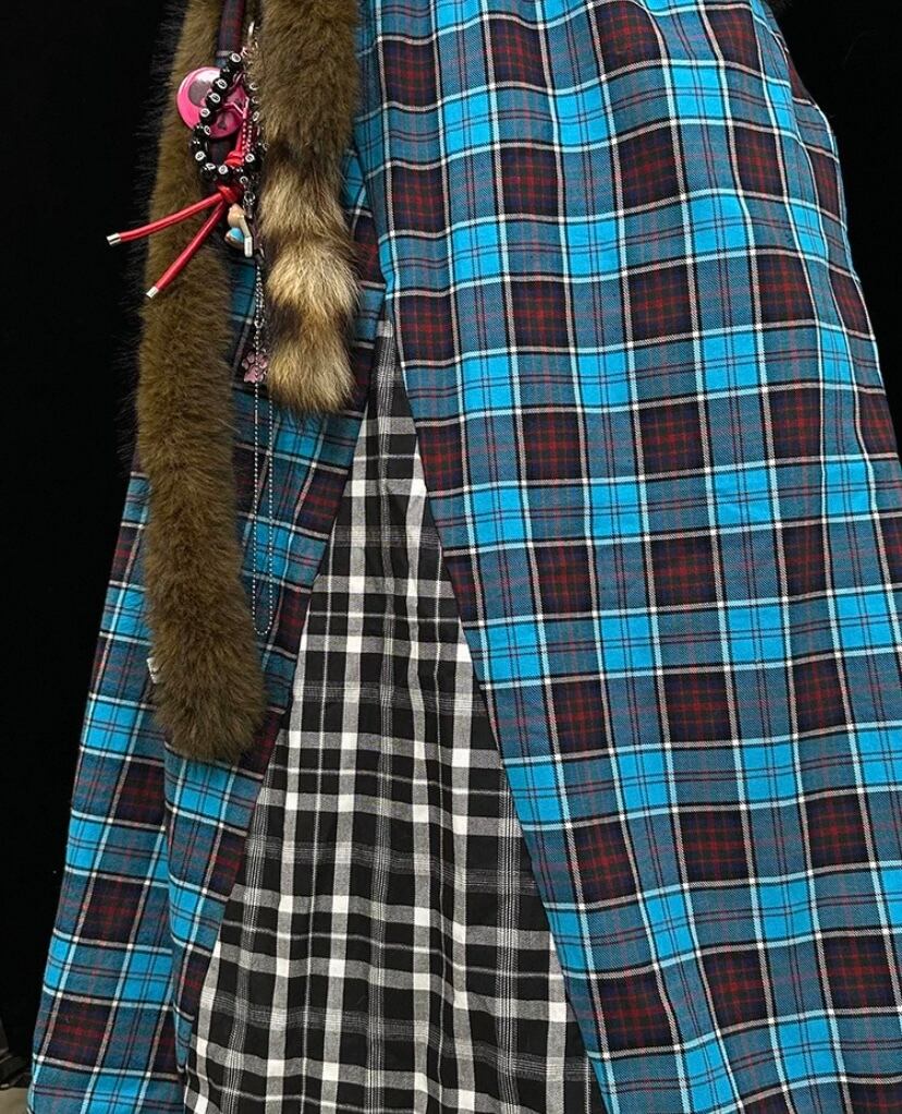 茶色、パッチワーク、水色 チェック、ボトムス、ロングスカート、マキシ 古着、ネルシャツ、原宿