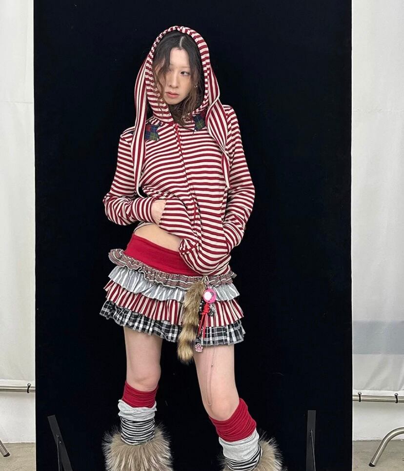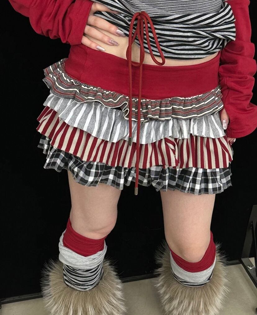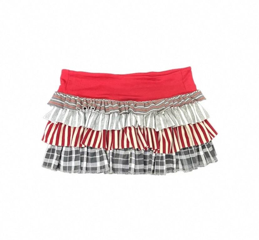 ミニスカート ボトムス チェック、パッチワーク、赤 ボーダー、フレア フレア フリル リボン Y2K ミニスカート ダンス